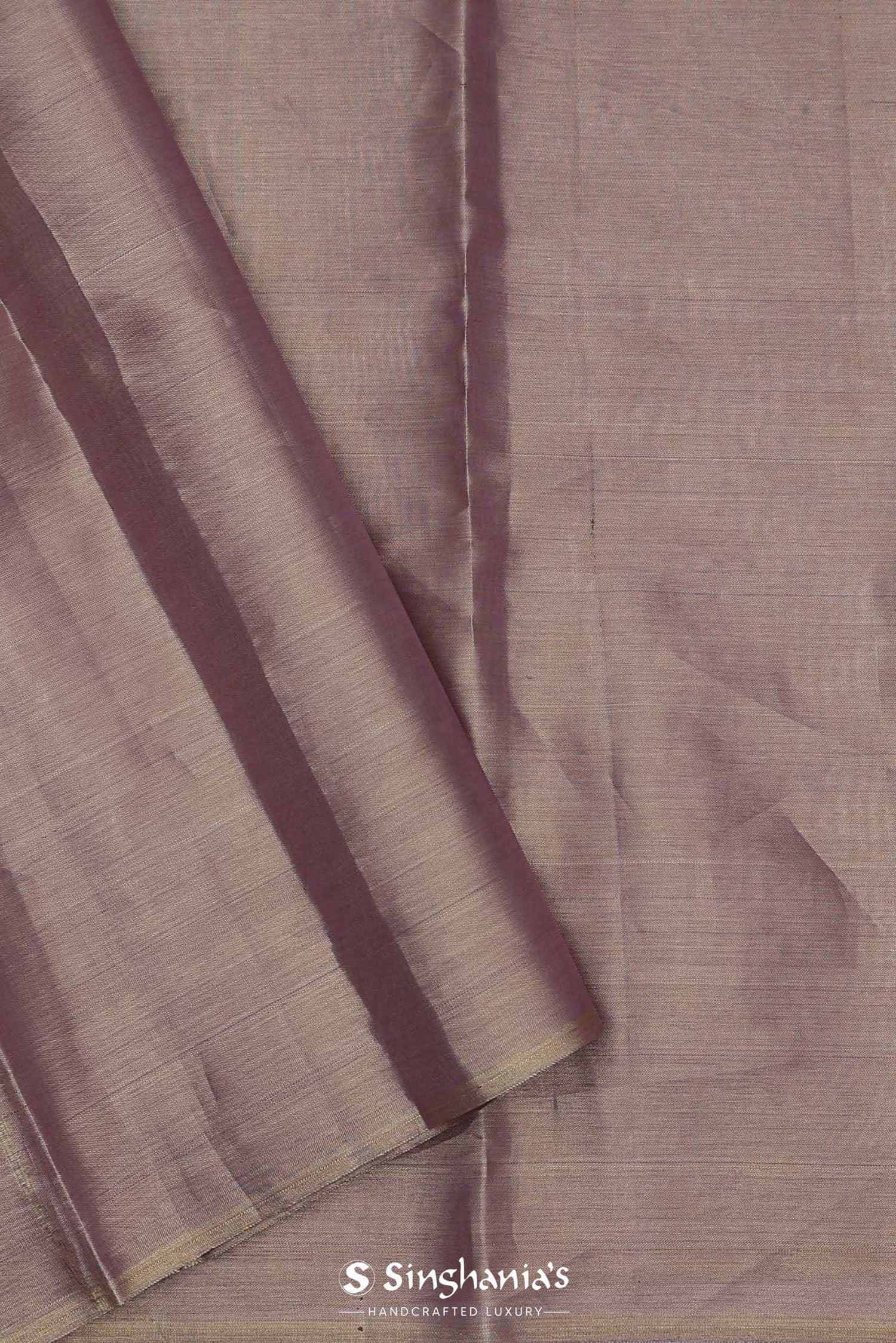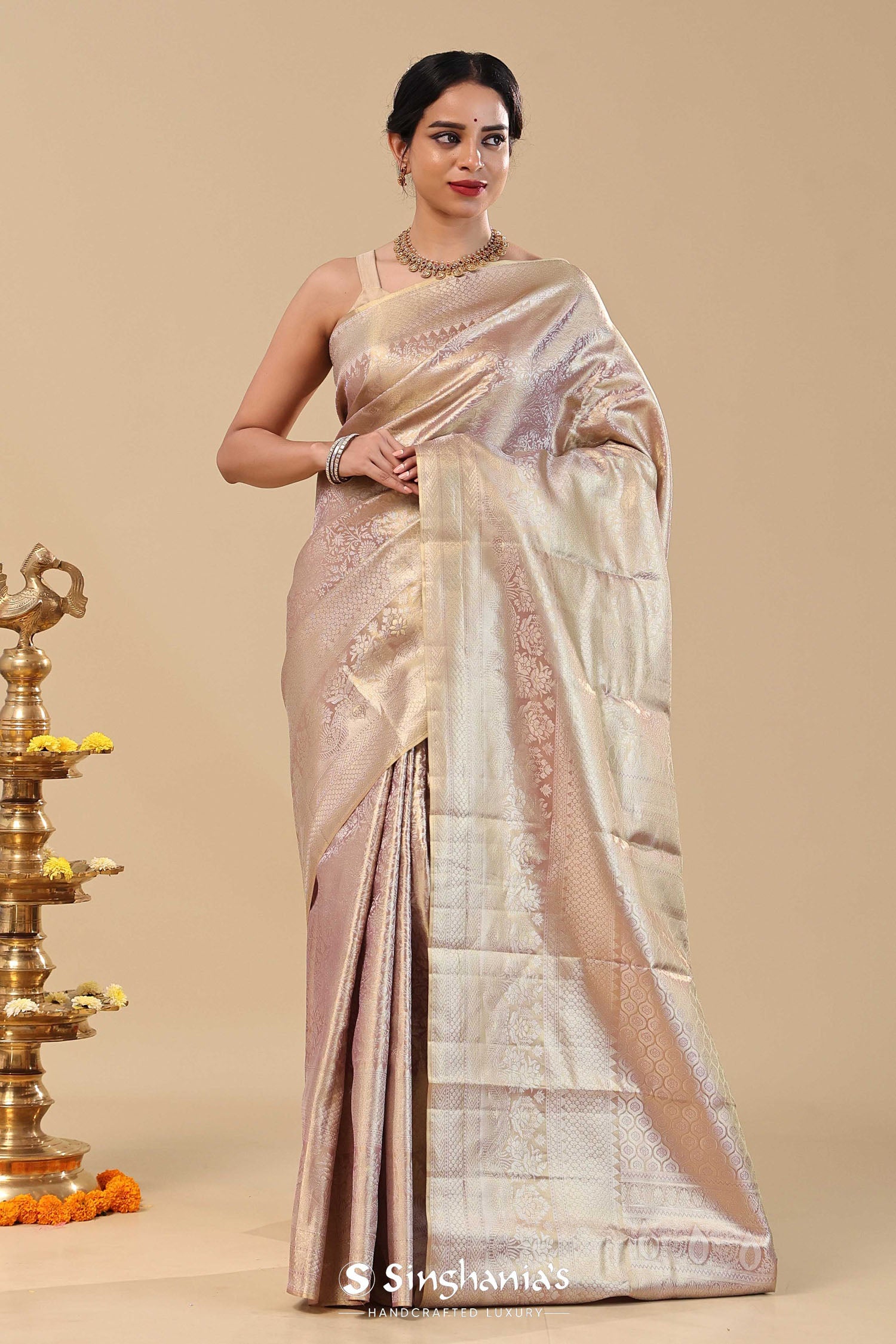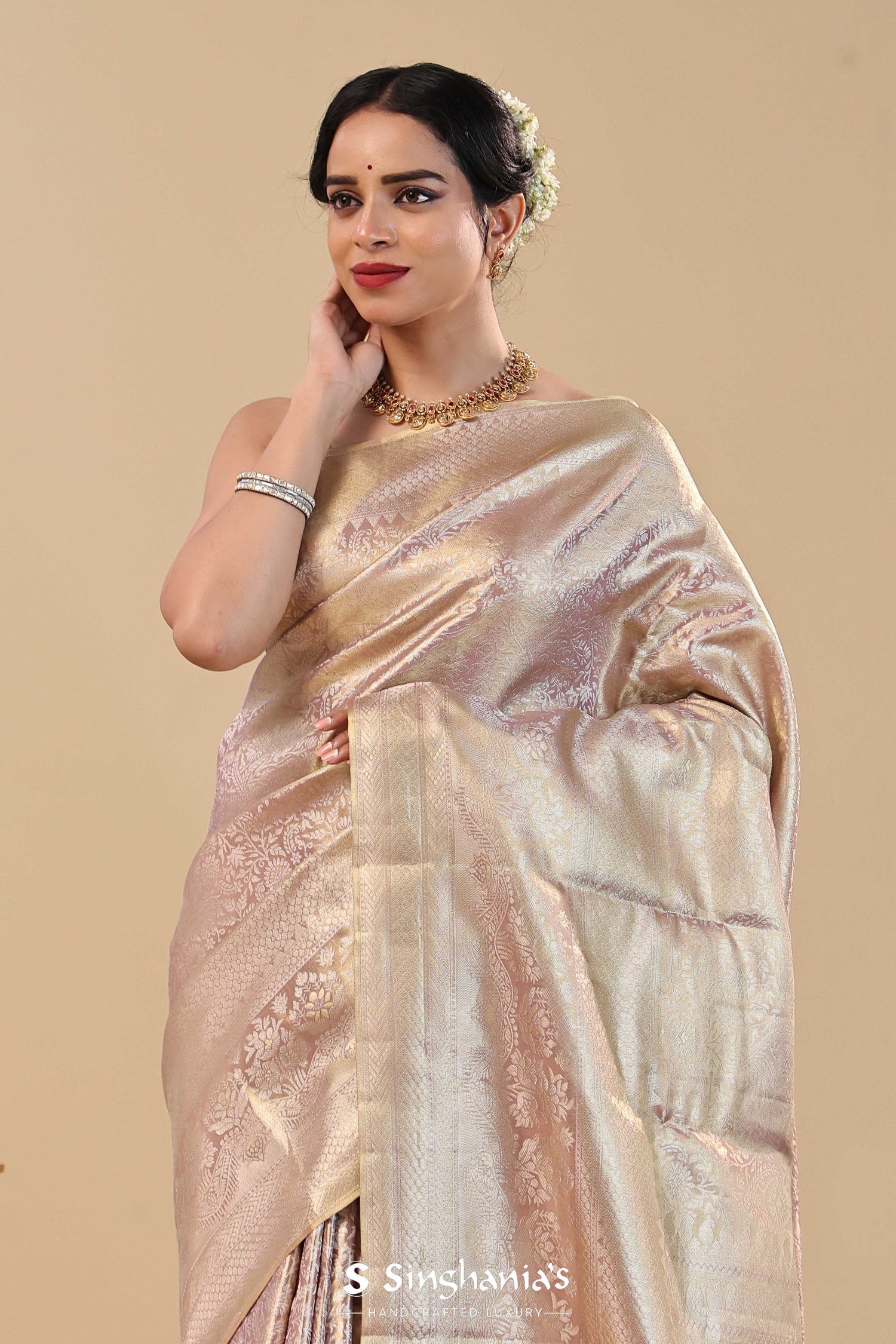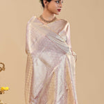 Lilac kanjivaram saree features intricate floral jaal woven with silver zari along with designer border with is adorned with silver zari creating a wave and repeated floral pattern making it look elegant and traditional for any special occasions like festive and wedding