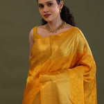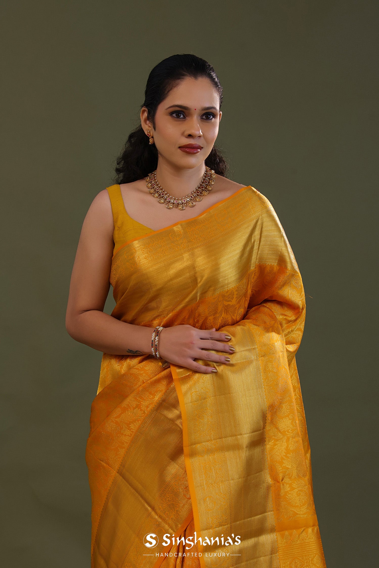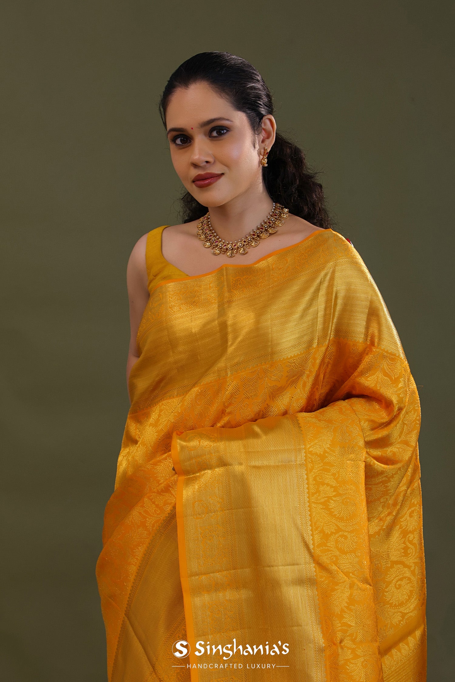 The royal Ochre yellow Kanjivaram silk saree features floral jaal brocade with gold zari complemented with gold zari border and unstitched blouse