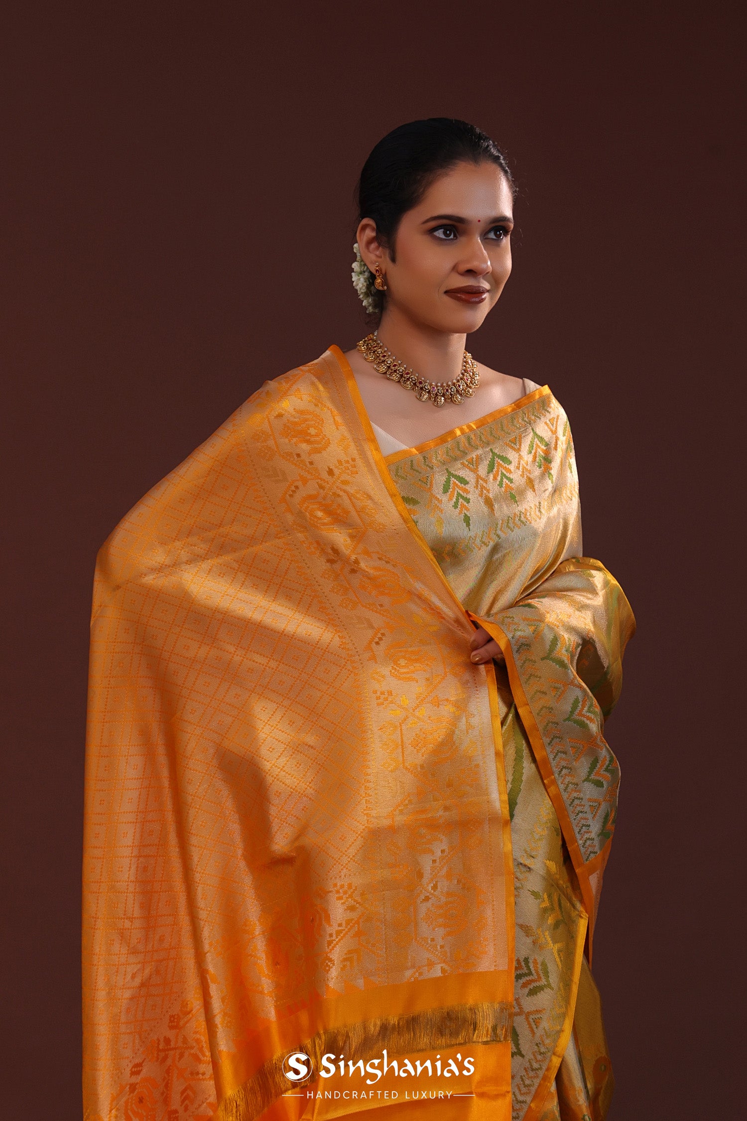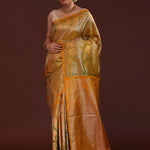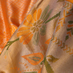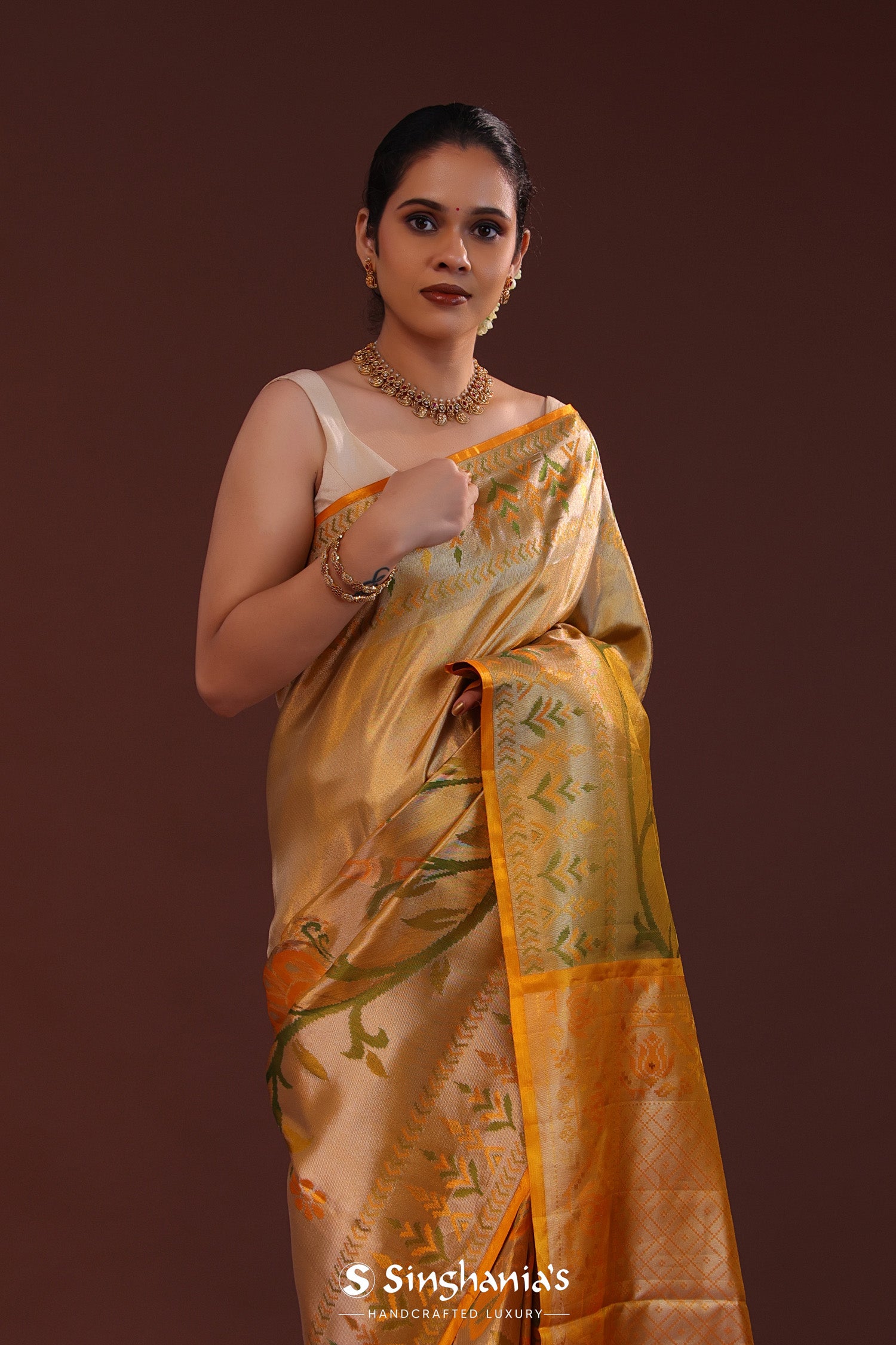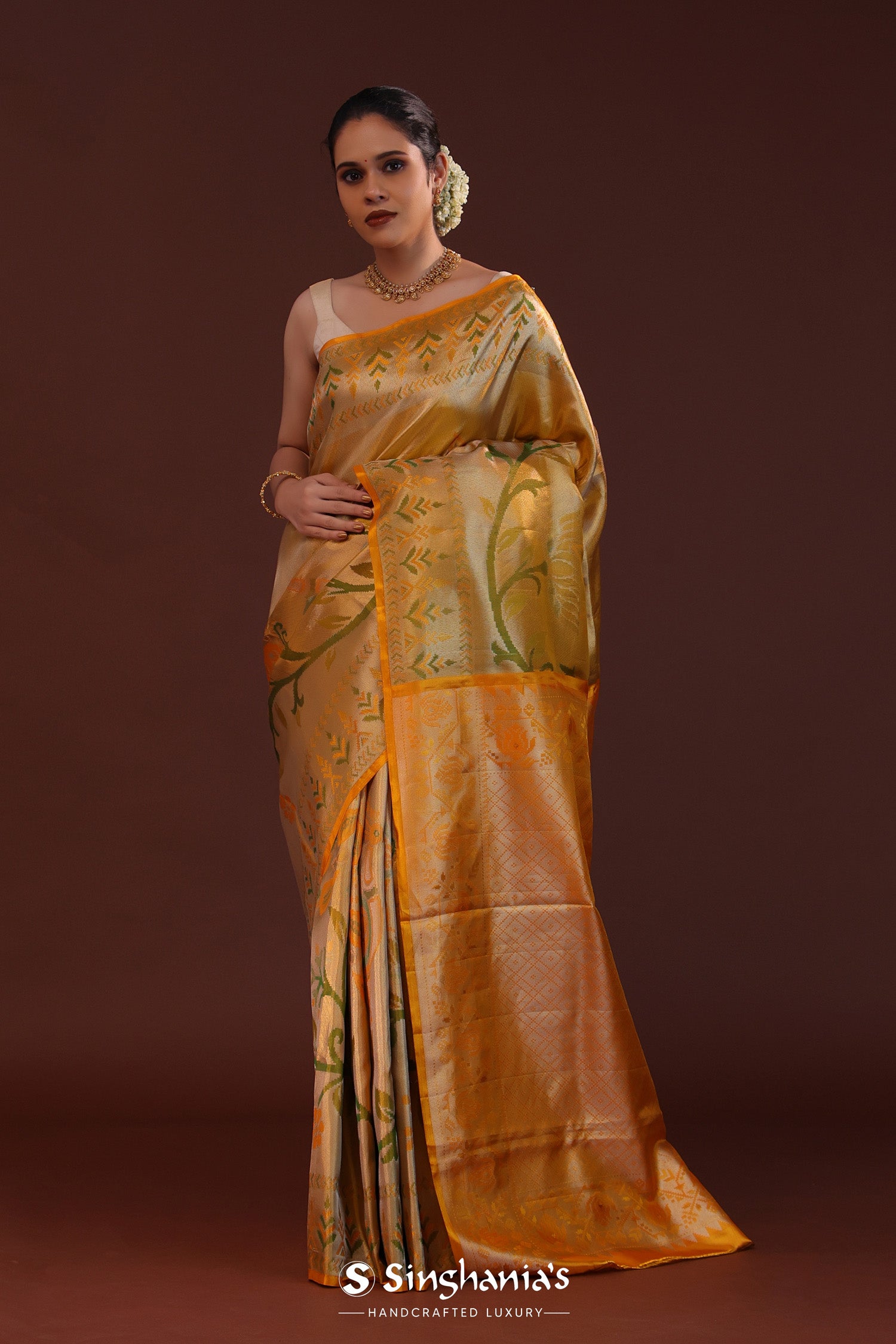 The floral woven design in contrast colors on body of the Orange kanjivaram tissue designer saree complemented with designer border and unstitched blouse