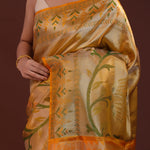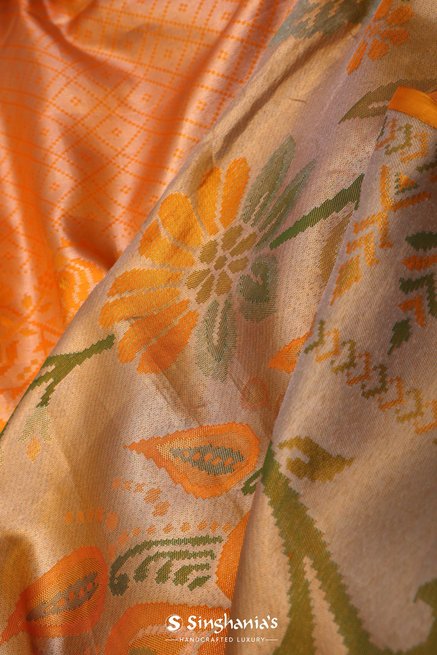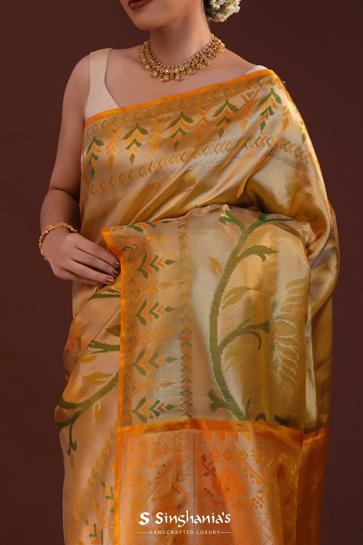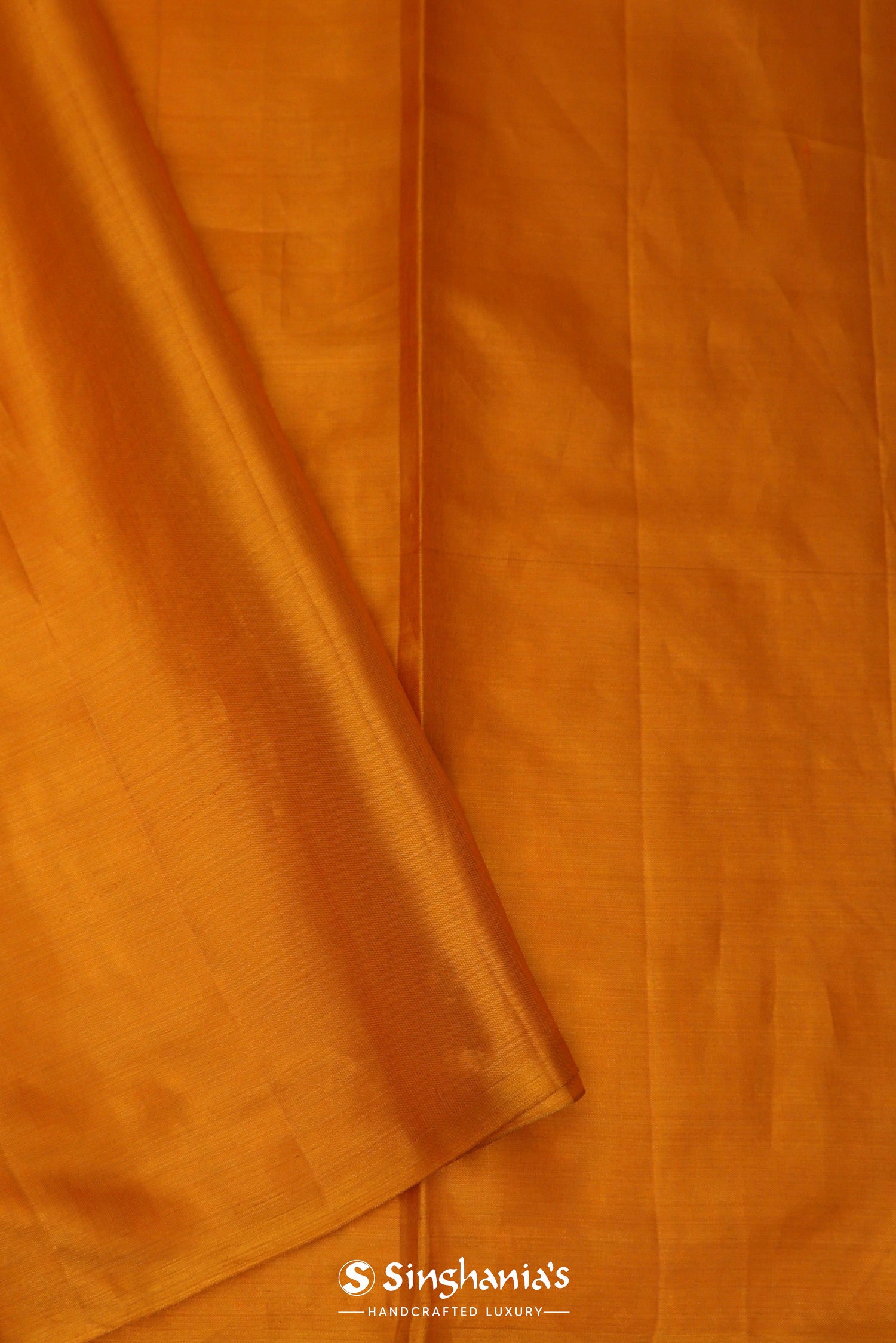 The floral woven design in contrast colors on body of the Orange kanjivaram tissue designer saree complemented with designer border and unstitched blouse
