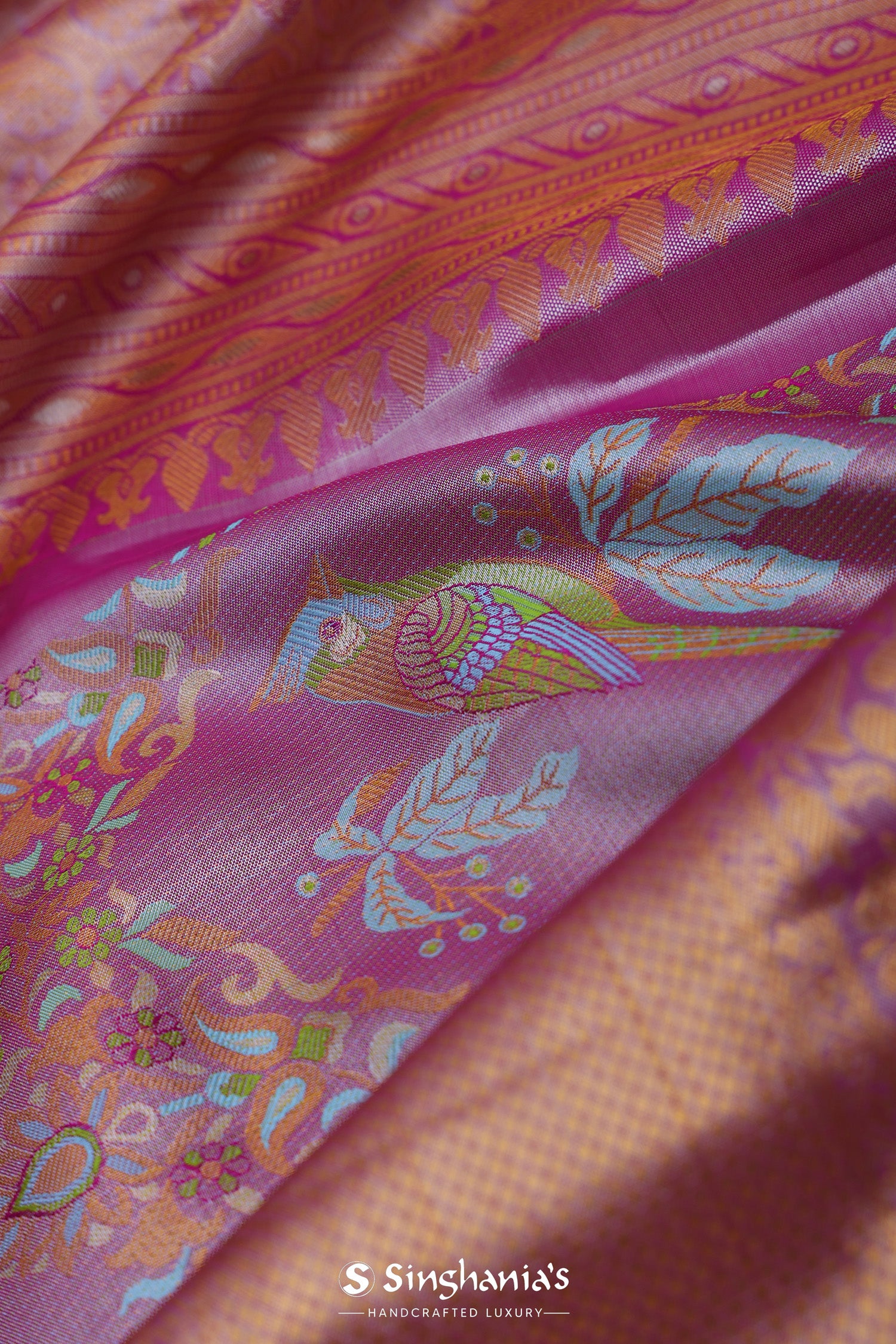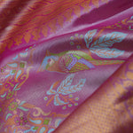 The avian and floral design woven on body of Persian pink kanjivaram tissue saree complemented with contrast border and unstitched blouse