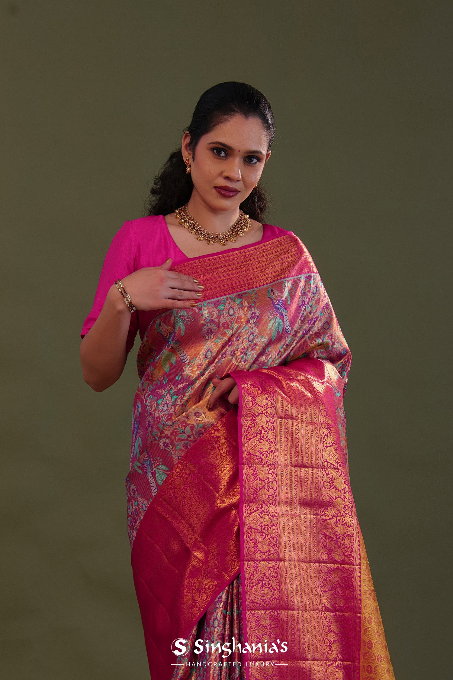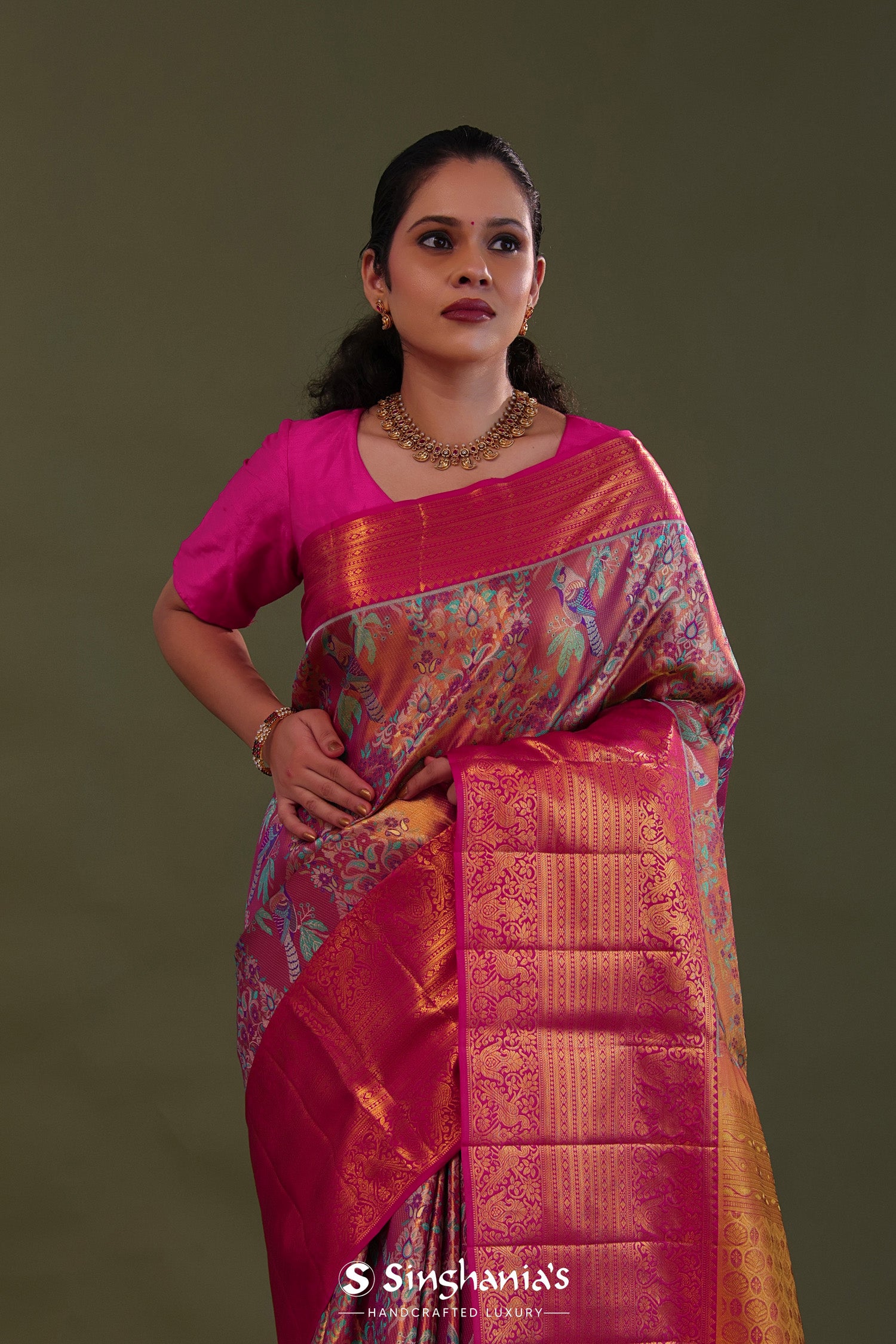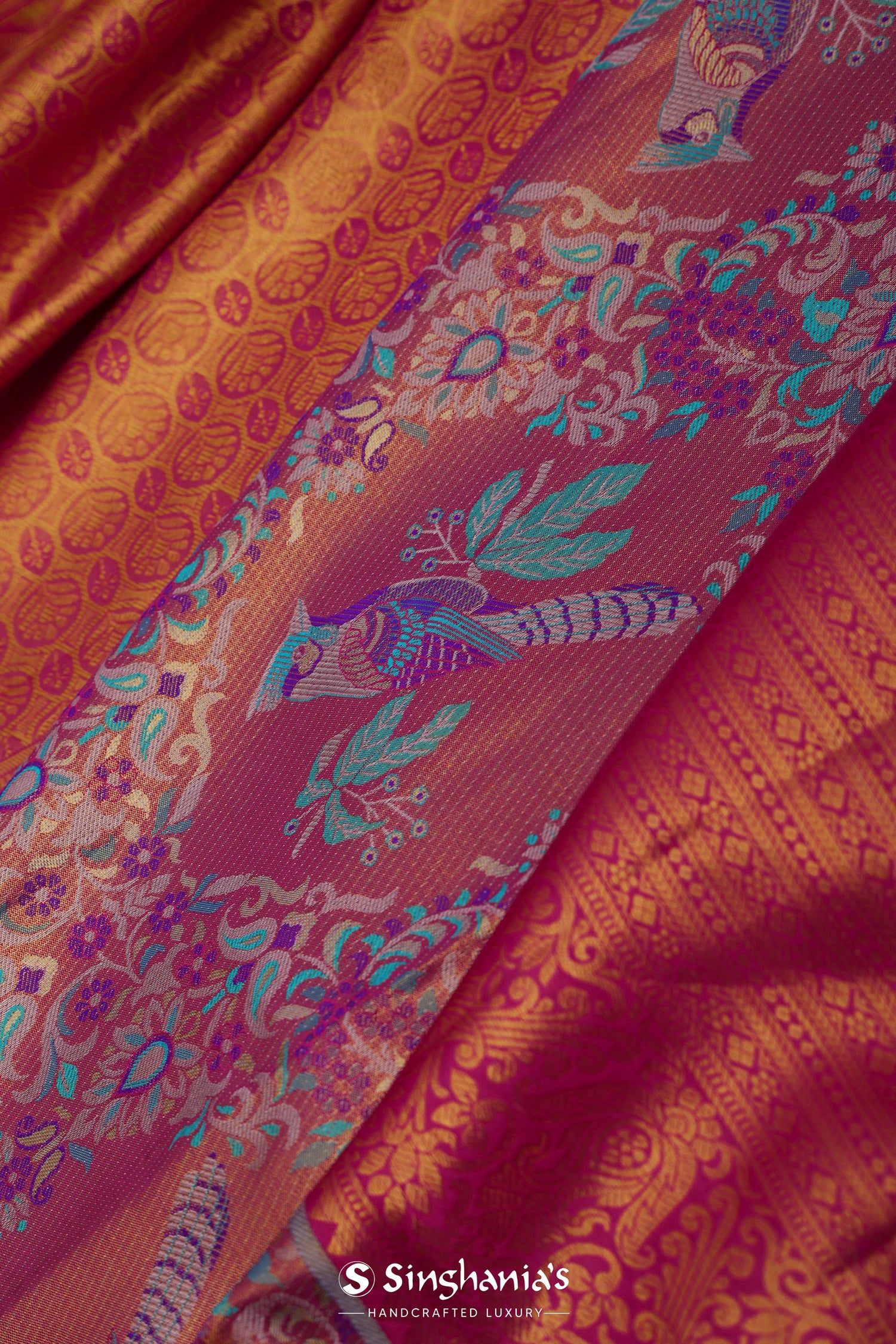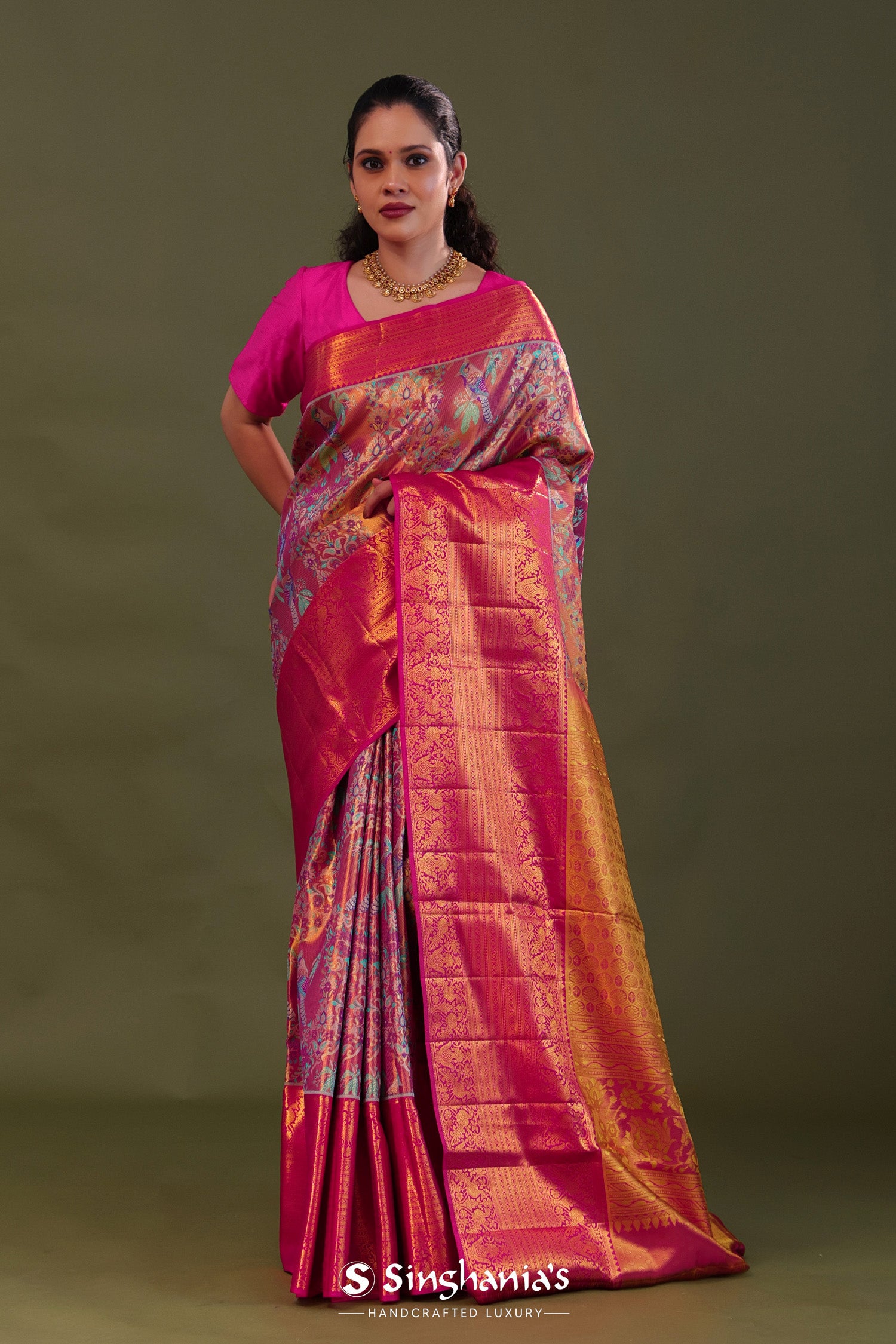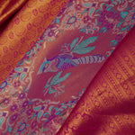 The avian and floral design woven on body of Pink kanjivaram tissue saree complemented with contrast border and unstitched blouse
