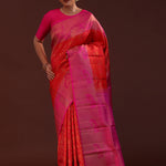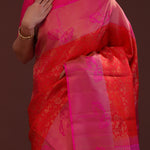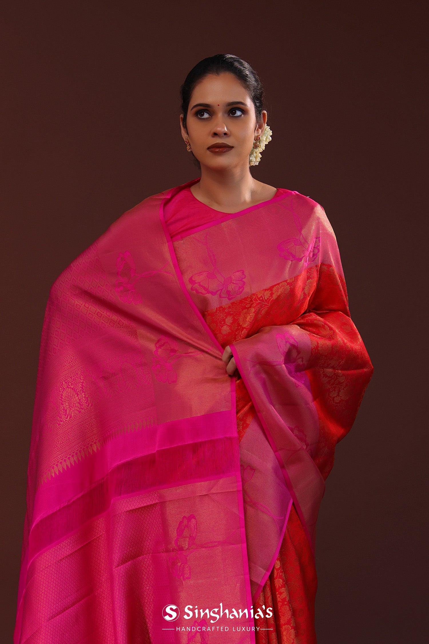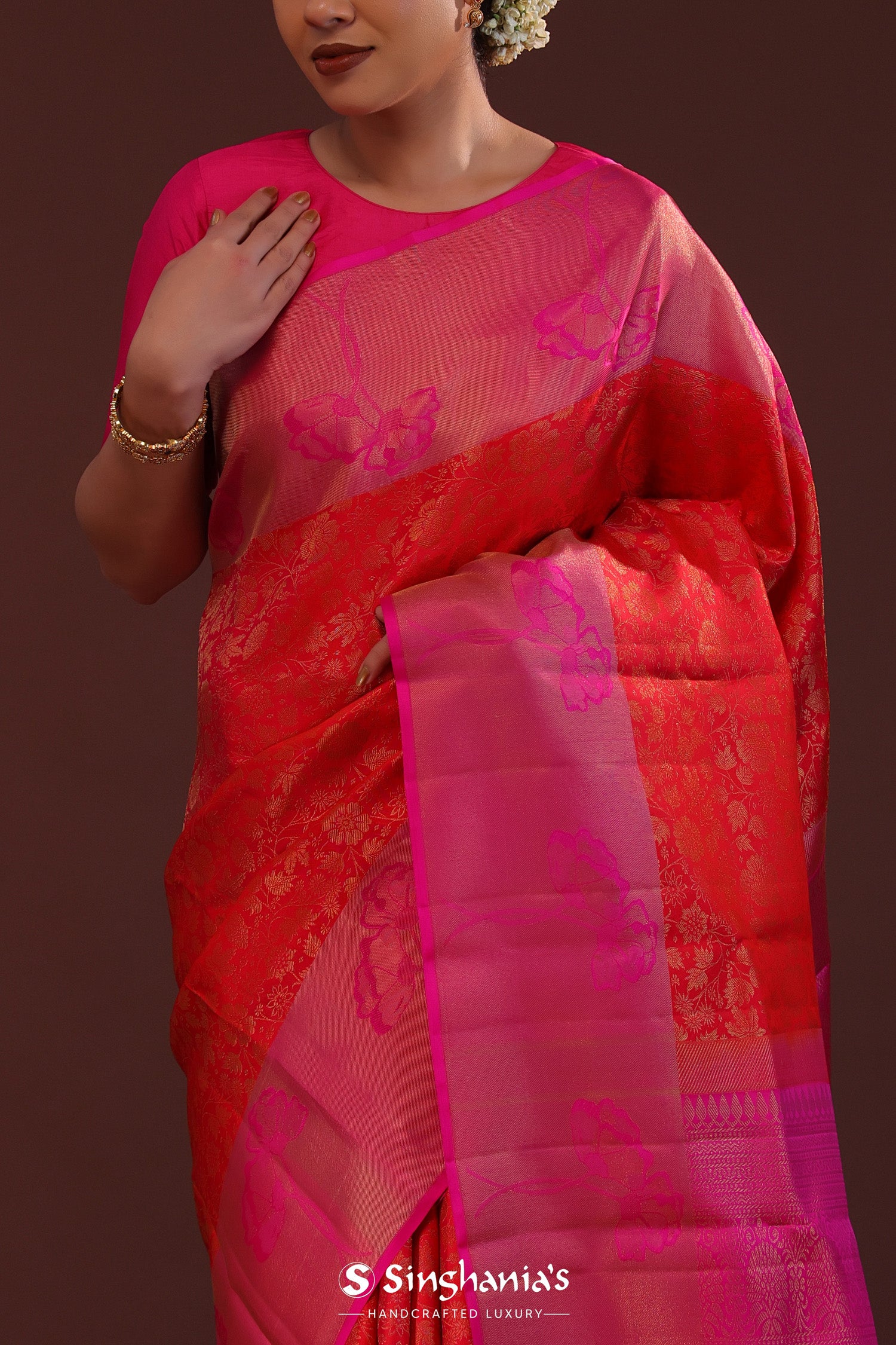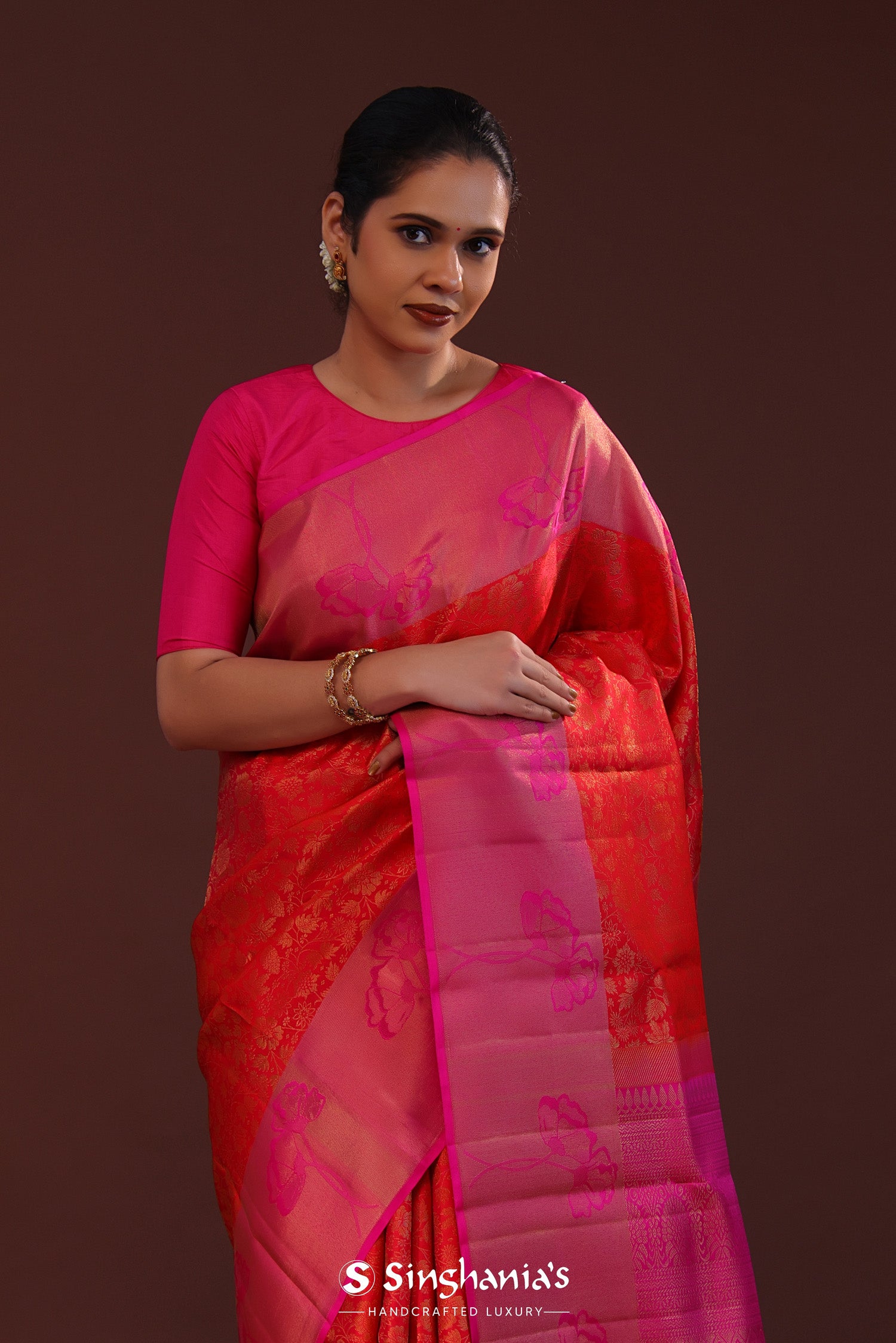 The floral pattern woven with gold zari on Red kanjivaram silk saree complemented with deep pink border, pallu and unstitched brocade blouse