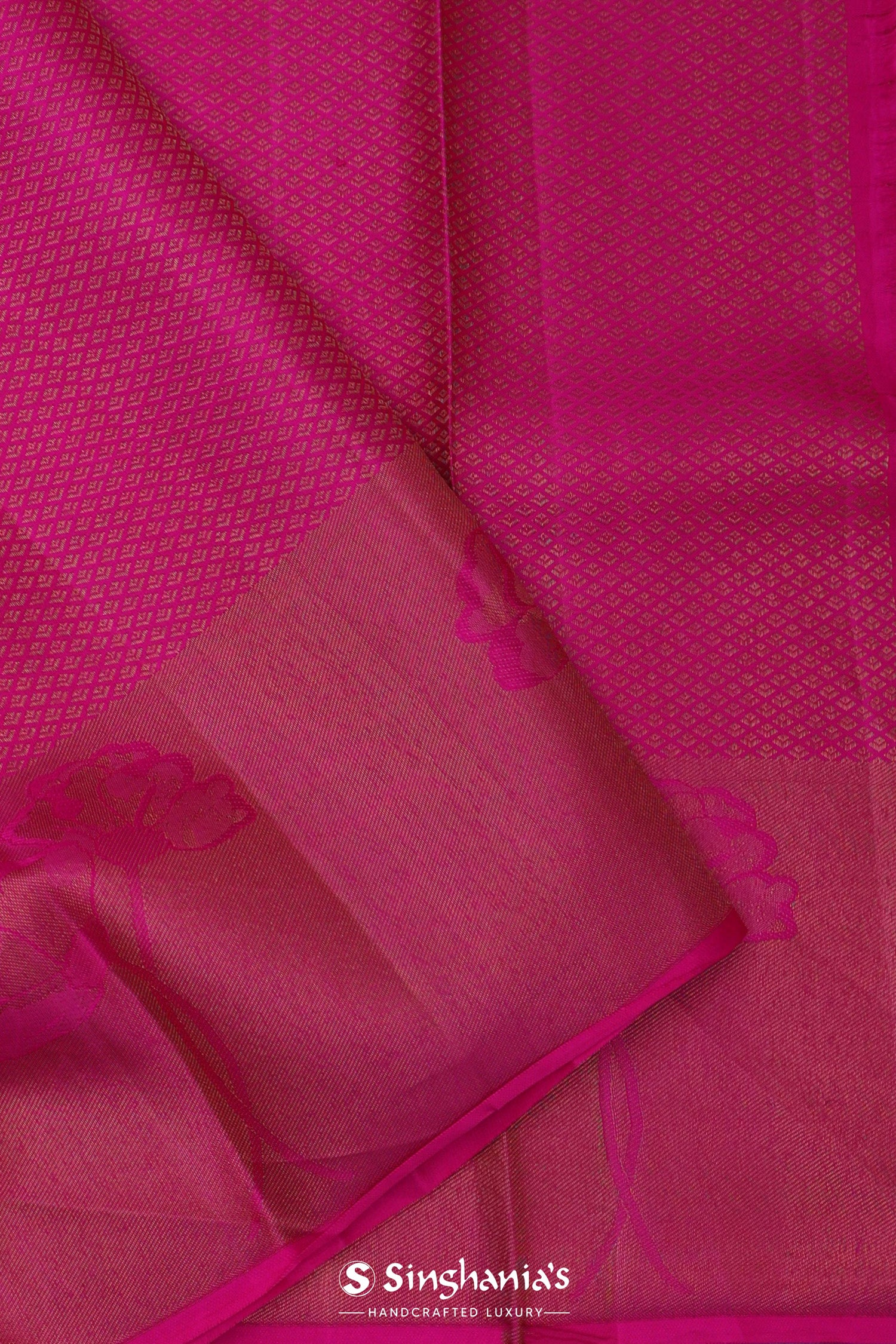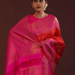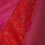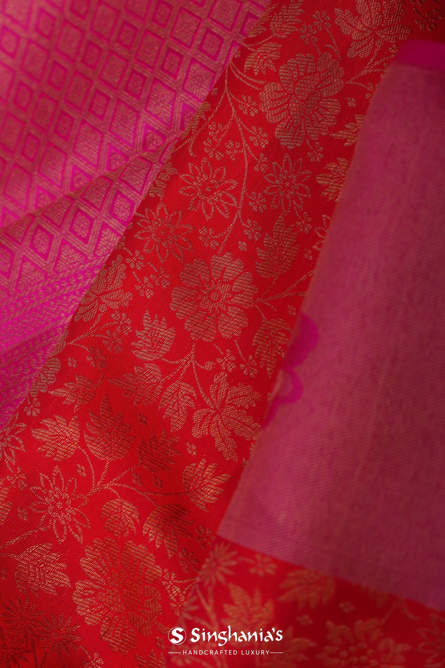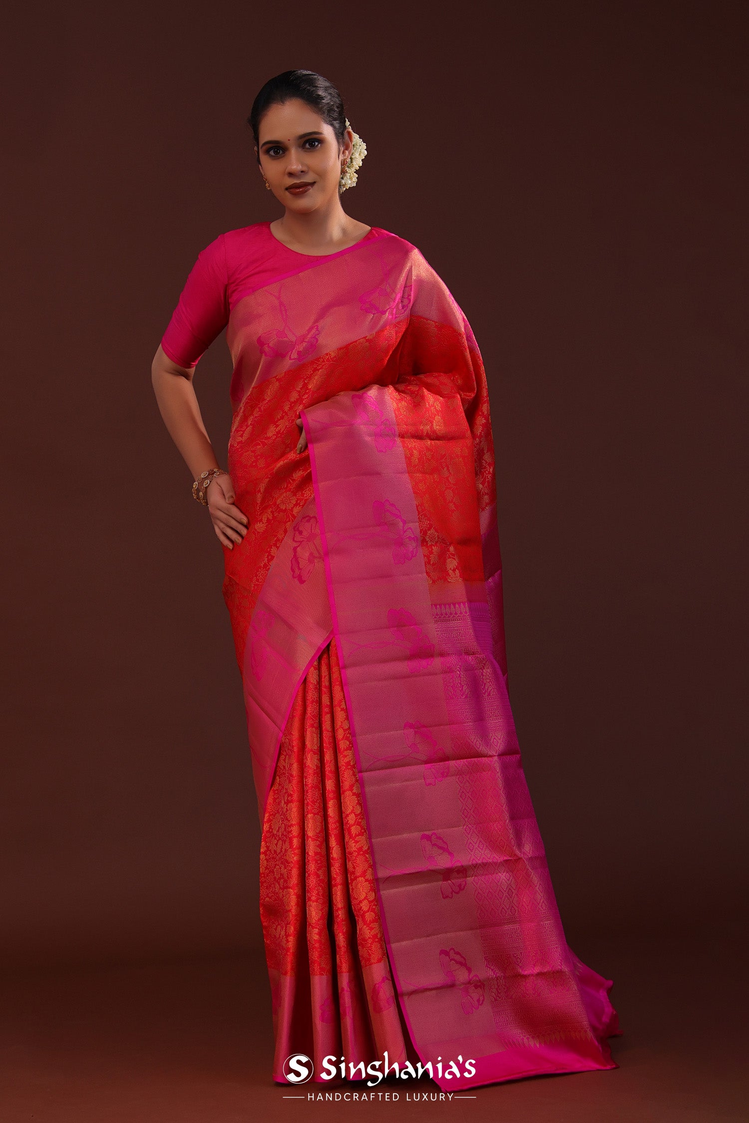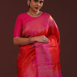 The floral pattern woven with gold zari on Red kanjivaram silk saree complemented with deep pink border, pallu and unstitched brocade blouse