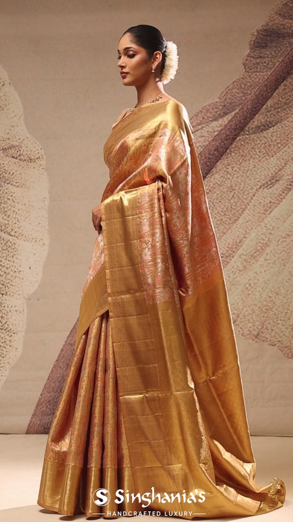 A sunset gold kanjivaram silk saree featuring the floral jaal woven throughout in fine gold and tilfi zari. The big border displays floral-vairam patterns, while the pallu presents a spectacular canvas of intertwined floral buttis. Perfect for bridal ceremonies and traditional functions.