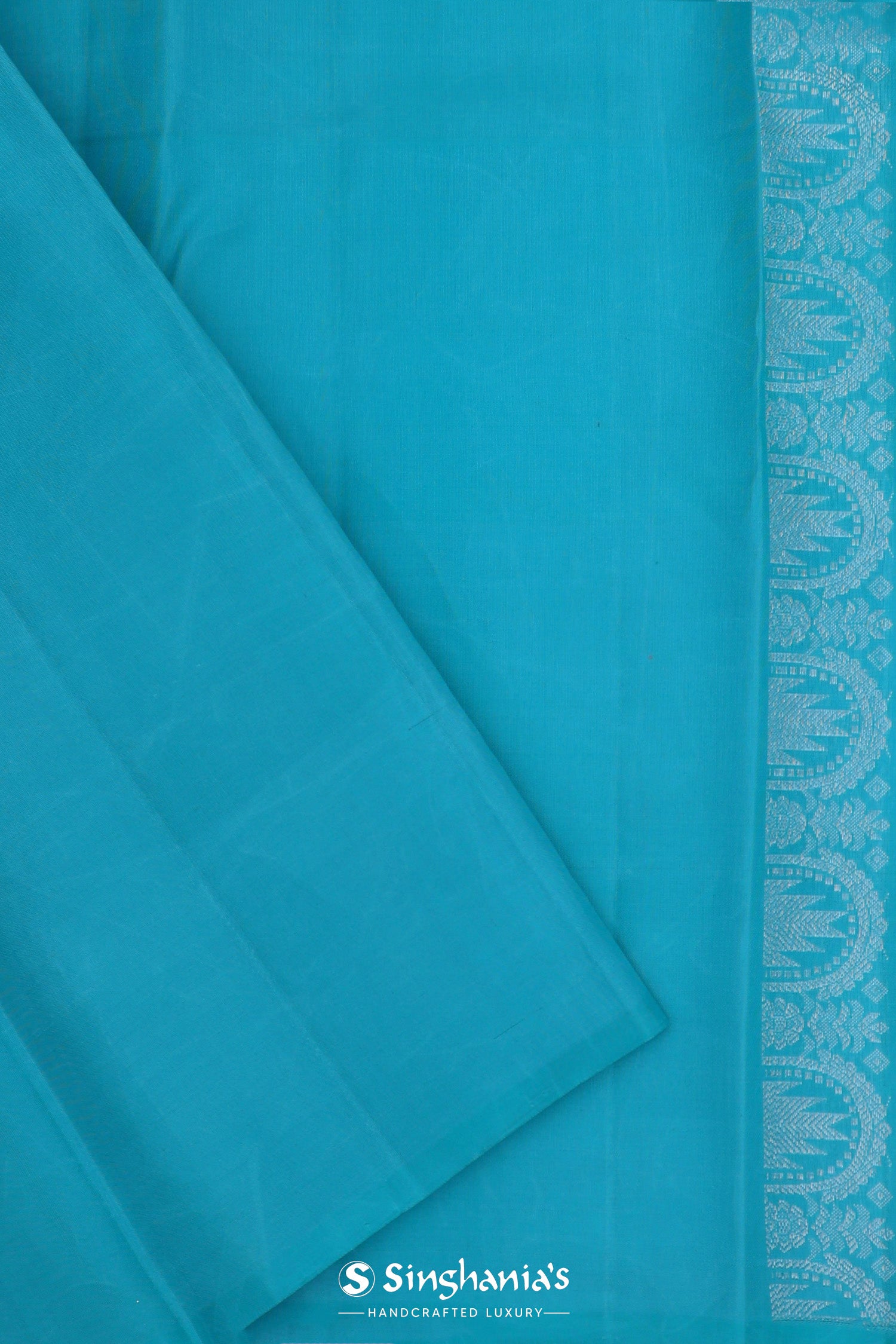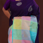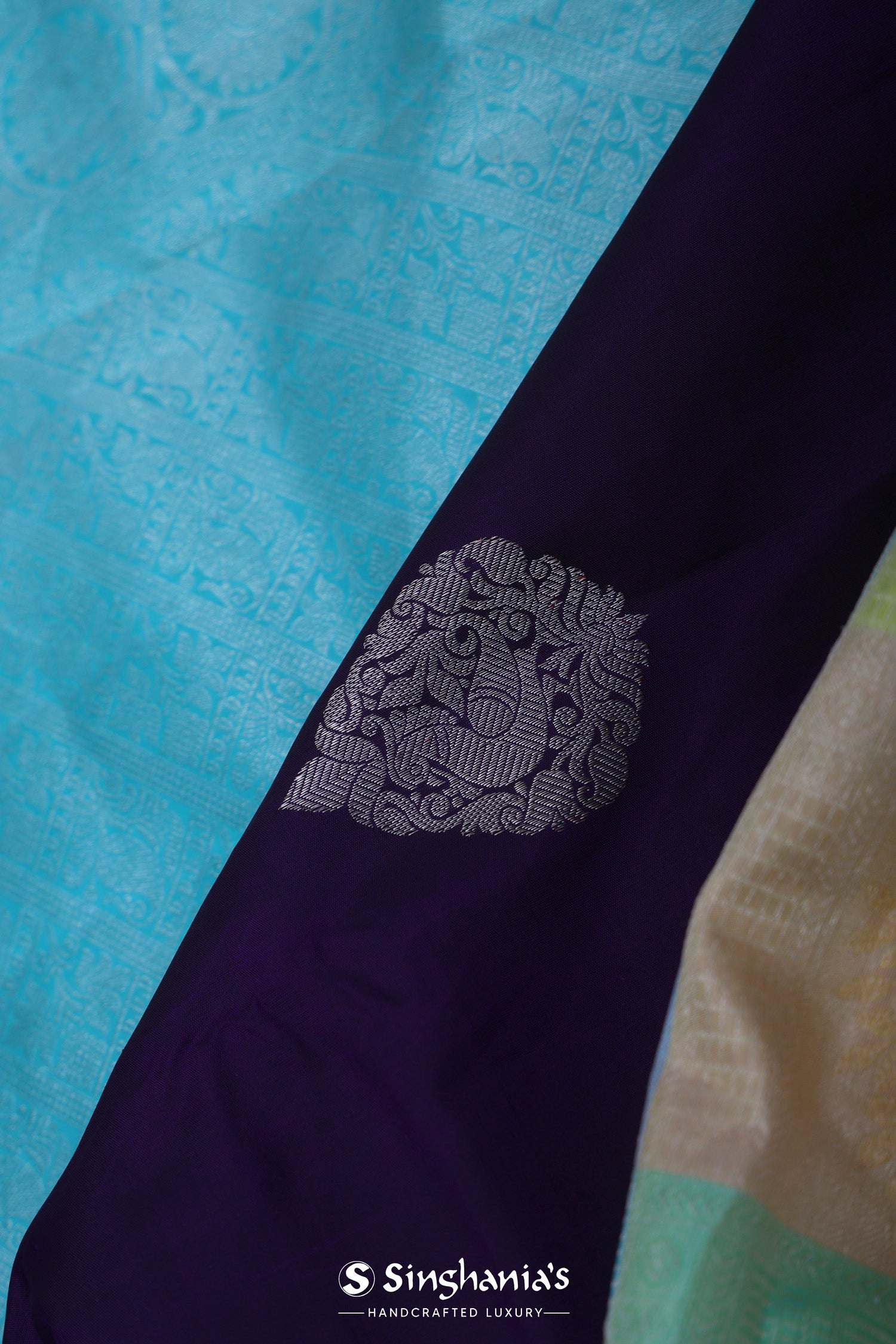 The peacock motifs spread all across the body of this lightweight Very dark purple kanjivaram silk saree complemented with rangkat border , blue pallu and contrast unstitched blouse
