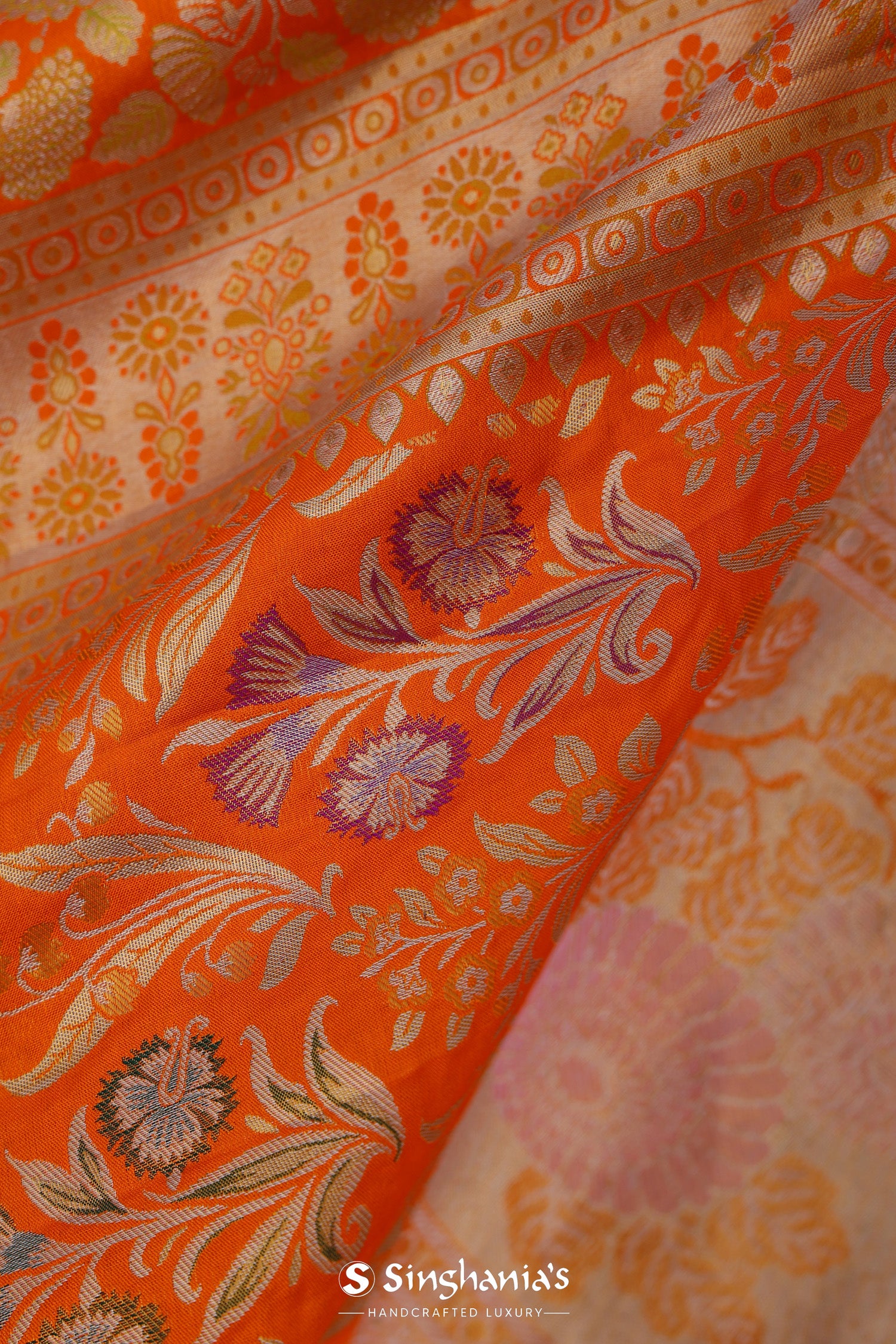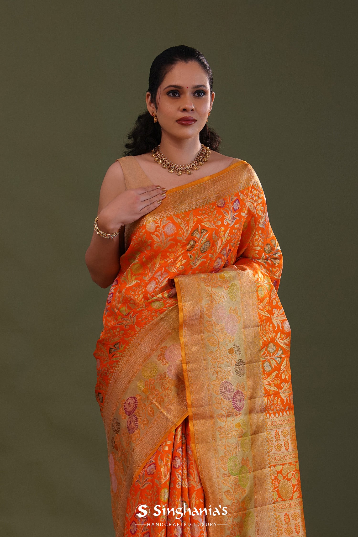 The meenakari floral design spread all across the body of Vibrant orange kanjivaram silk saree complemented with tissue border adorned with meenakari floral design and unstitched blouse