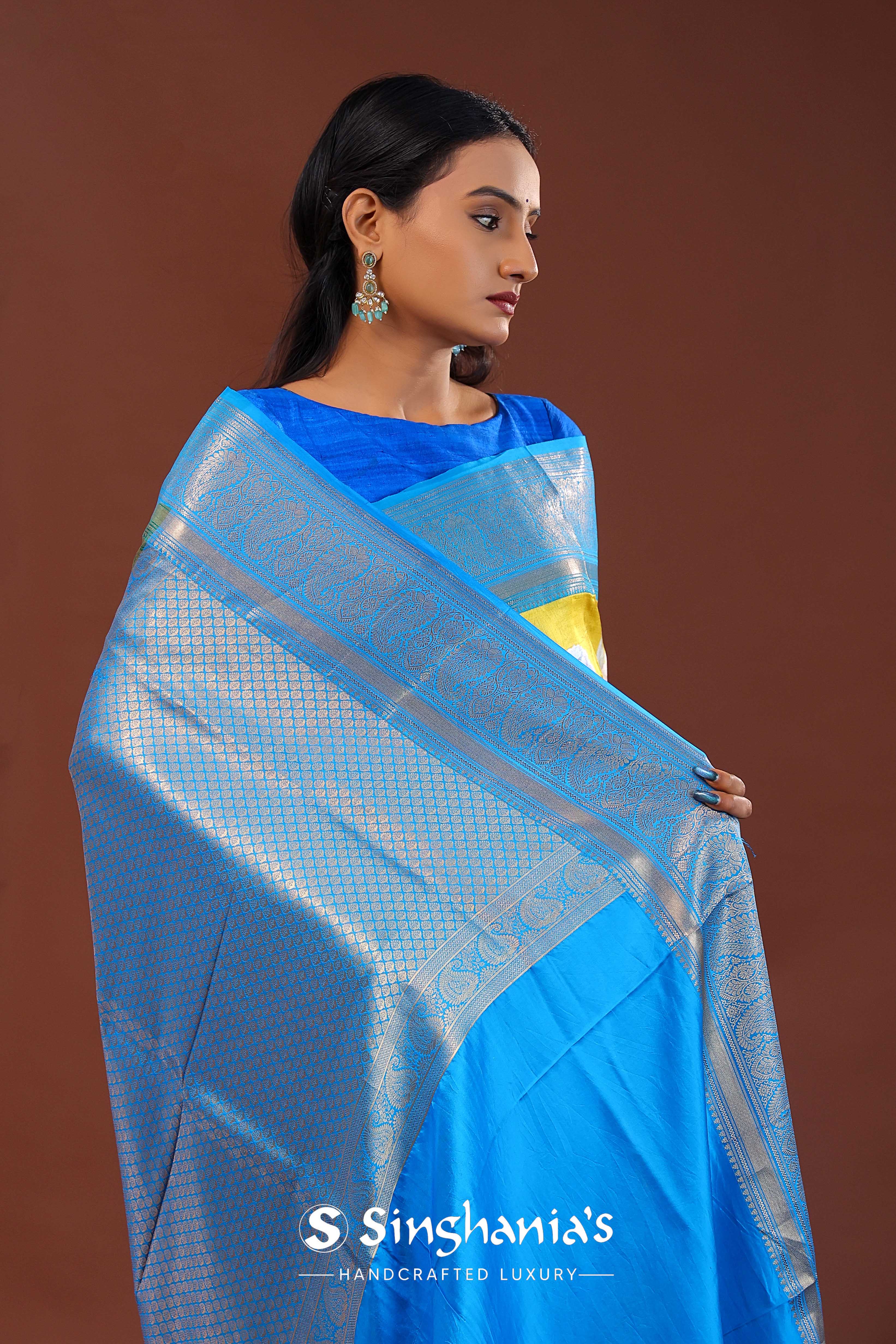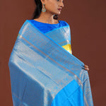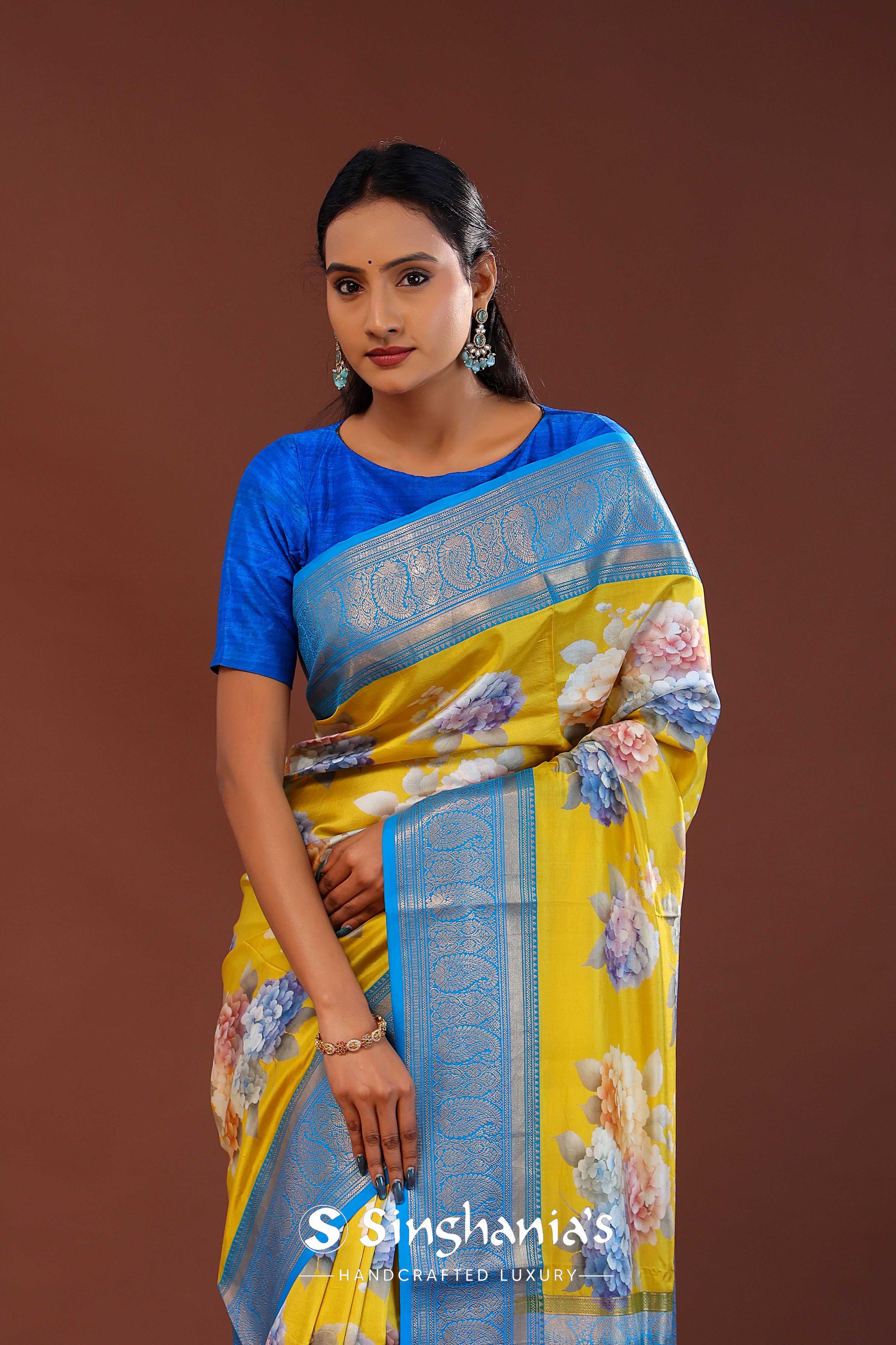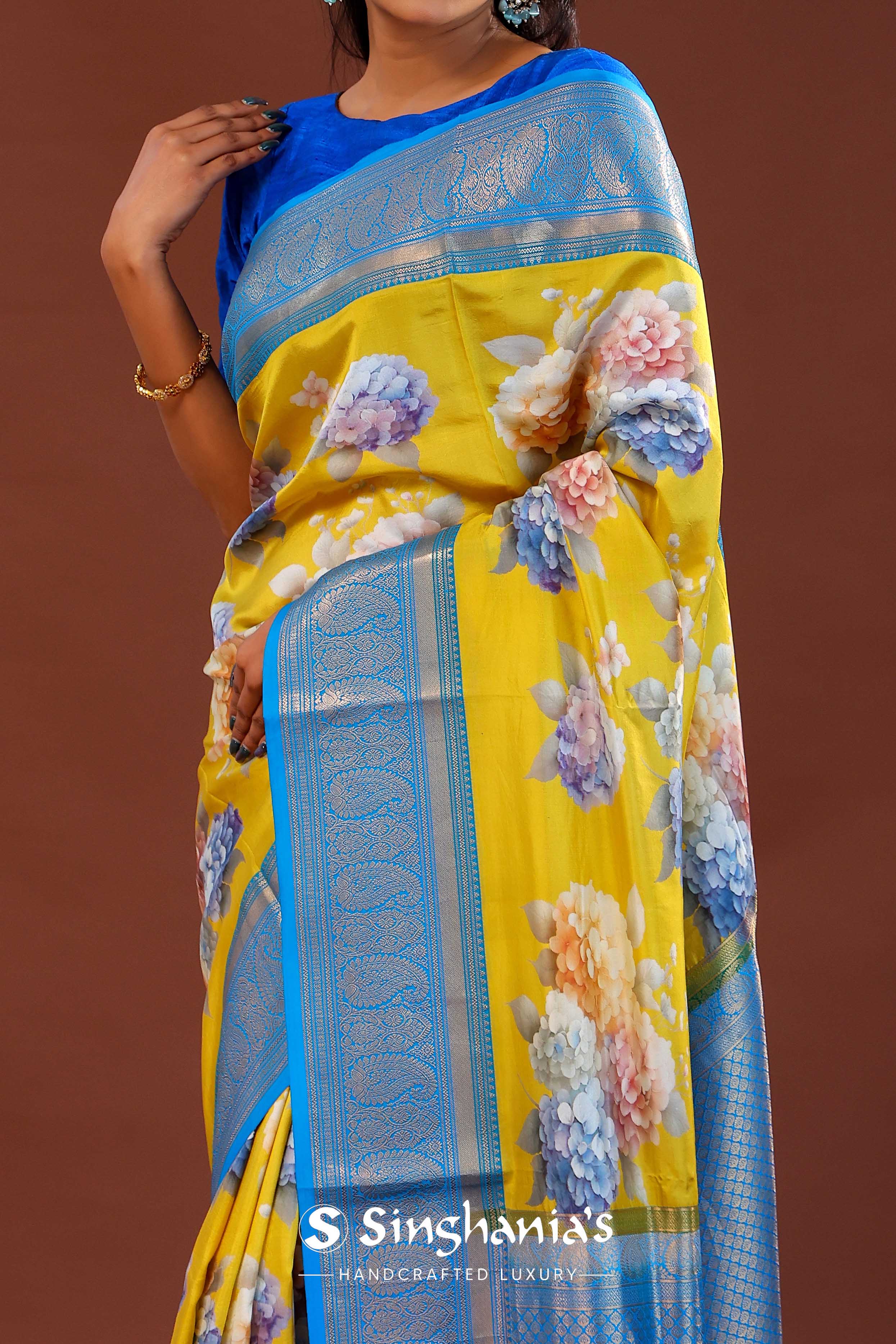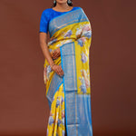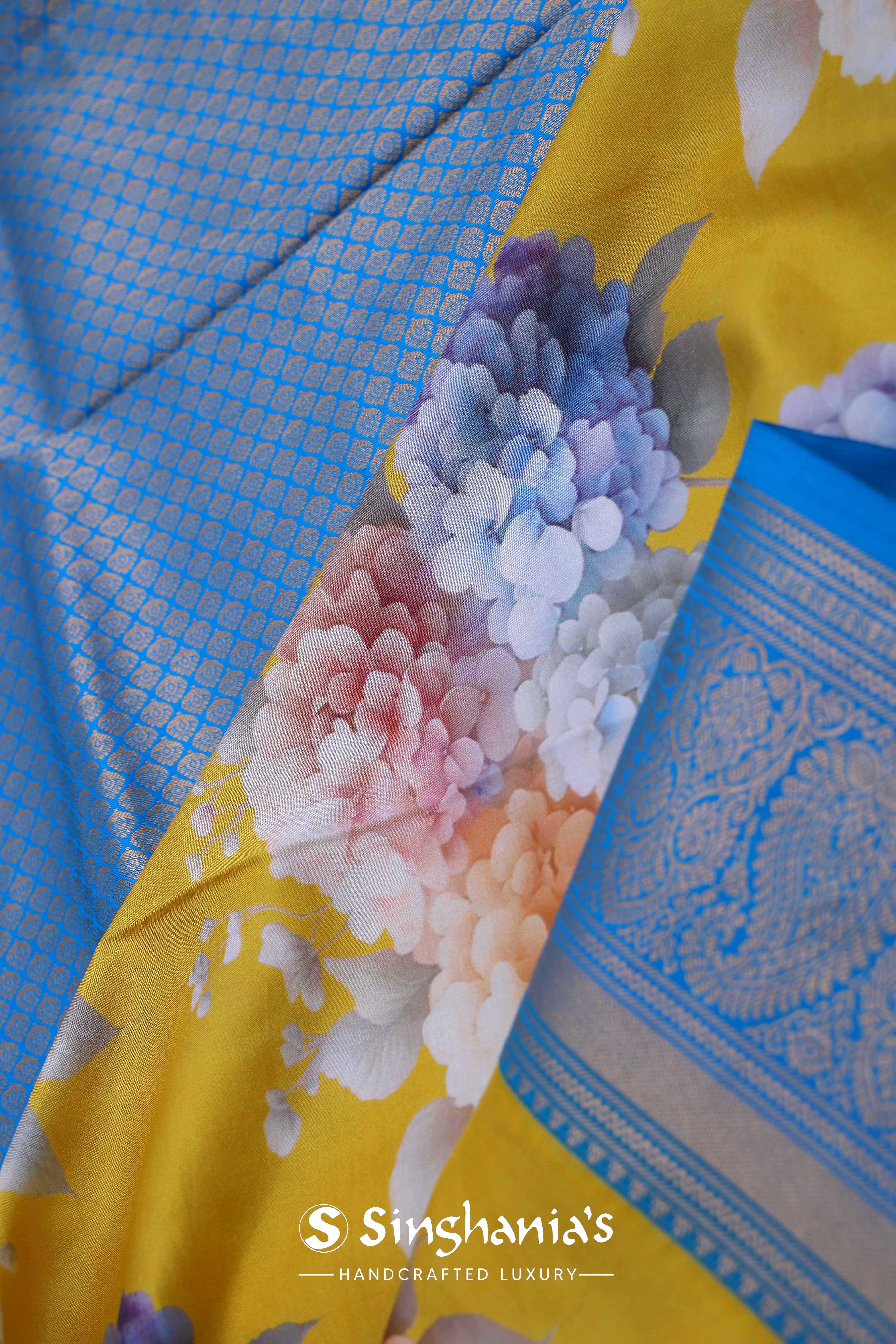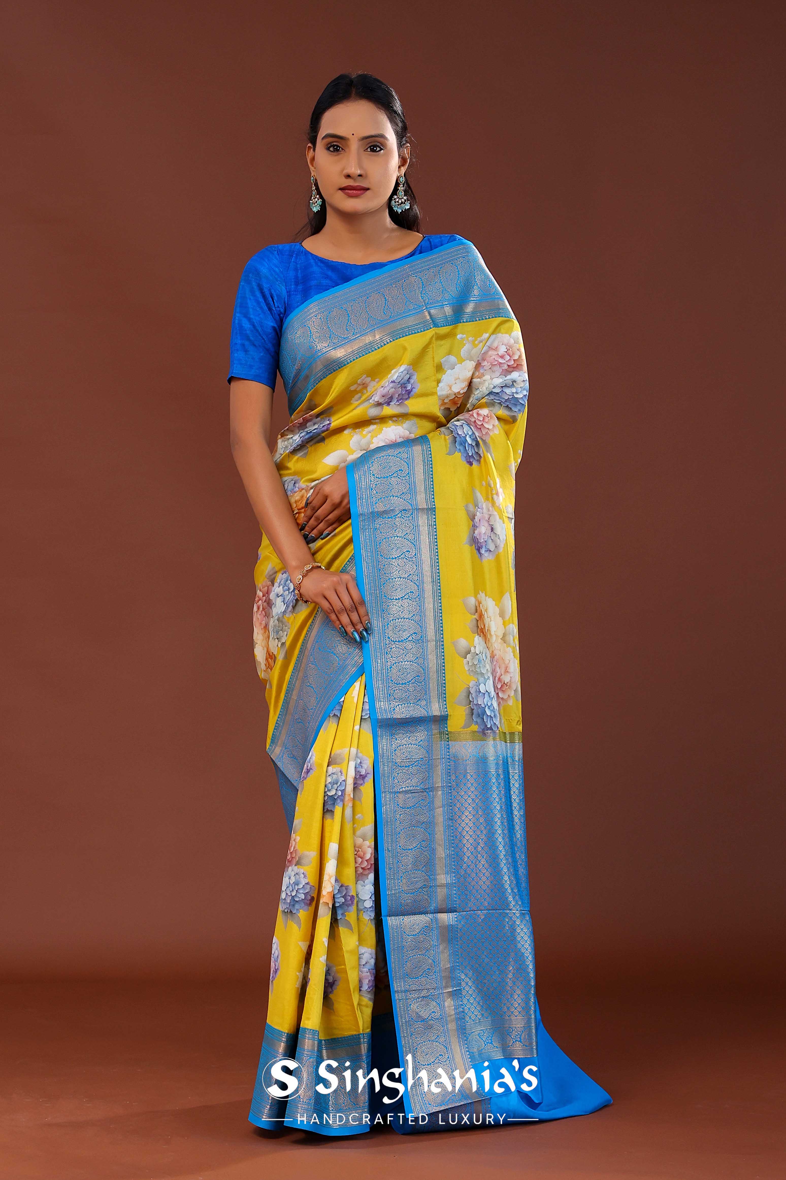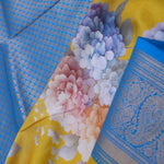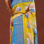 This Yellow digital printed kanjivaram saree is timeless piece with a silk base.Where weaving on contrast border reflects royalty and richness is reflected from the elegent floral print on the body.Perfect for traditional occasions