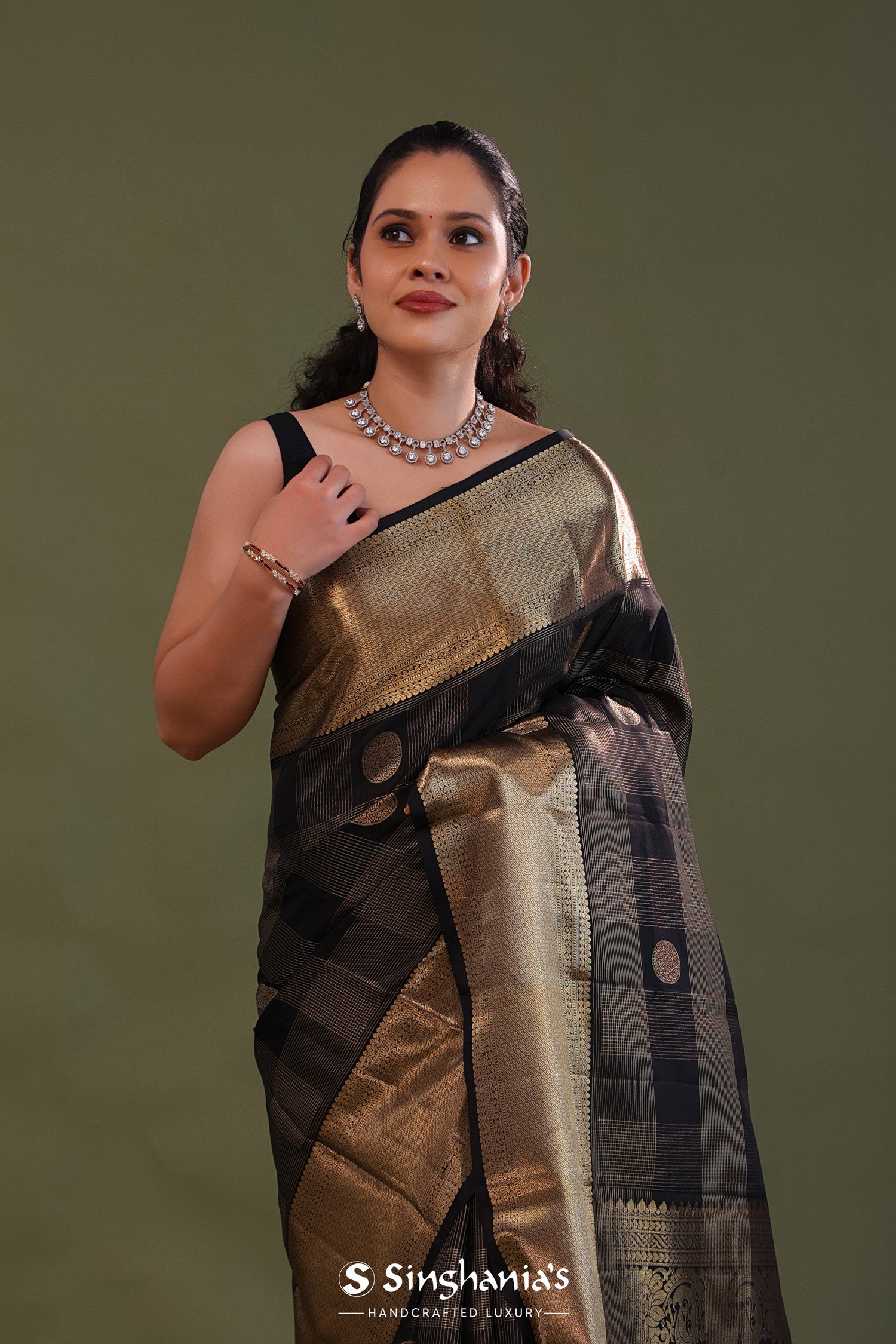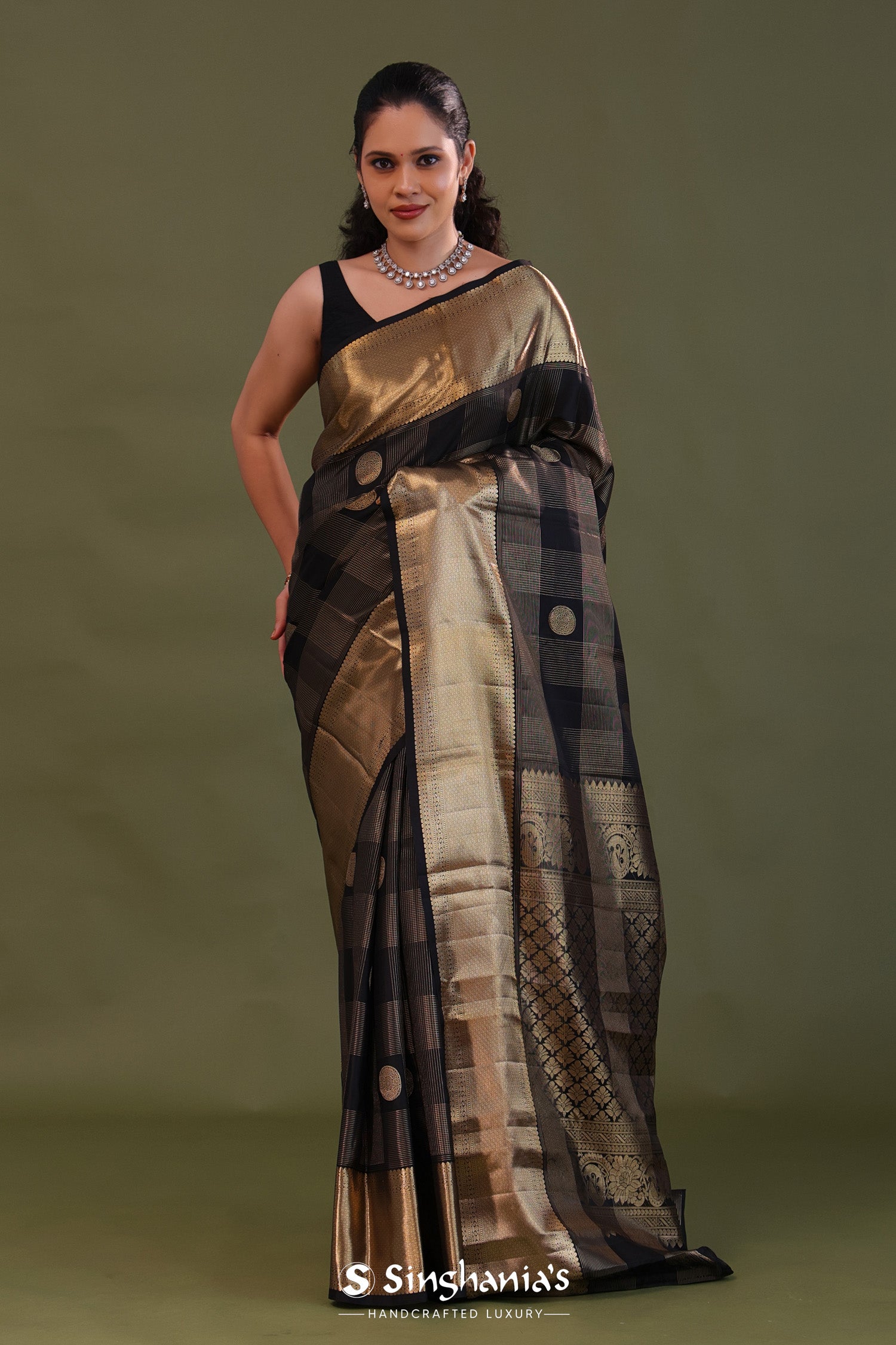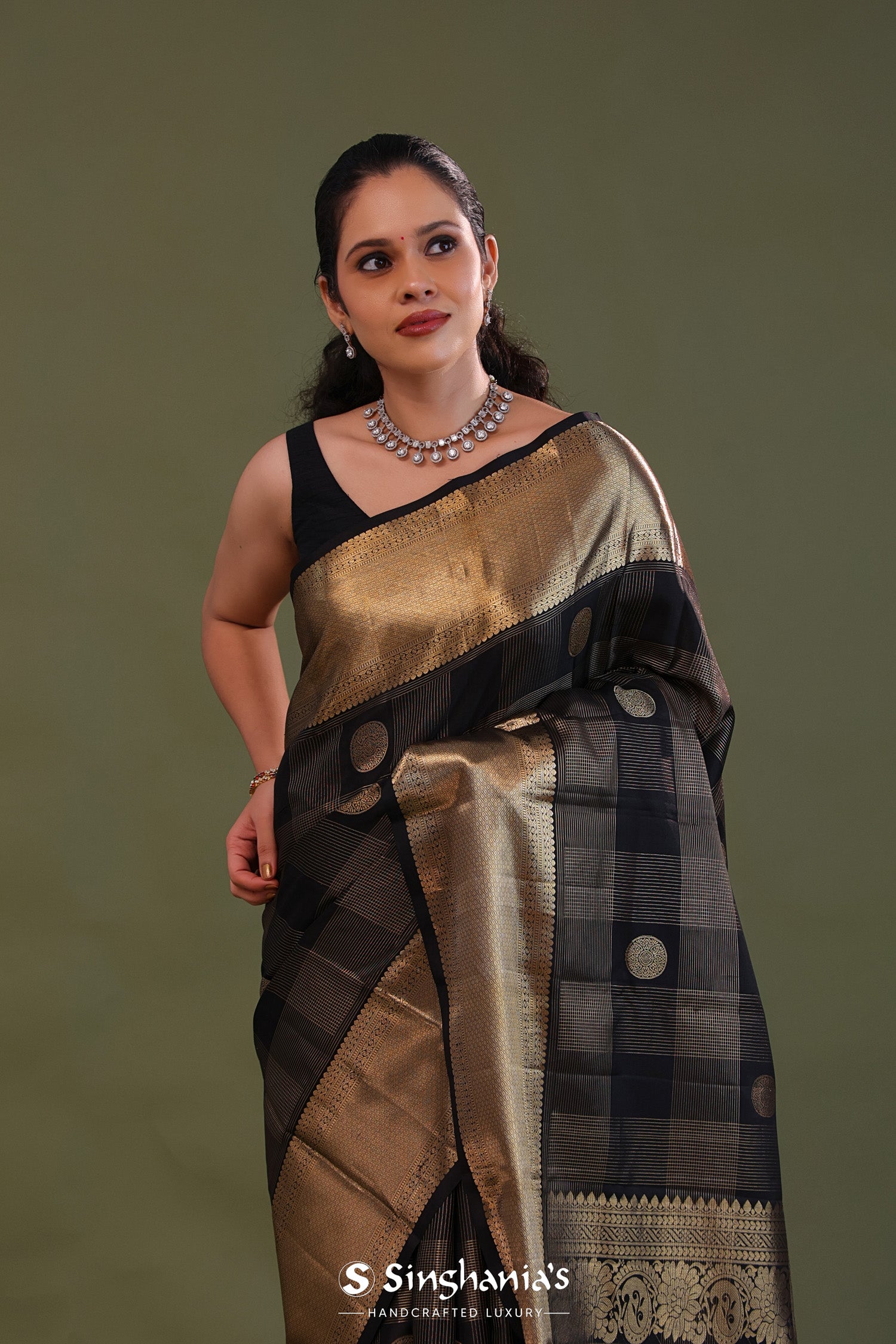 The lightweight Black kanjivaram silk saree features butta's and checks pattern spread all across the body ,complemented with gold zari border and unstitched blouse