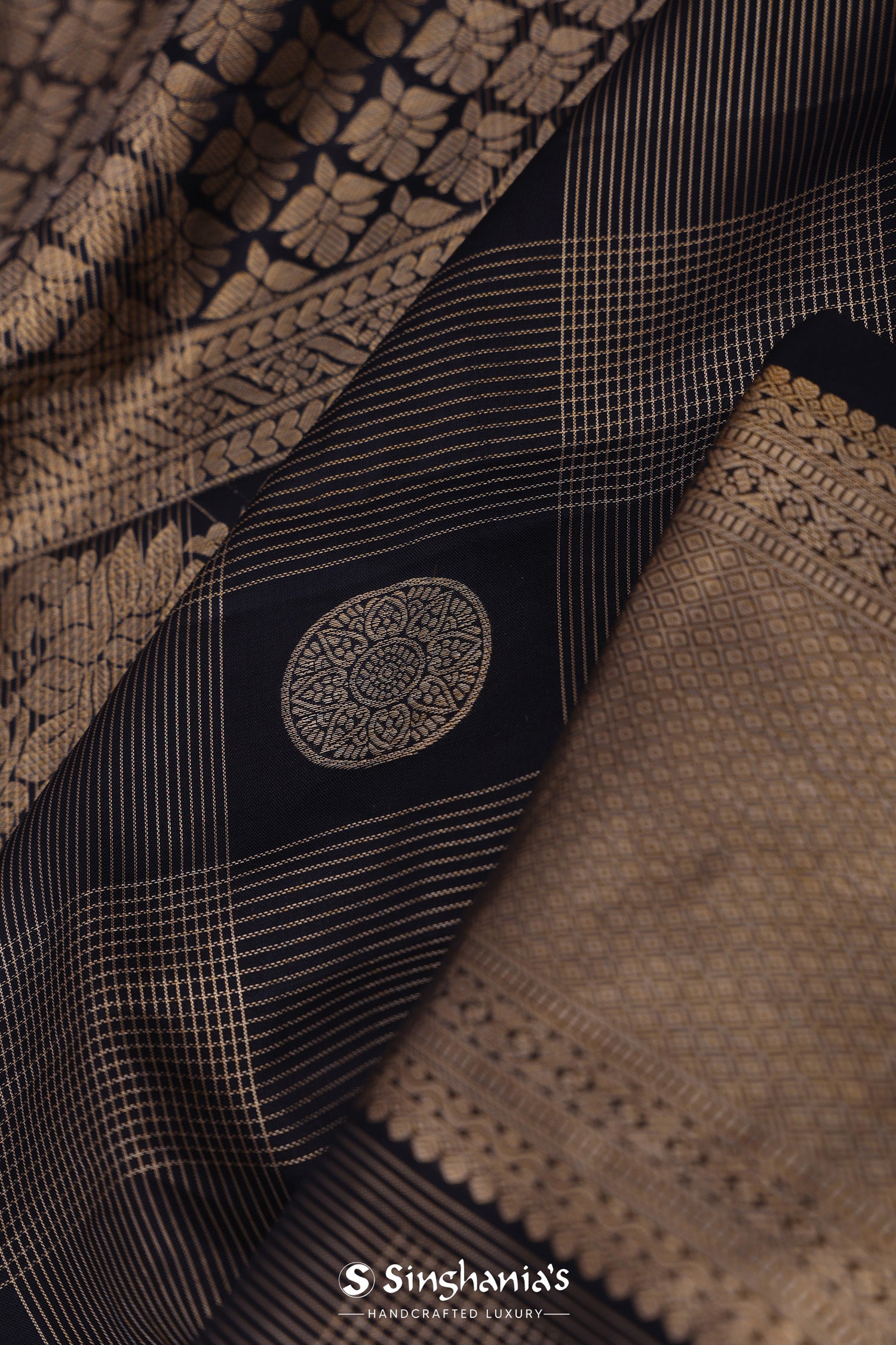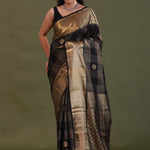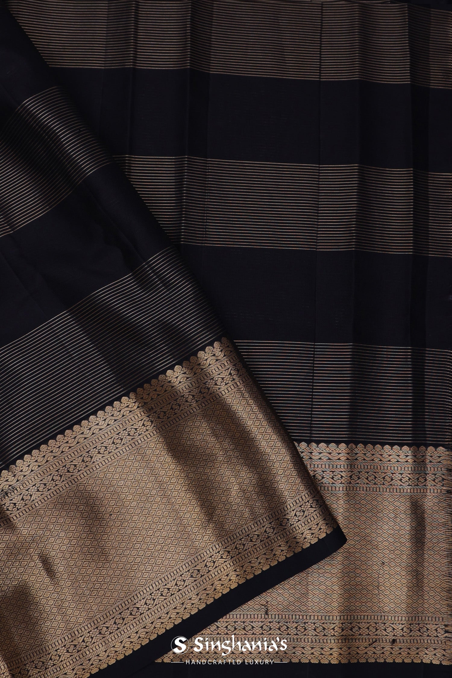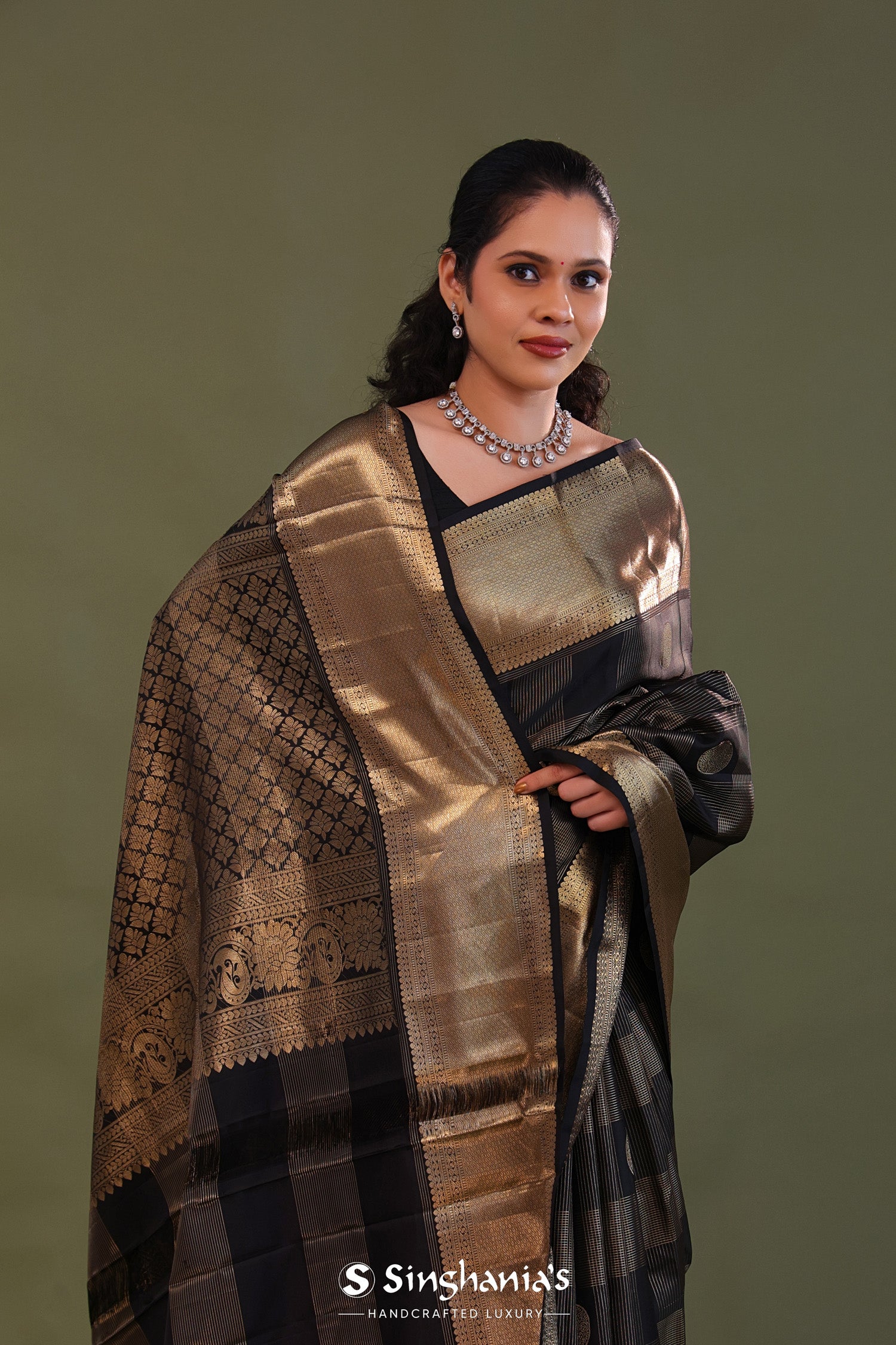The lightweight Black kanjivaram silk saree features butta's and checks pattern spread all across the body ,complemented with gold zari border and unstitched blouse