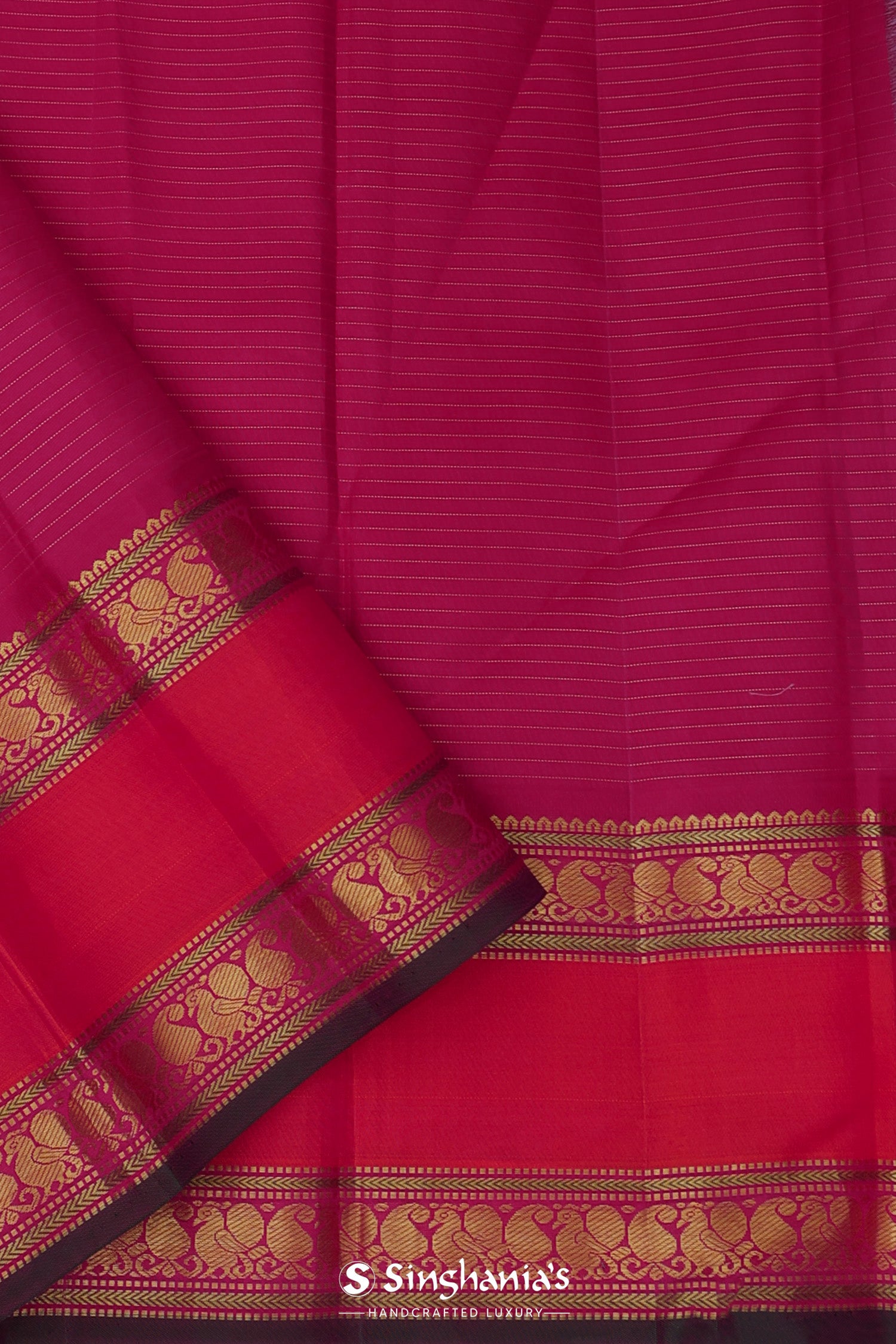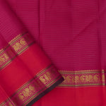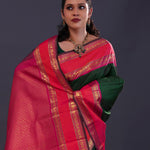 The checks pattern woven on the body of Bottle green kanjivaram silk saree complemented with contrast pink border and unstitched blouse