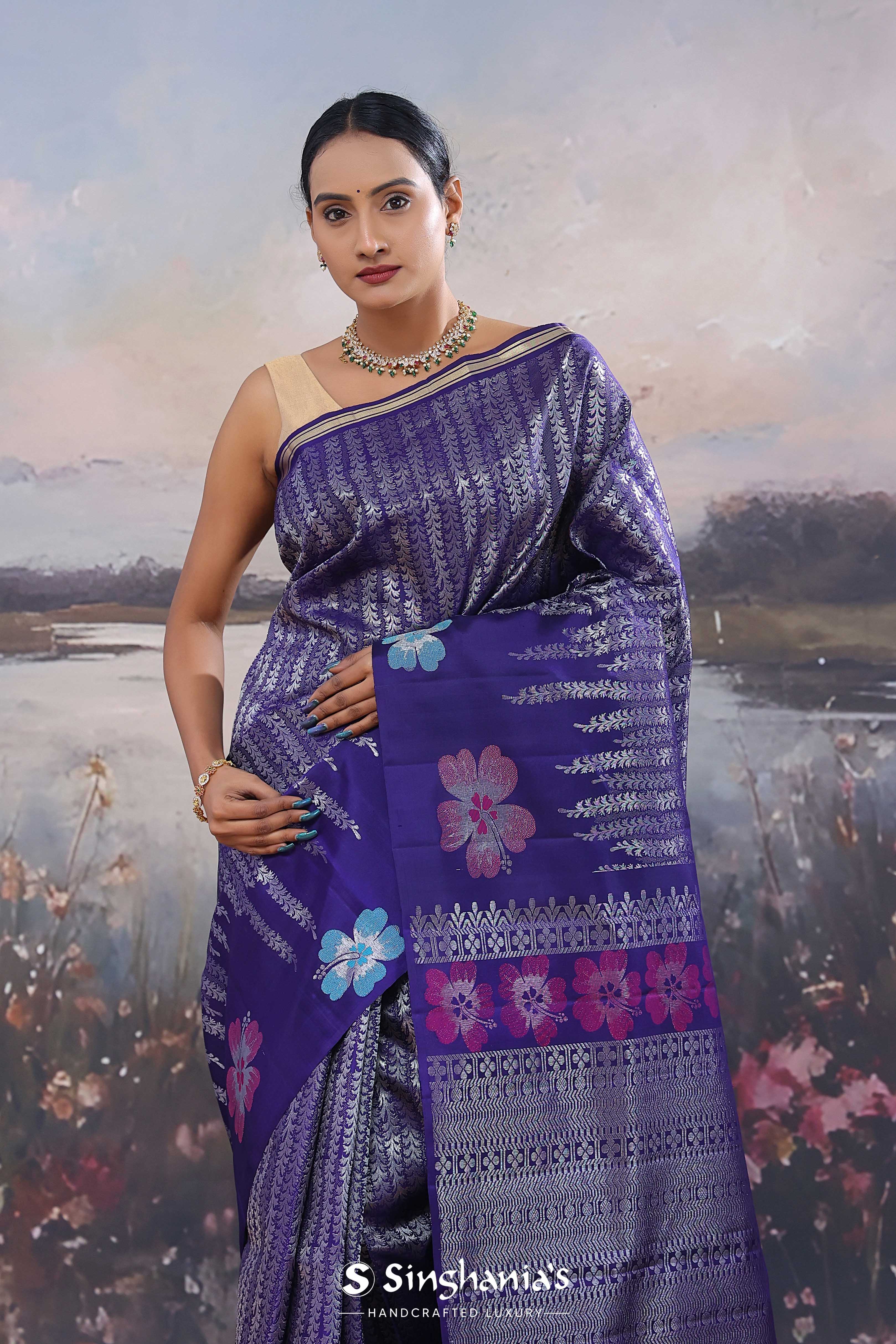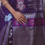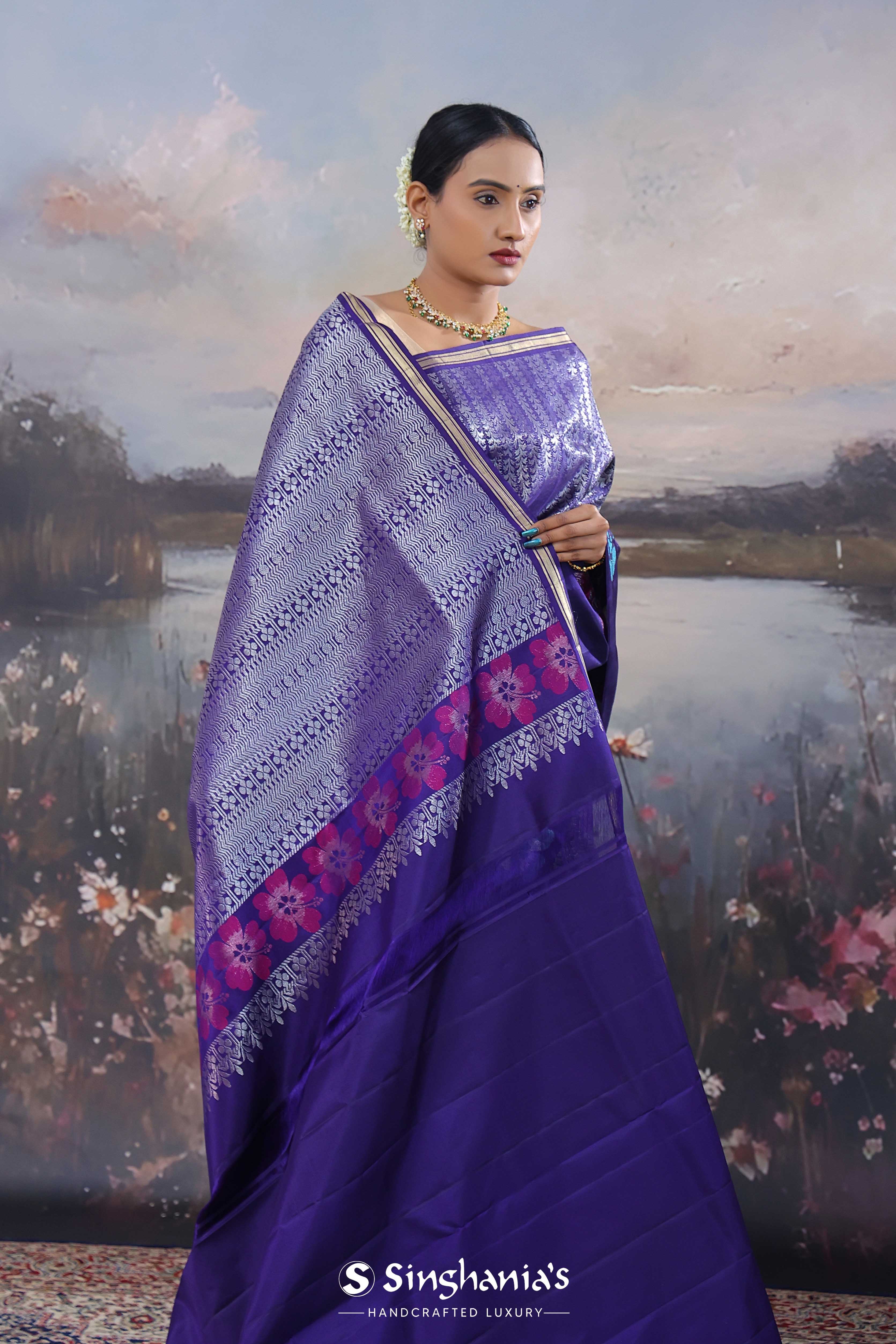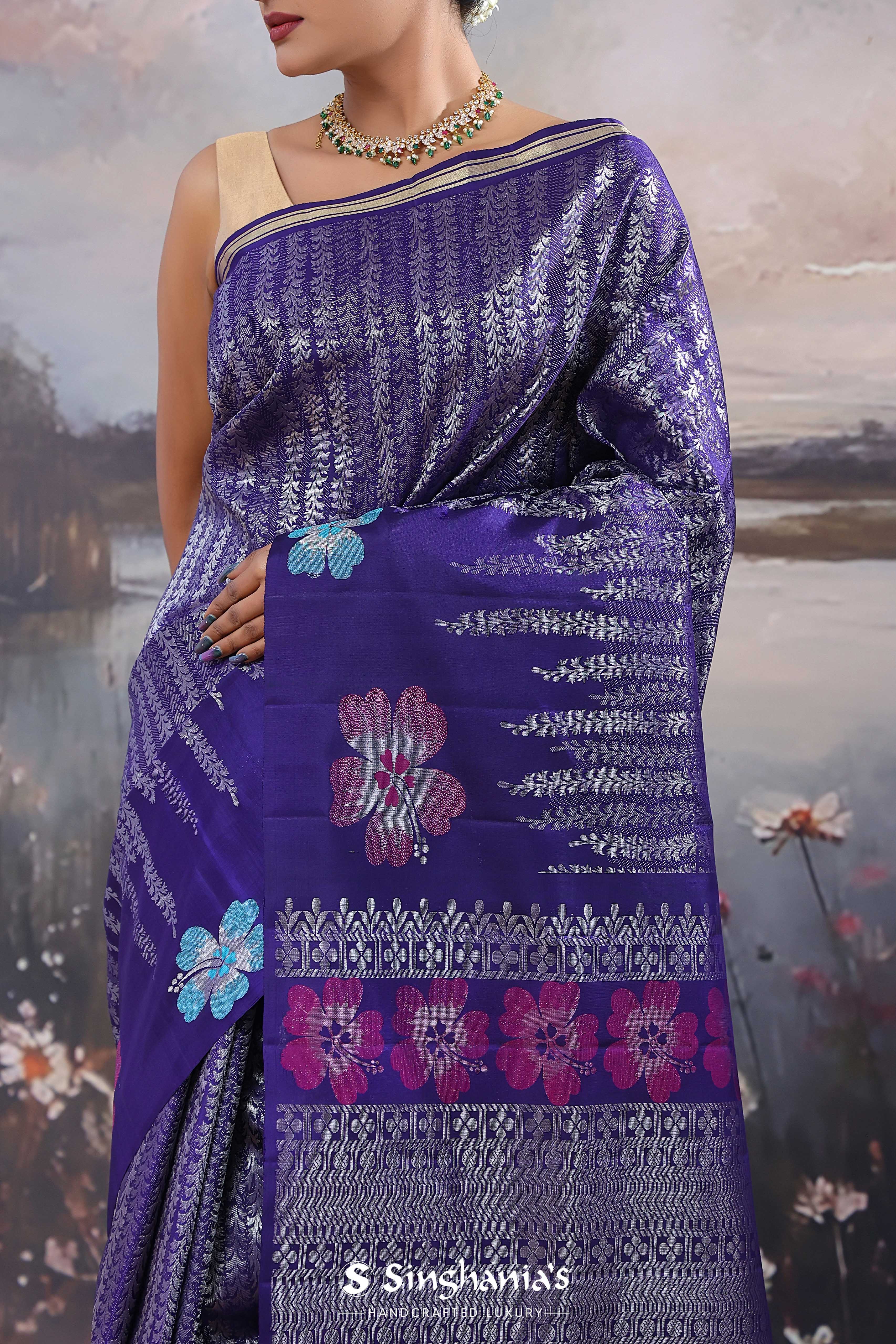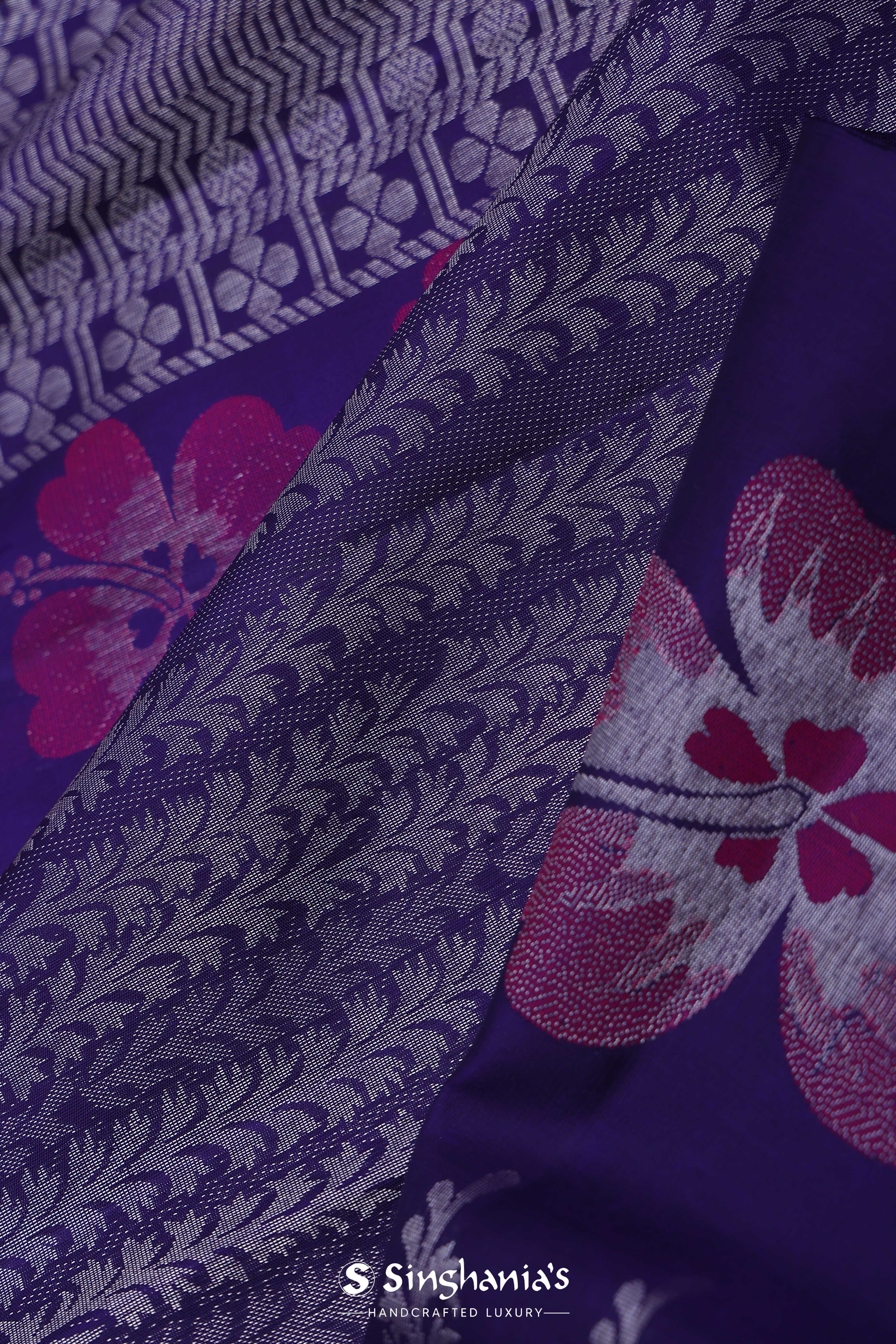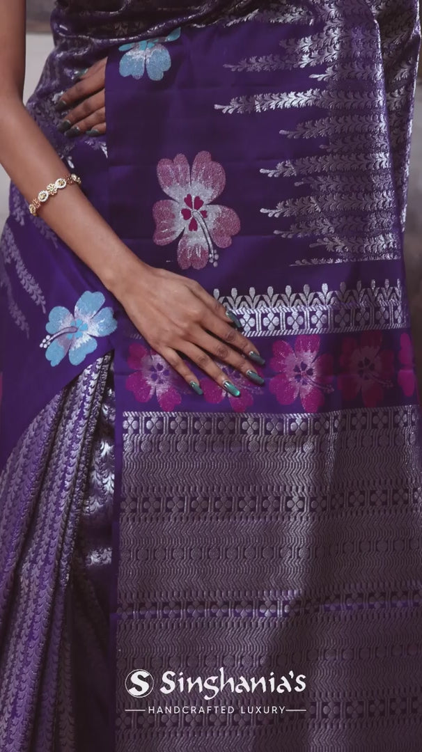 Deep violet kanjivaram saree with simple gold zari border a royal garment presents a floral designs aligned vertically to each other covering the entire body of the saree with magnificent pink flowers adorned at the pallu of the saree, adds the finishing touch for a modern look.
