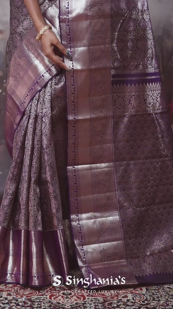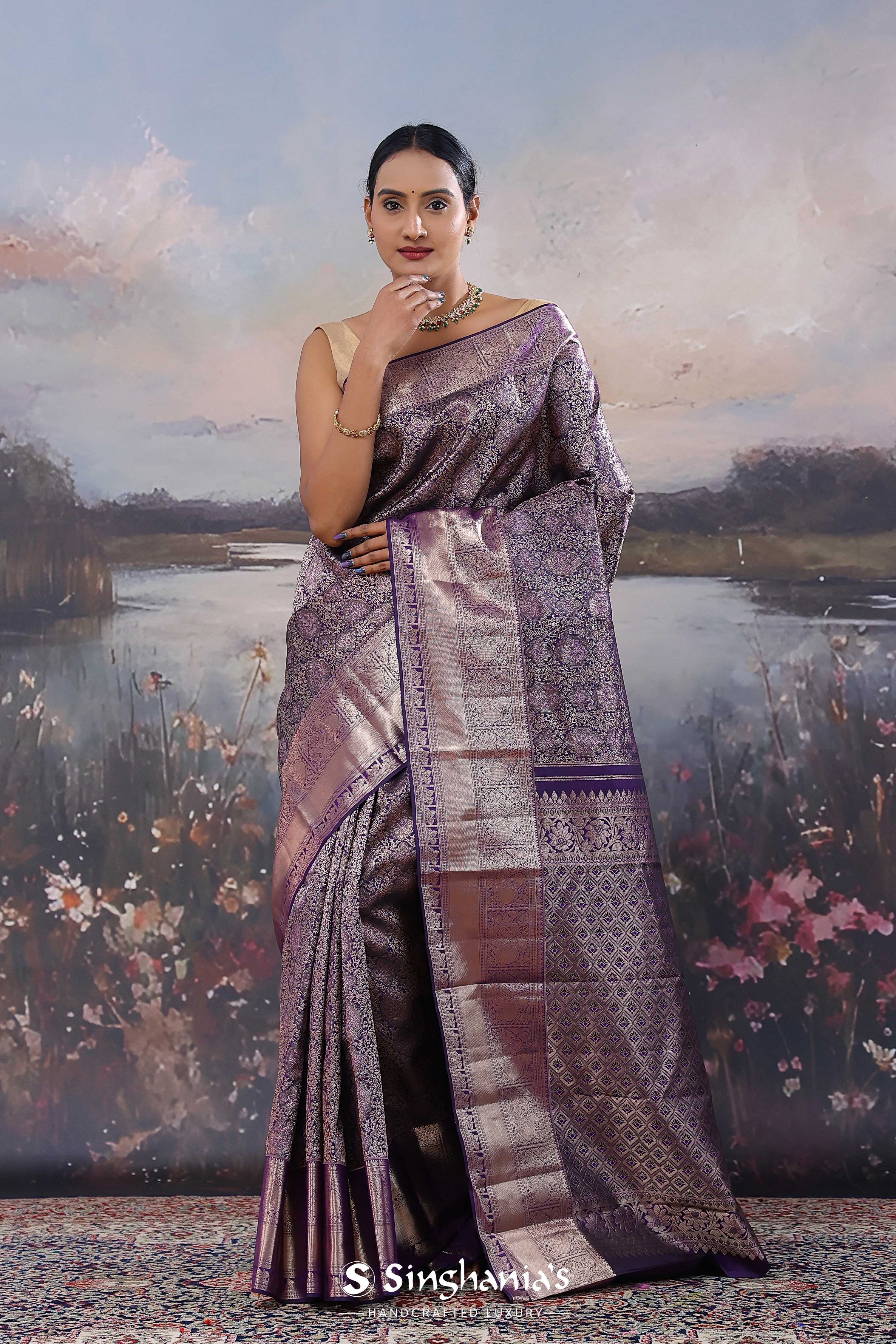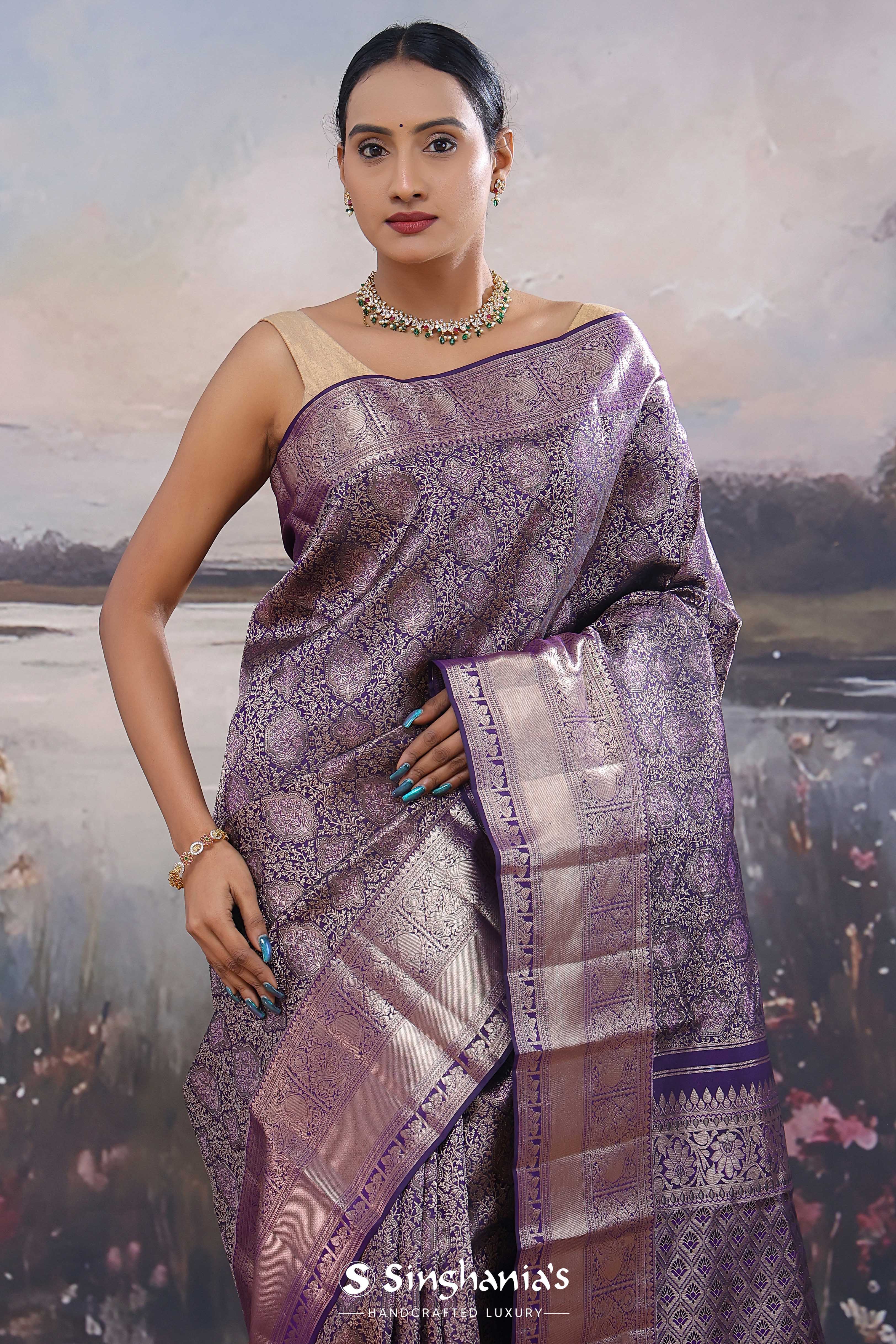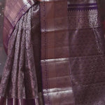The radiant look emitted by the silk base of the Deep violet kanjivaram saree.This saree features intricate zari work woven on the body makes it stand out from other saree complemented with the multiple sections of the border which is adorned with peacock design and making every moment picture perfect.