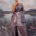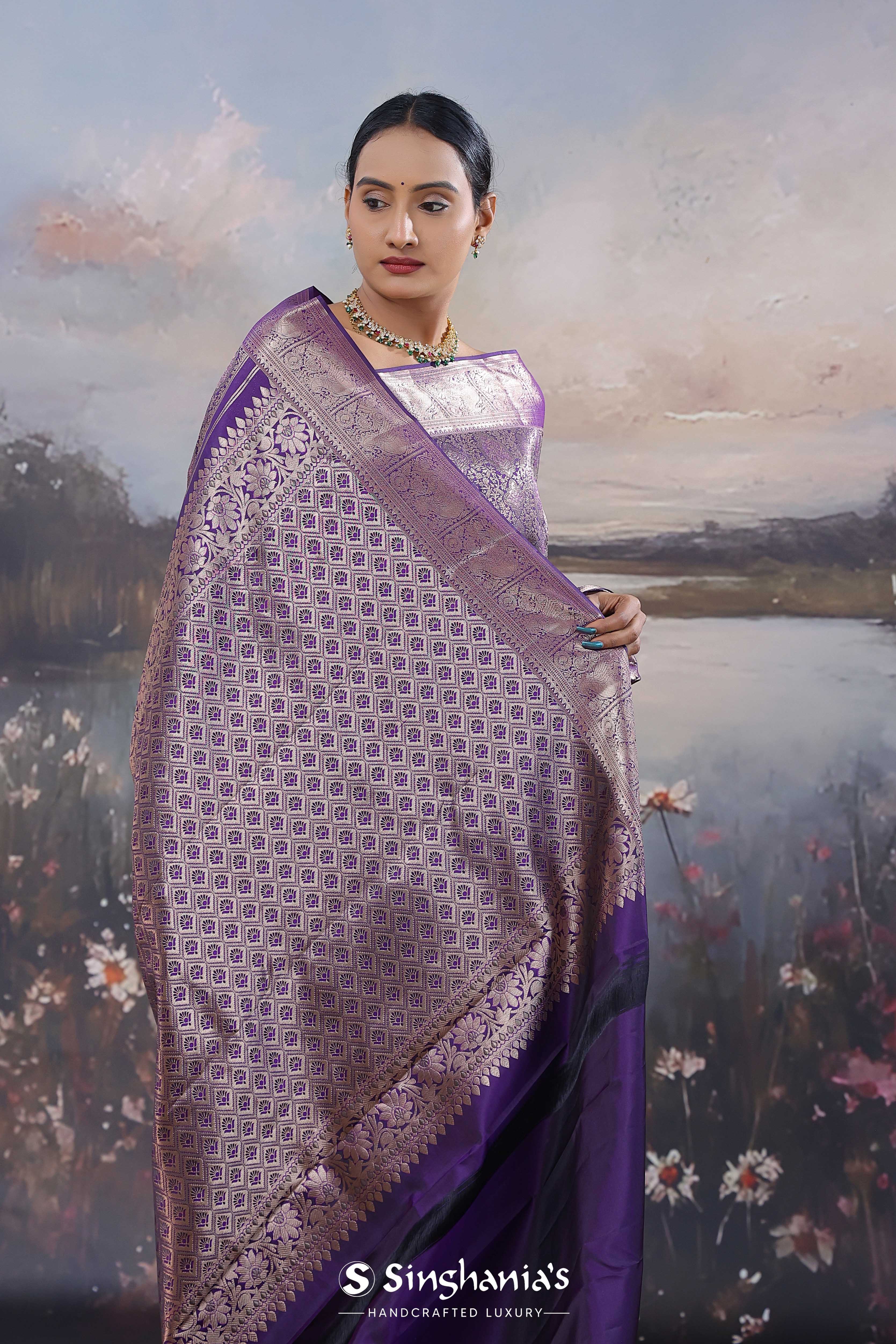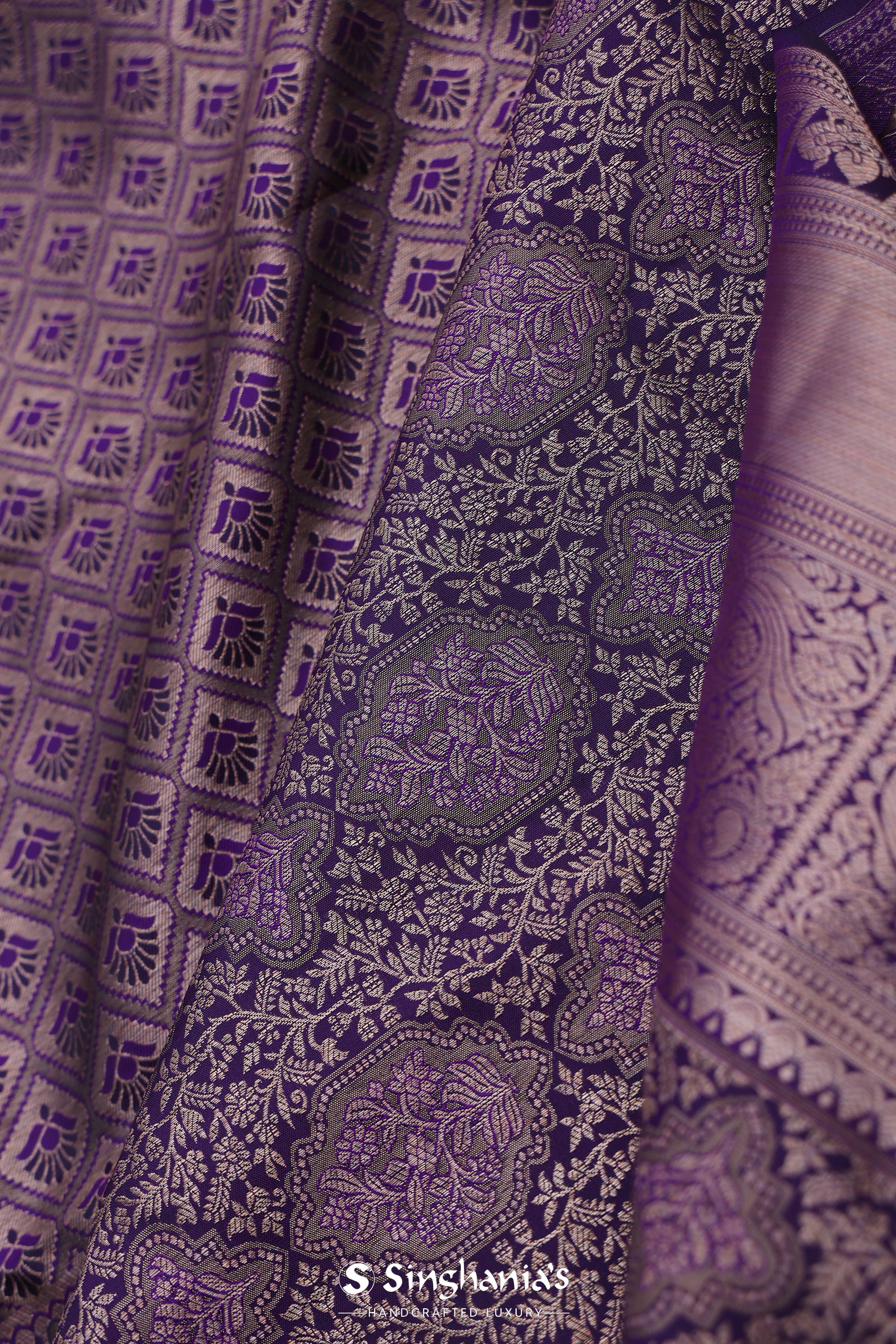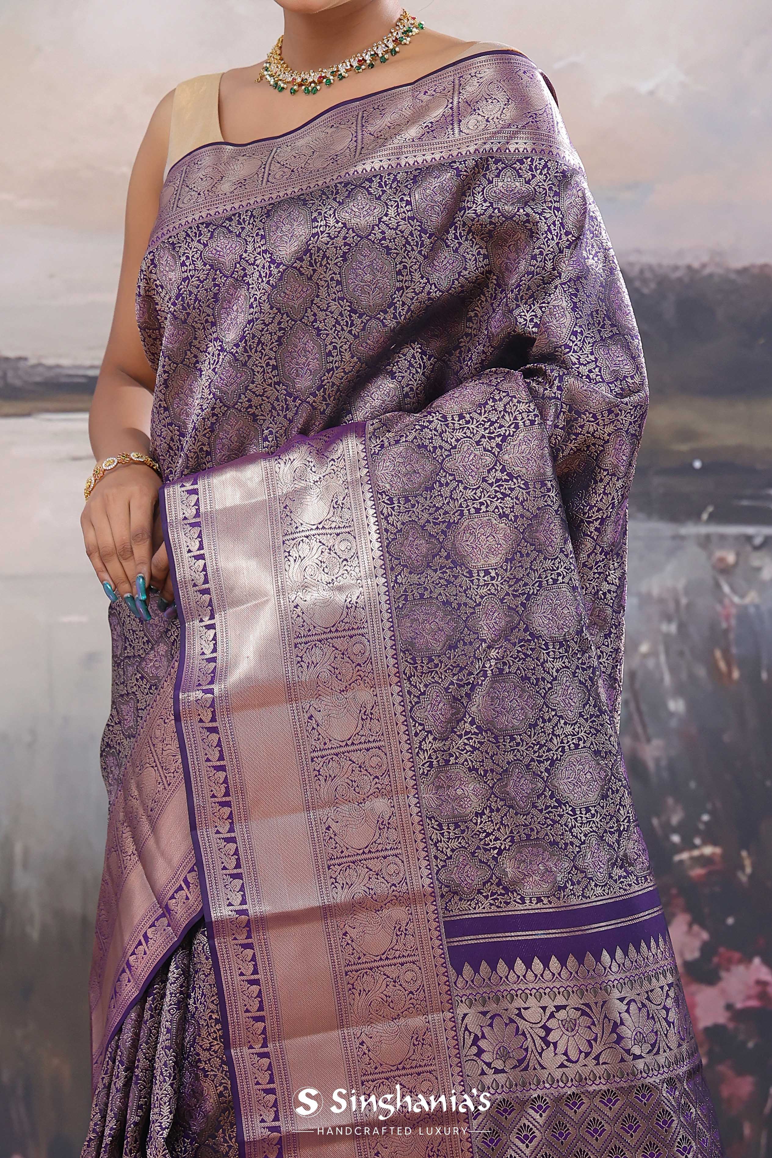 The radiant look emitted by the silk base of the Deep violet kanjivaram saree.This saree features intricate zari work woven on the body makes it stand out from other saree complemented with the multiple sections of the border which is adorned with peacock design and making every moment picture perfect.