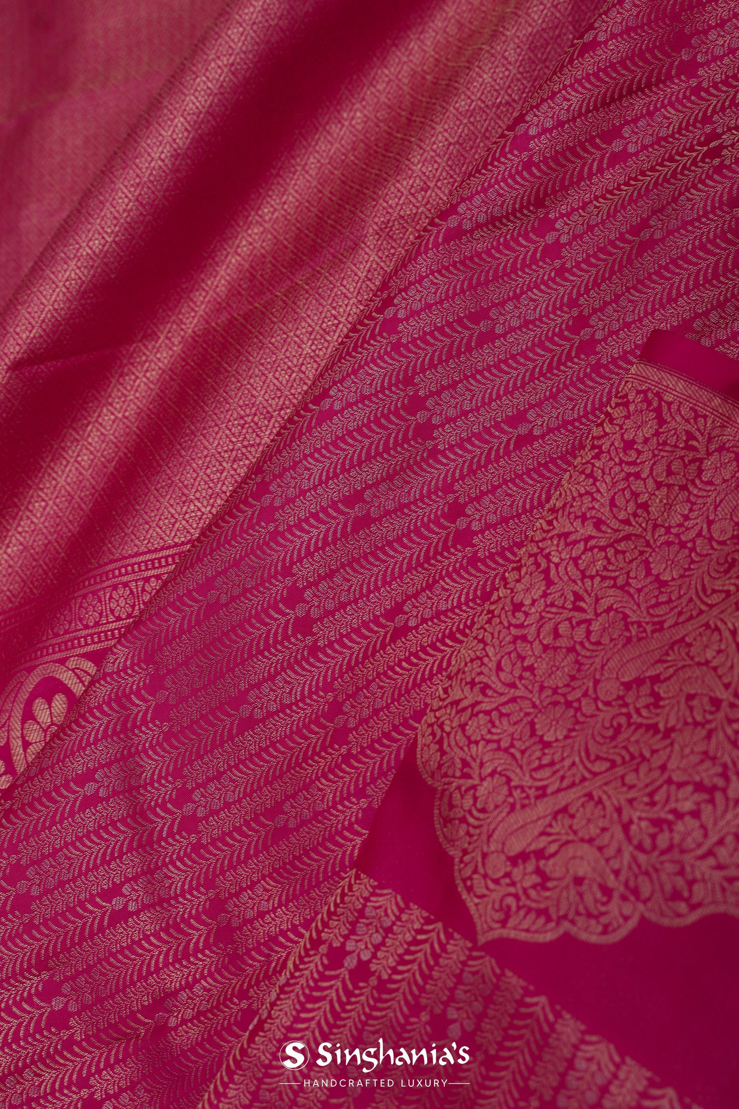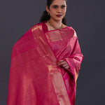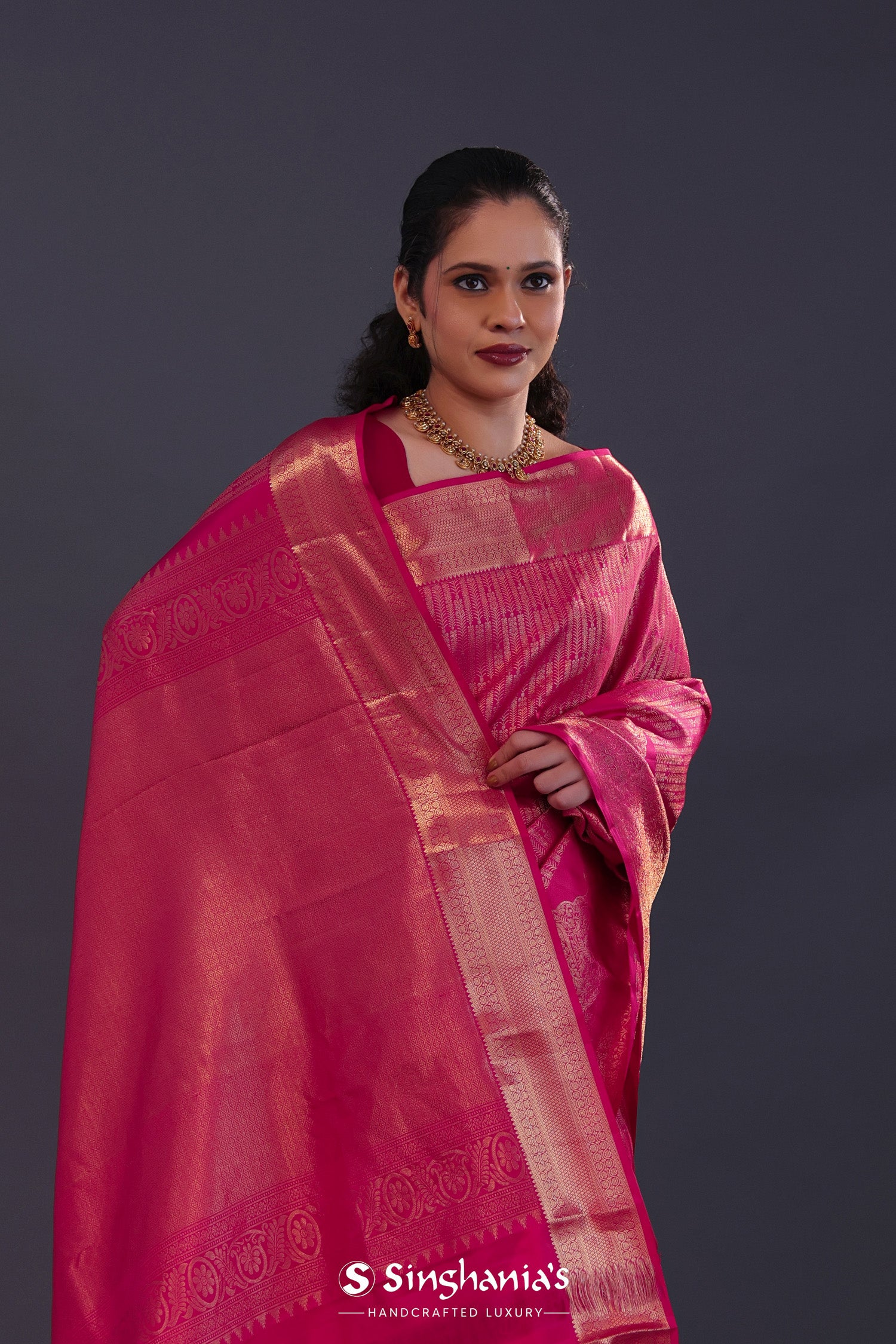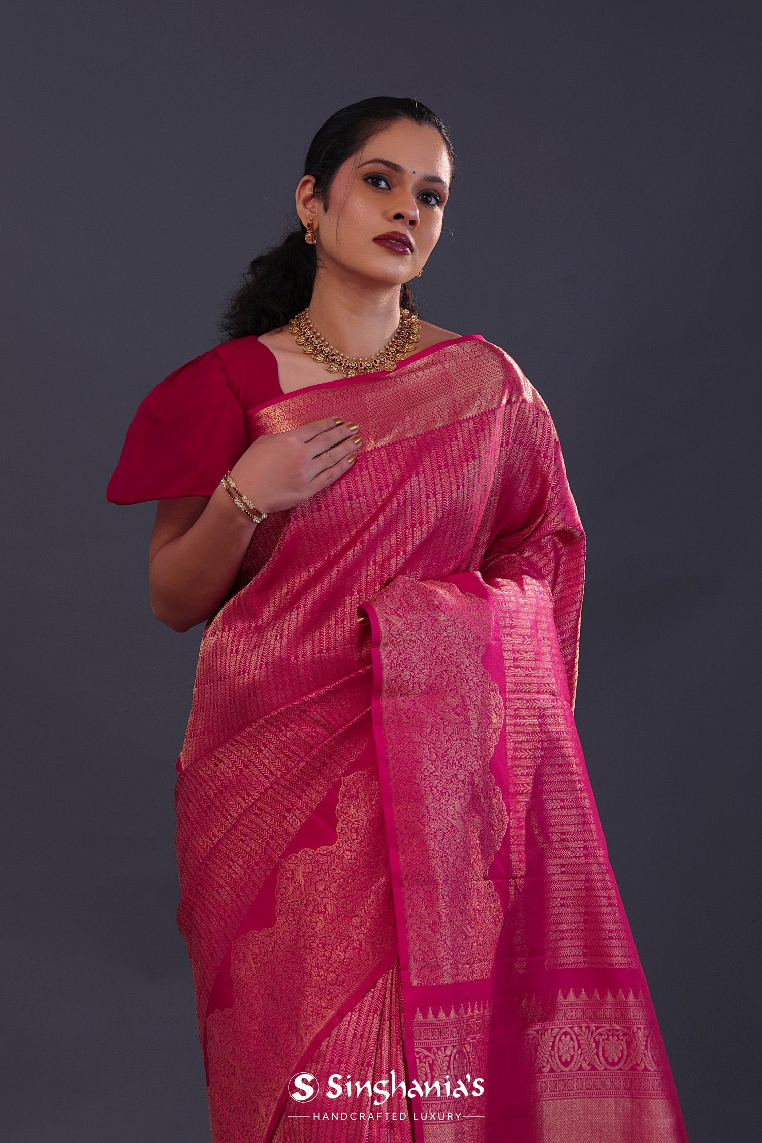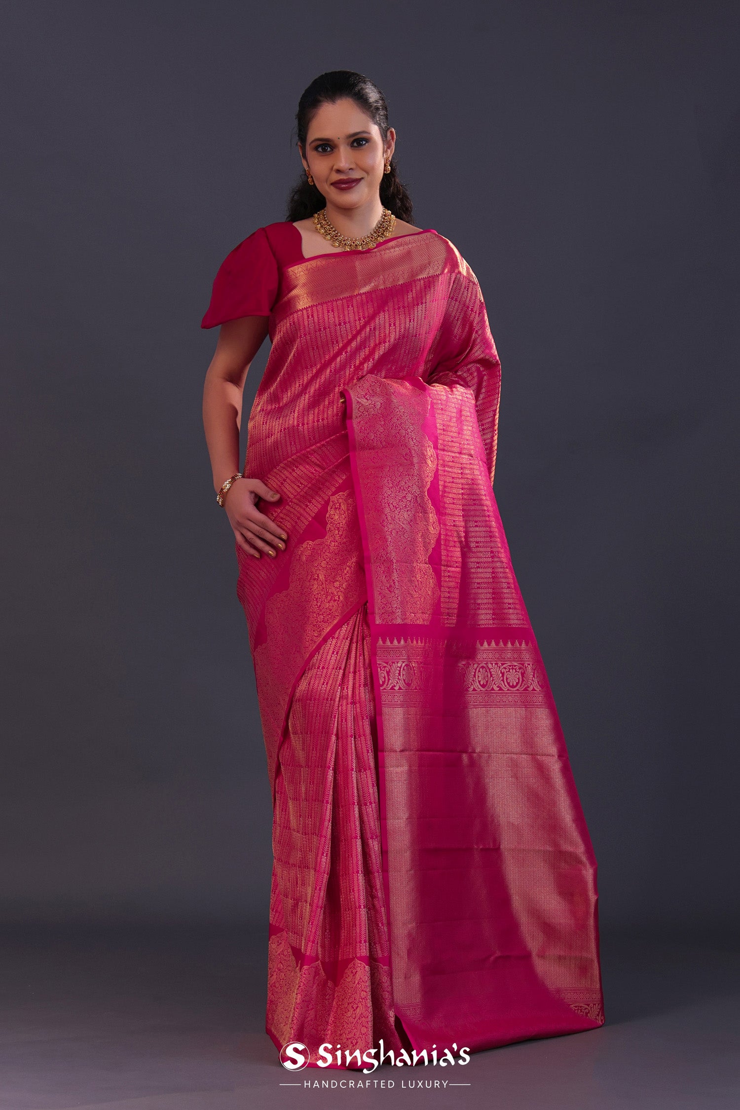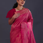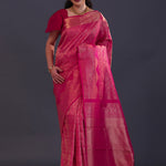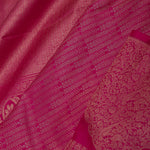 Purple red Kanjivaram silk saree features gold zari border and densely woven with silver zari complemented with unstitched blouse