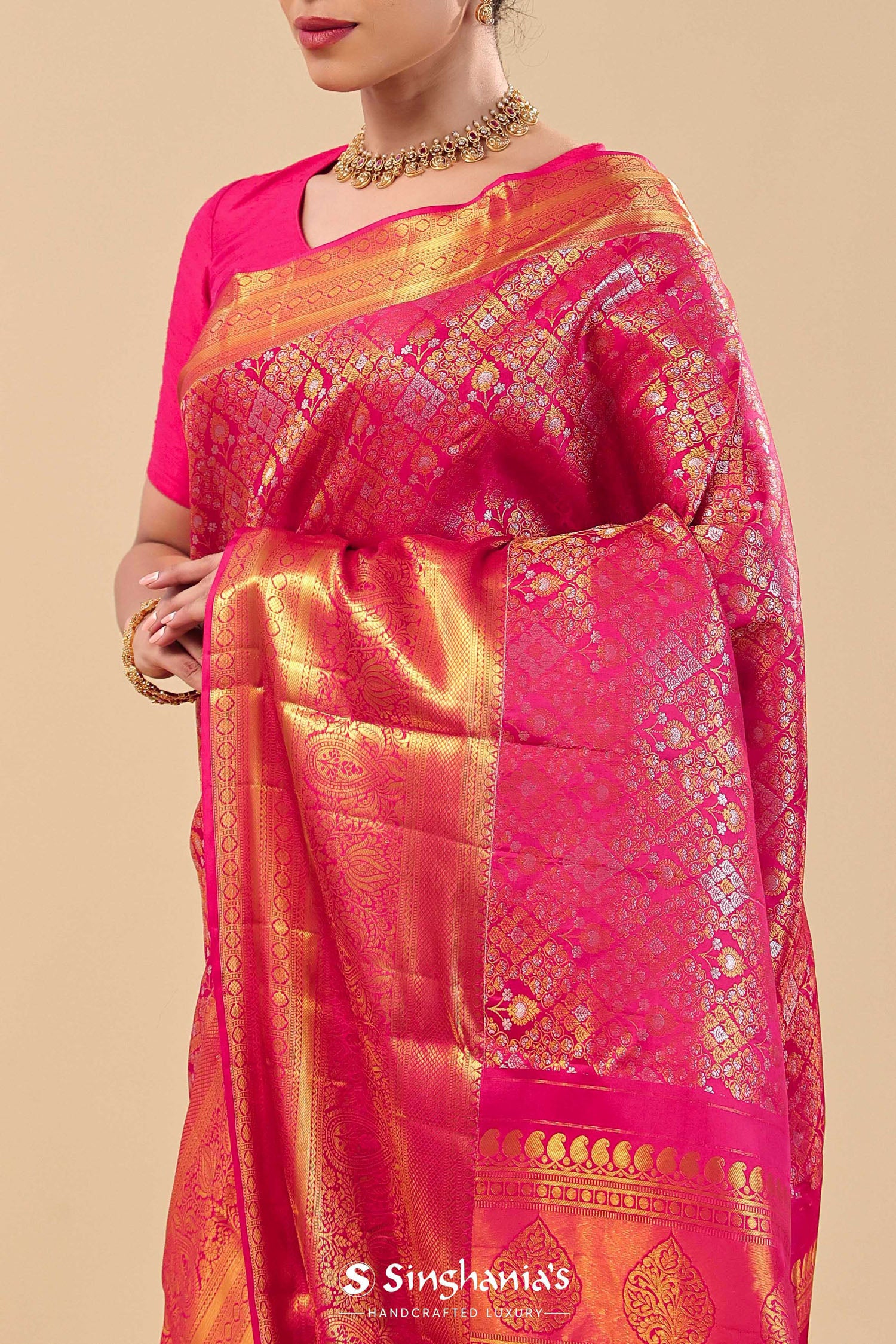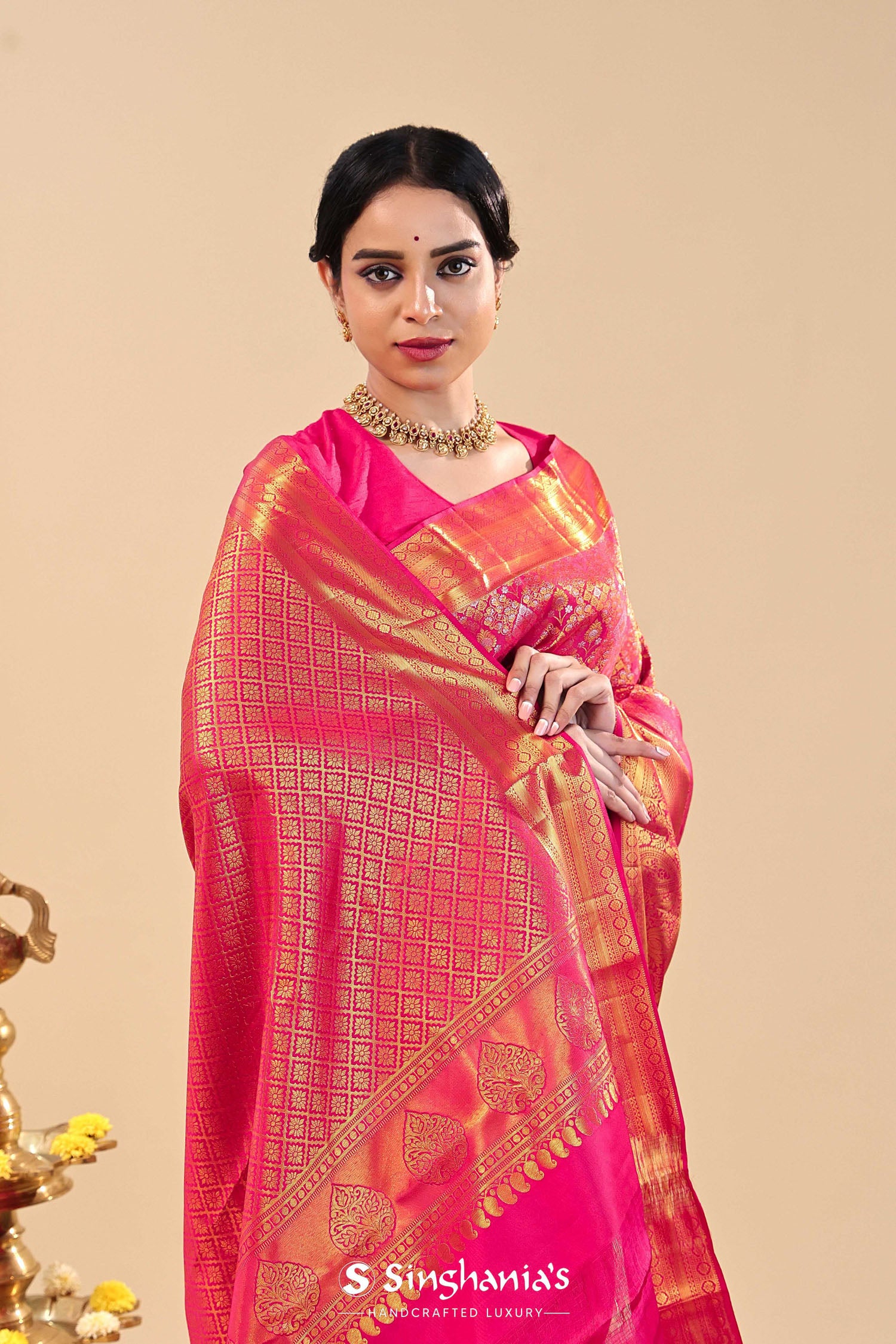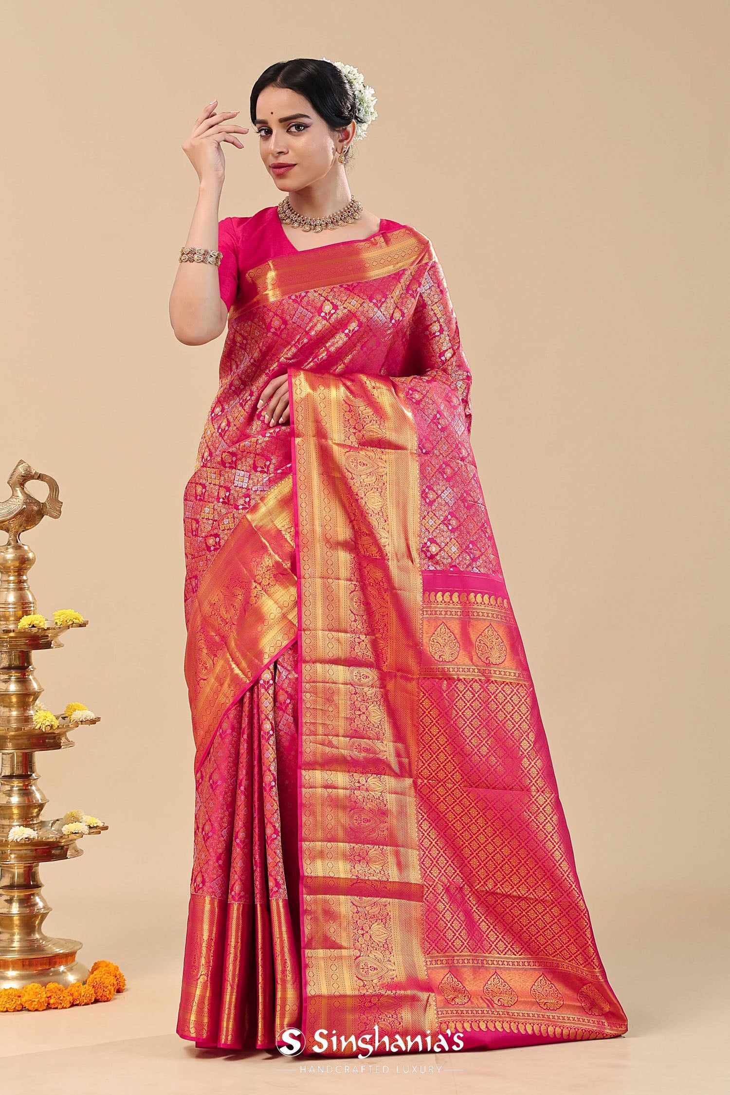 Raspberry pink kanjivaram saree features densely woven patterns of floral and geometric designs along with solid golden border with repetitive designs making it look ideal choice for any occasions