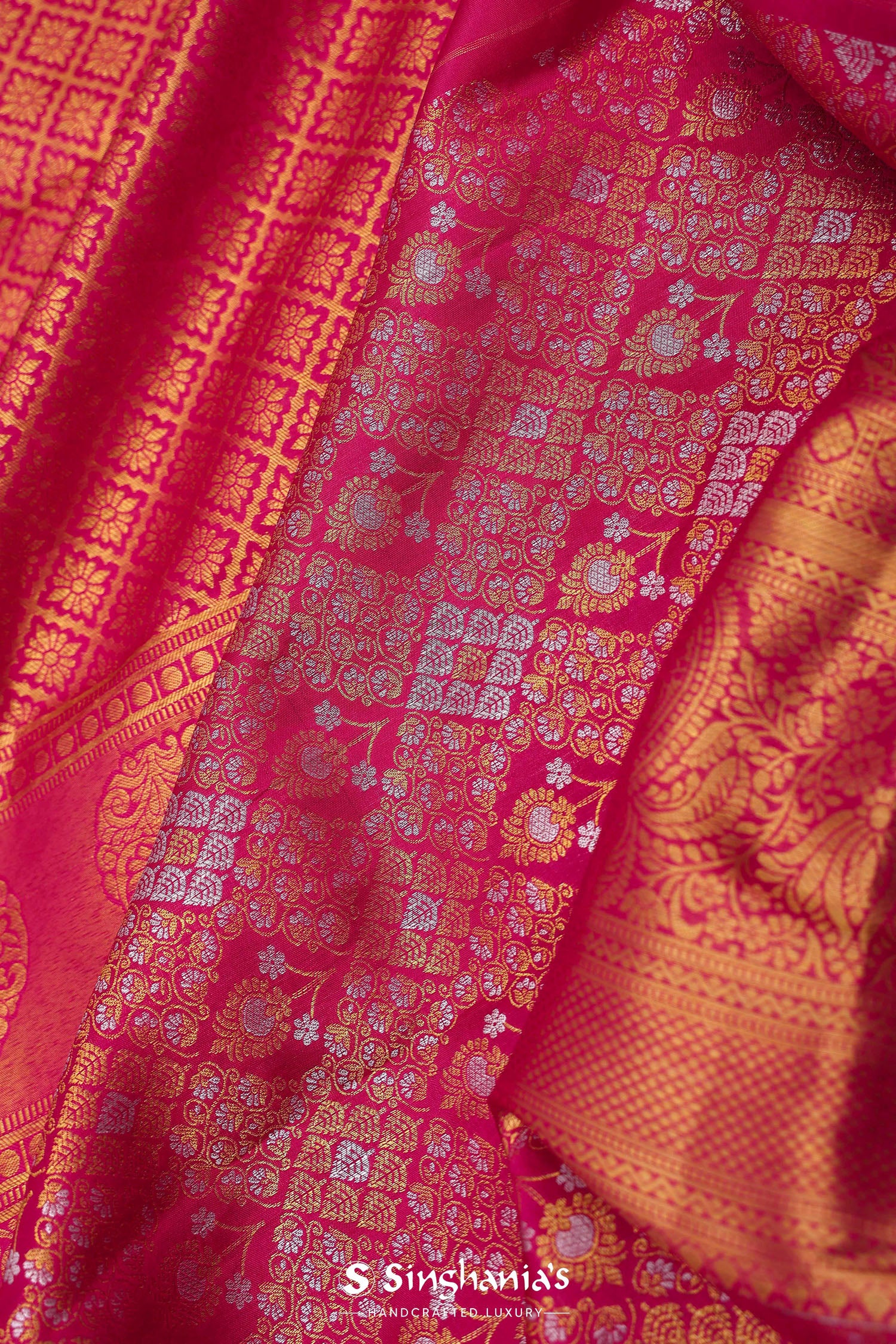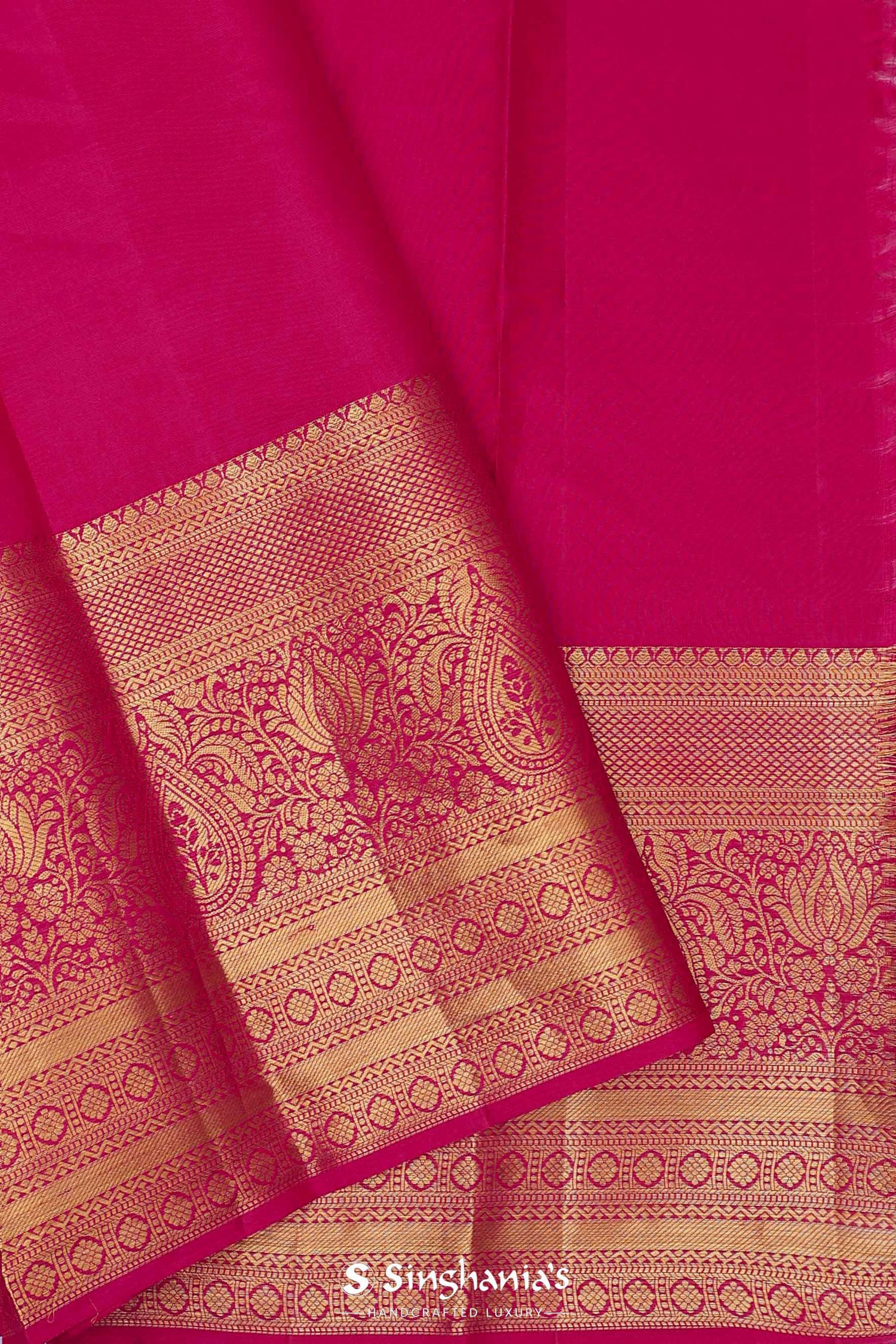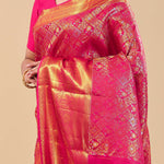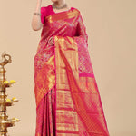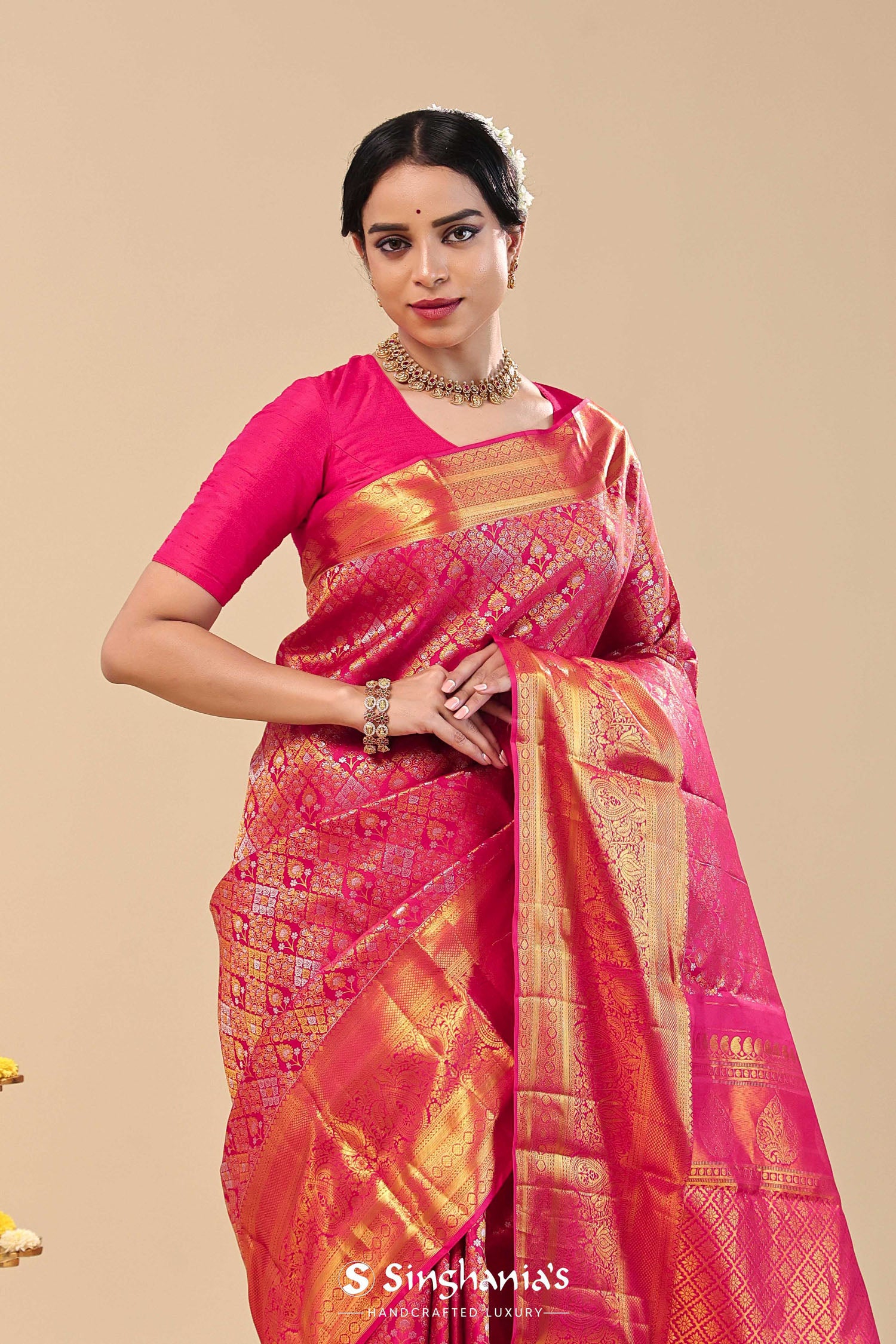 Raspberry pink kanjivaram saree features densely woven patterns of floral and geometric designs along with solid golden border with repetitive designs making it look ideal choice for any occasions
