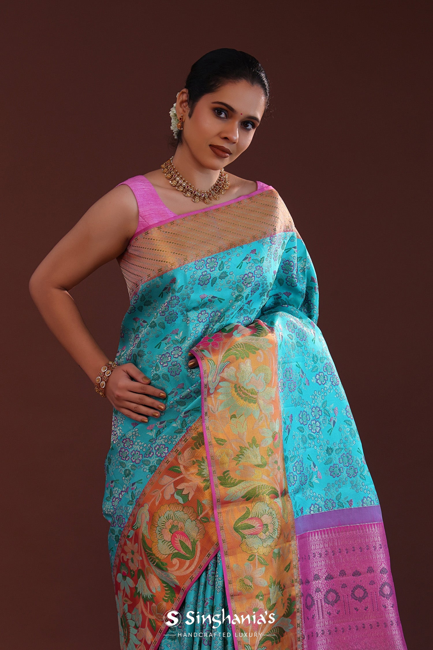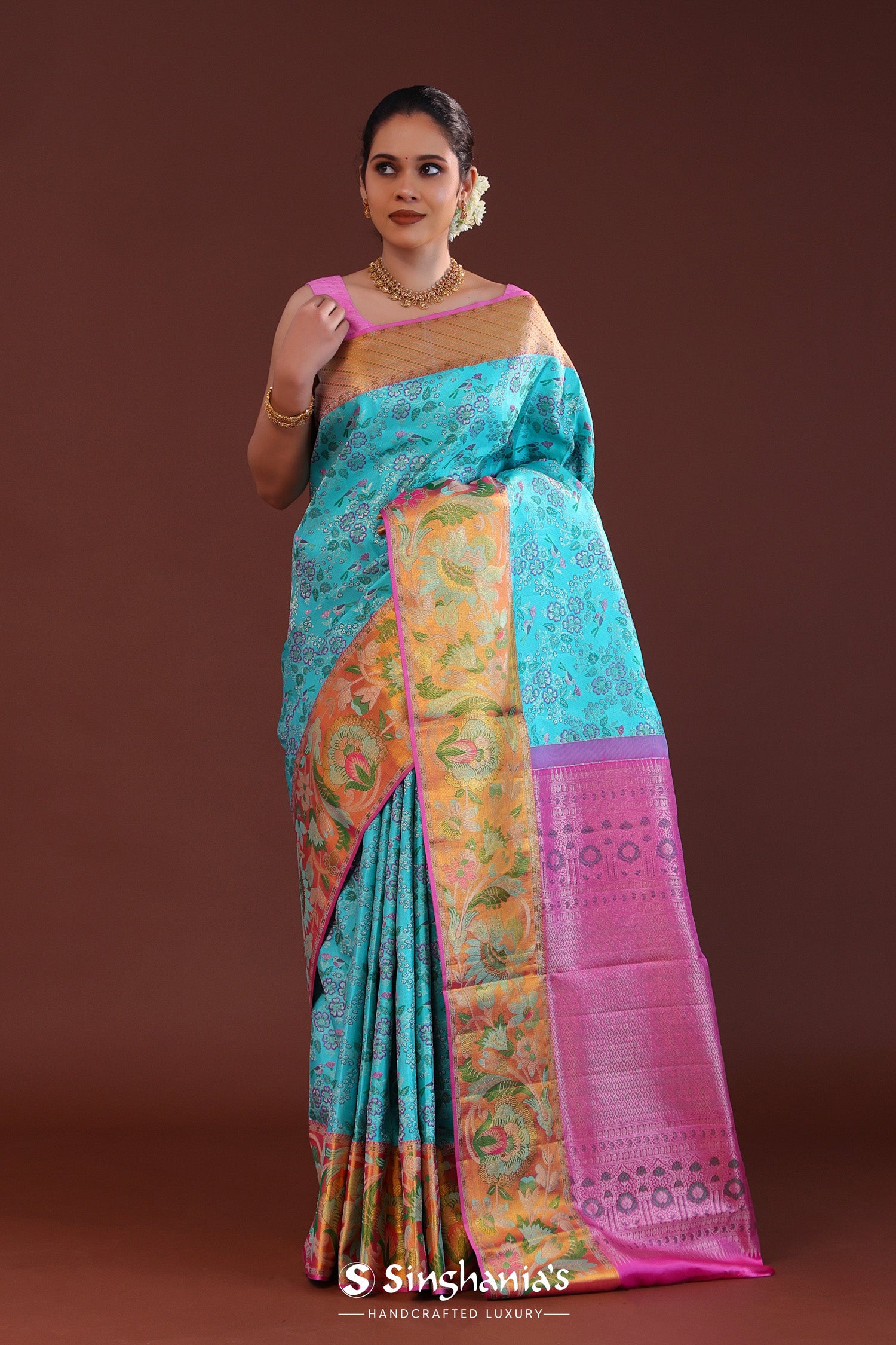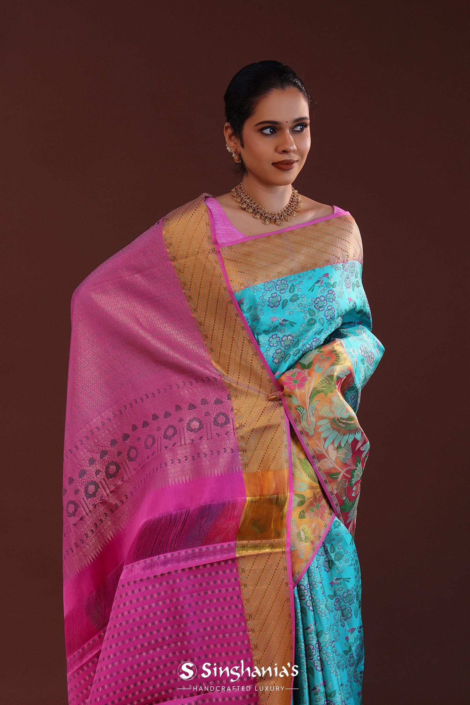 The floral patterns woven on the body of the Sky blue kanjivaram silk saree complemented with contrast golden border adorned with floral pattern, pink pallu and contrast unstitched blouse
