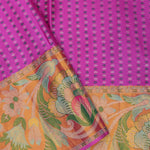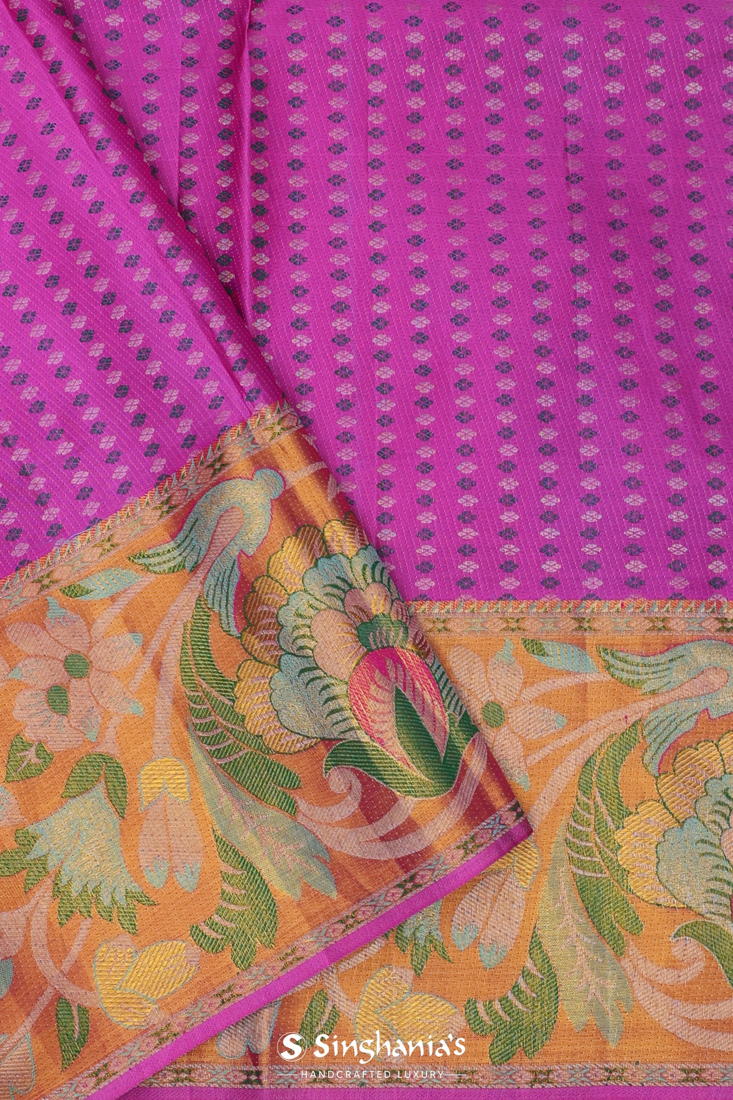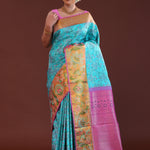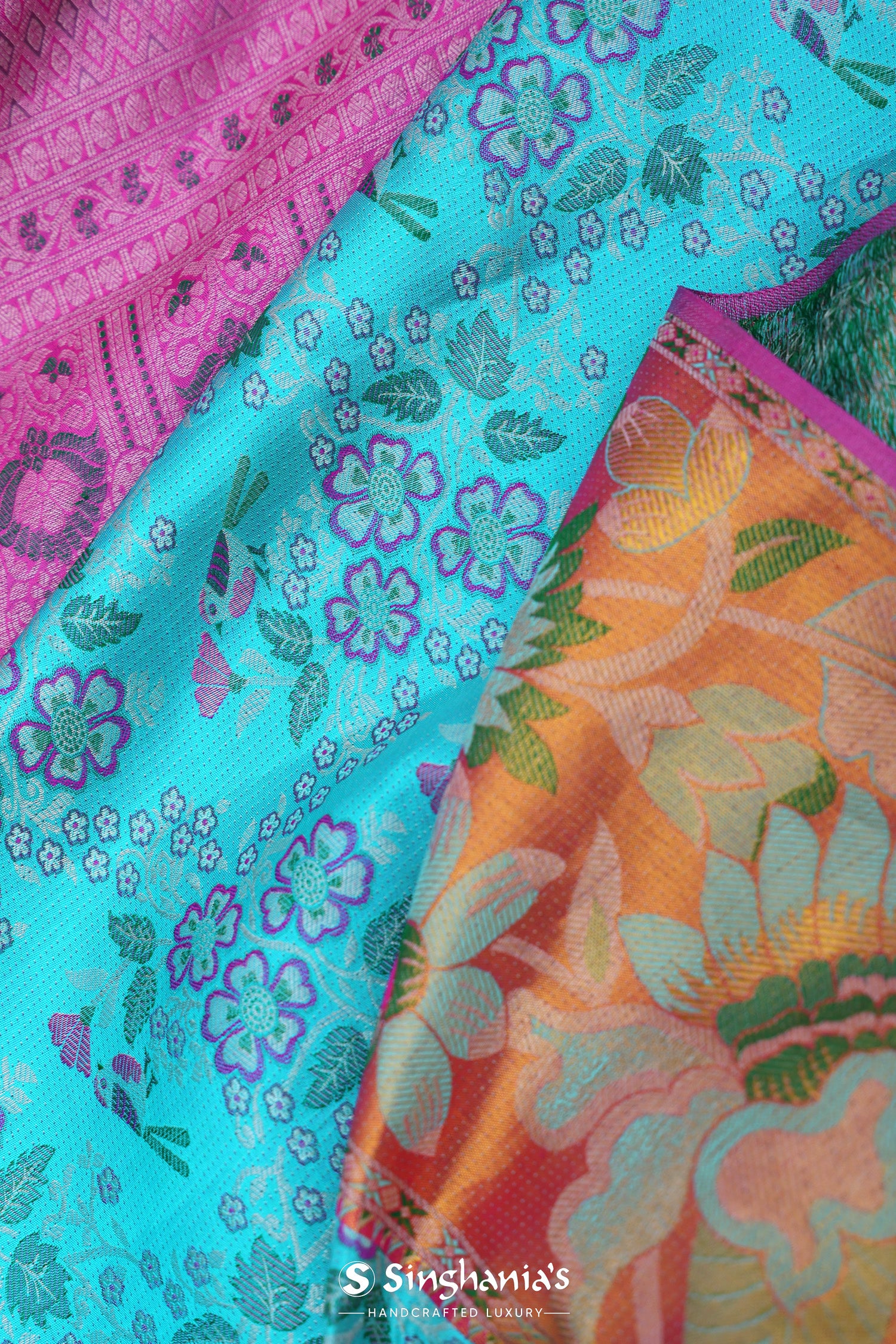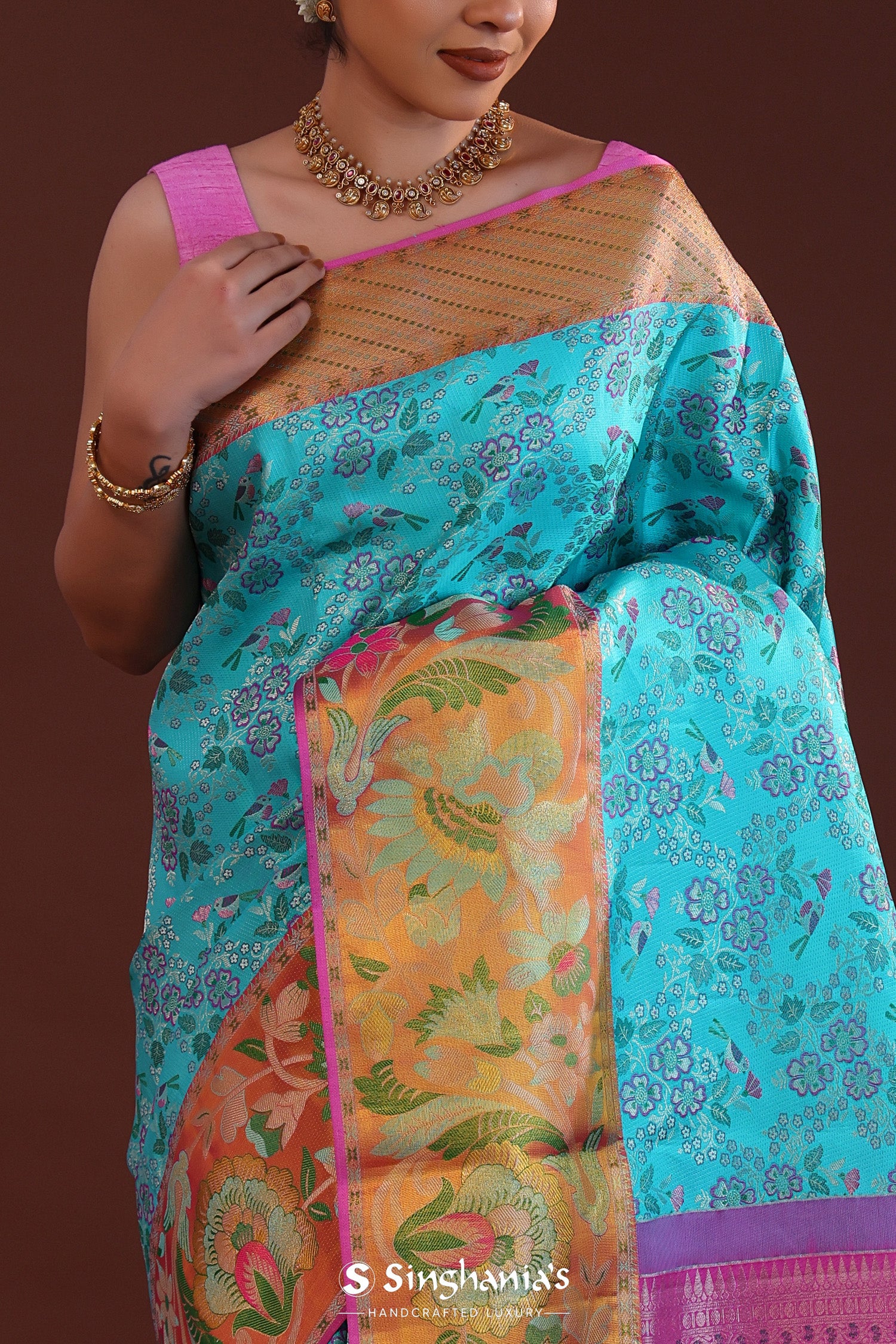 The floral patterns woven on the body of the Sky blue kanjivaram silk saree complemented with contrast golden border adorned with floral pattern, pink pallu and contrast unstitched blouse