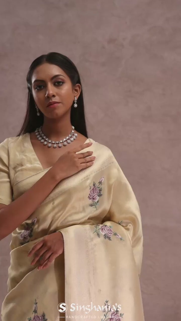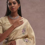 This soft beige Banarasi saree exudes understated elegance, featuring fine petit point butti motifs woven delicately across the body with gold zari work at border . Crafted from soft Banarasi fabric, it blends traditional charm with timeless sophistication—perfect for graceful, minimal occasions.