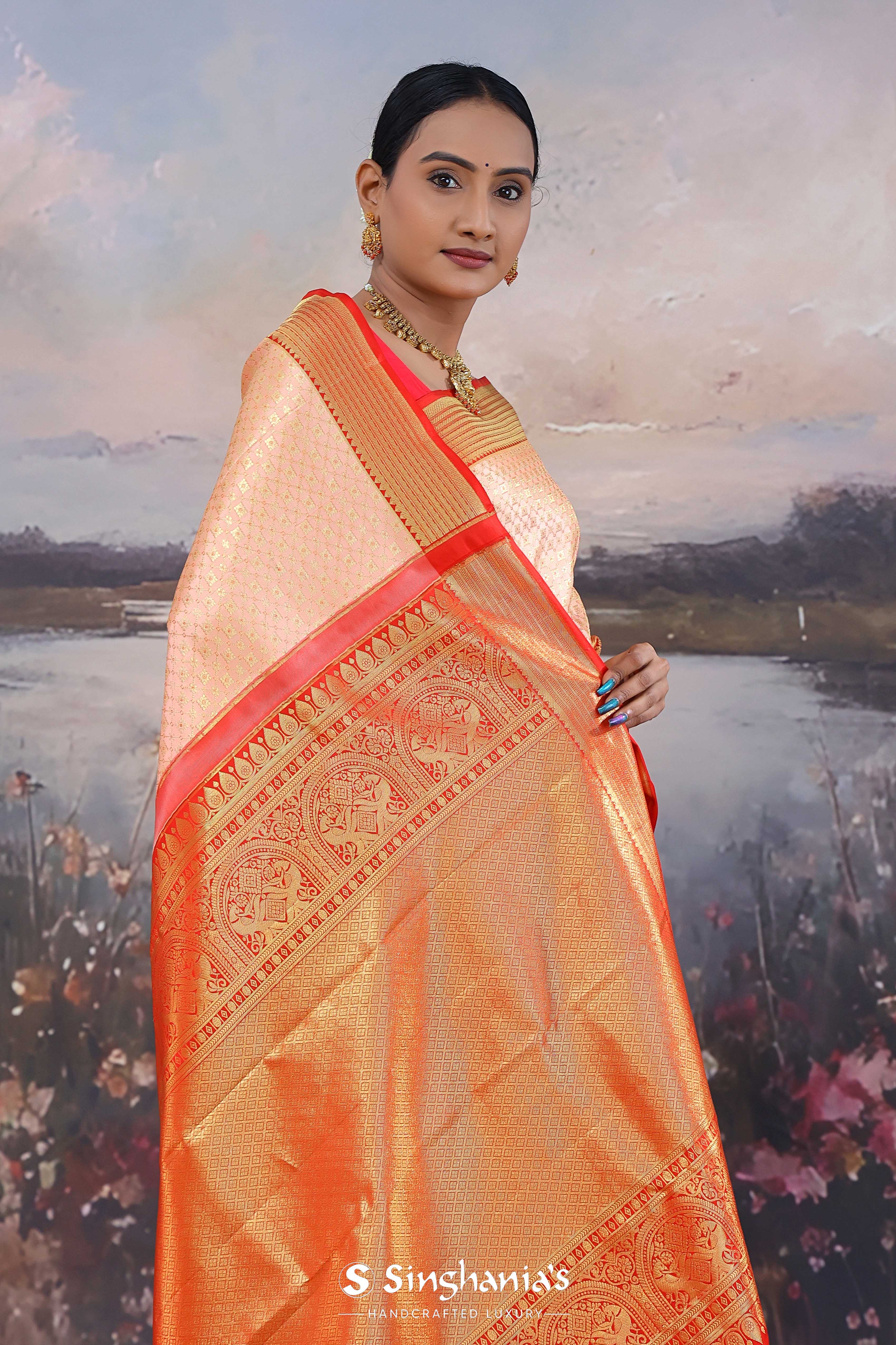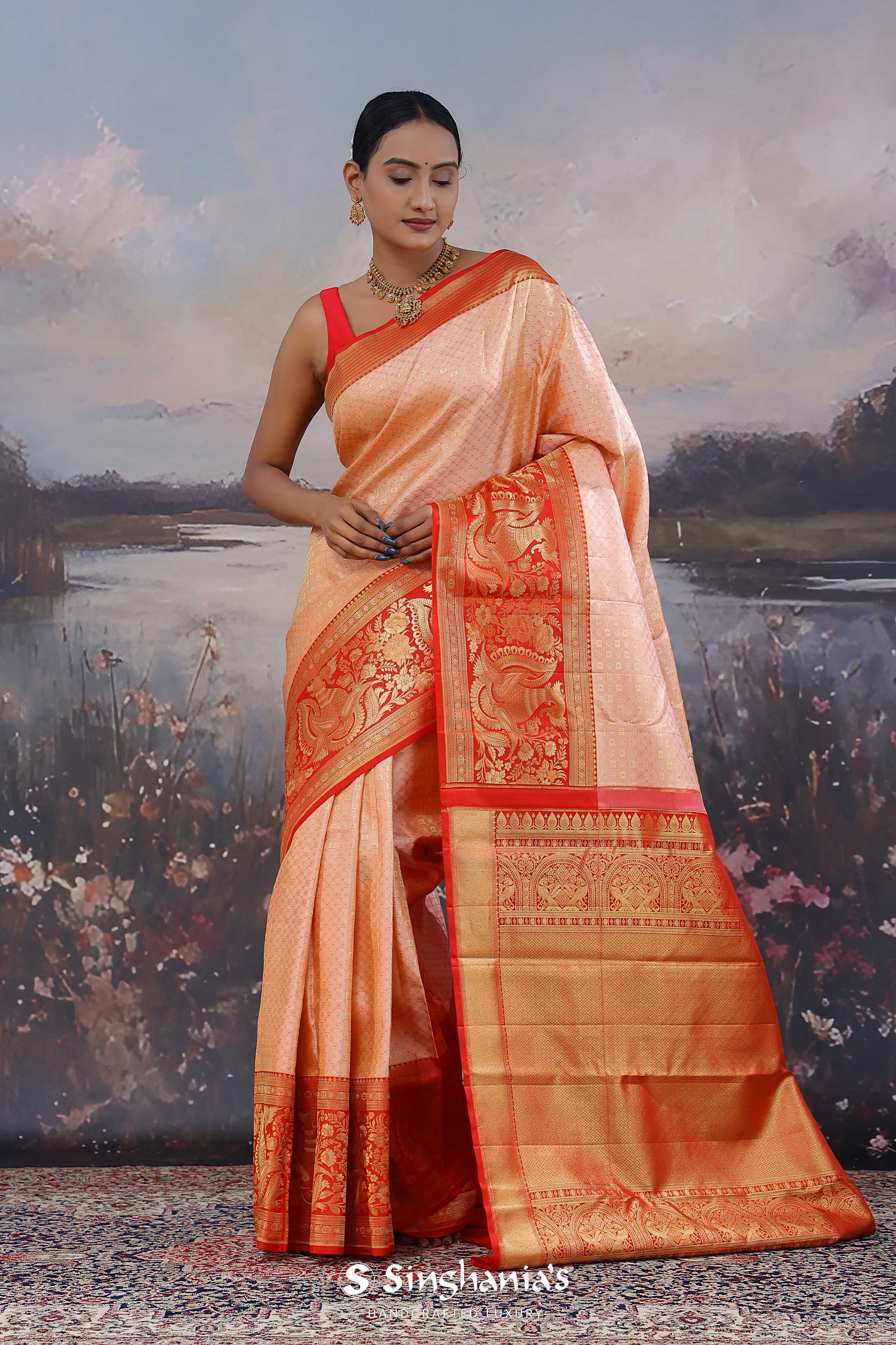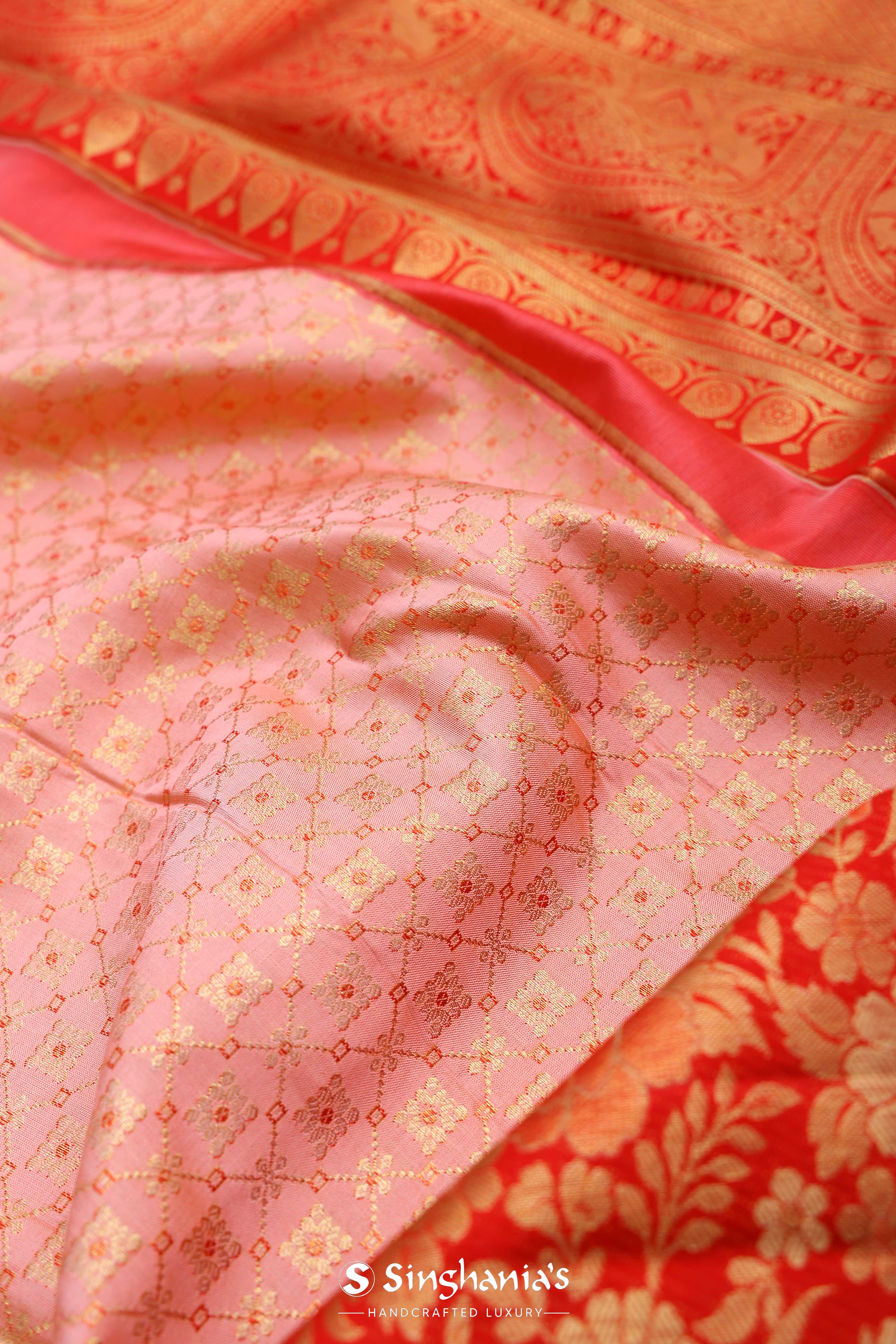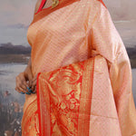 The authentic silk base of the Soft pink kanjivaram saree featuring repeated patterns of diamond shaped motif woven with contrast red border and pallu which is adorned with gold zari work making it every moment festive.
