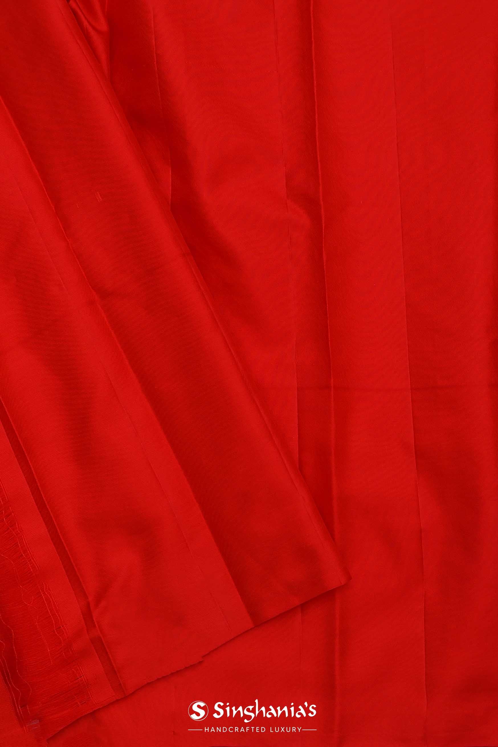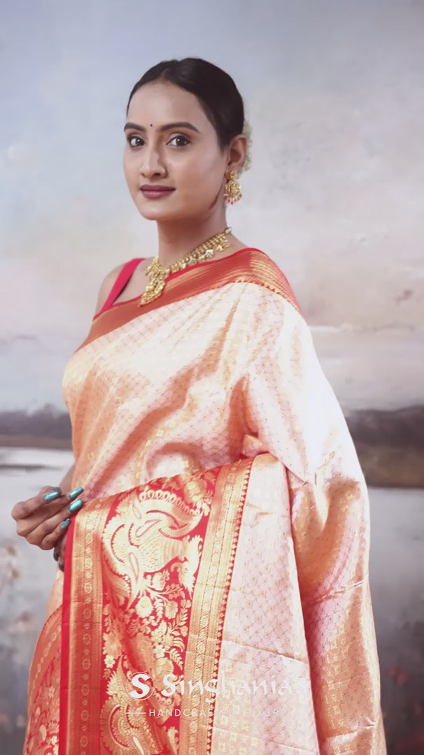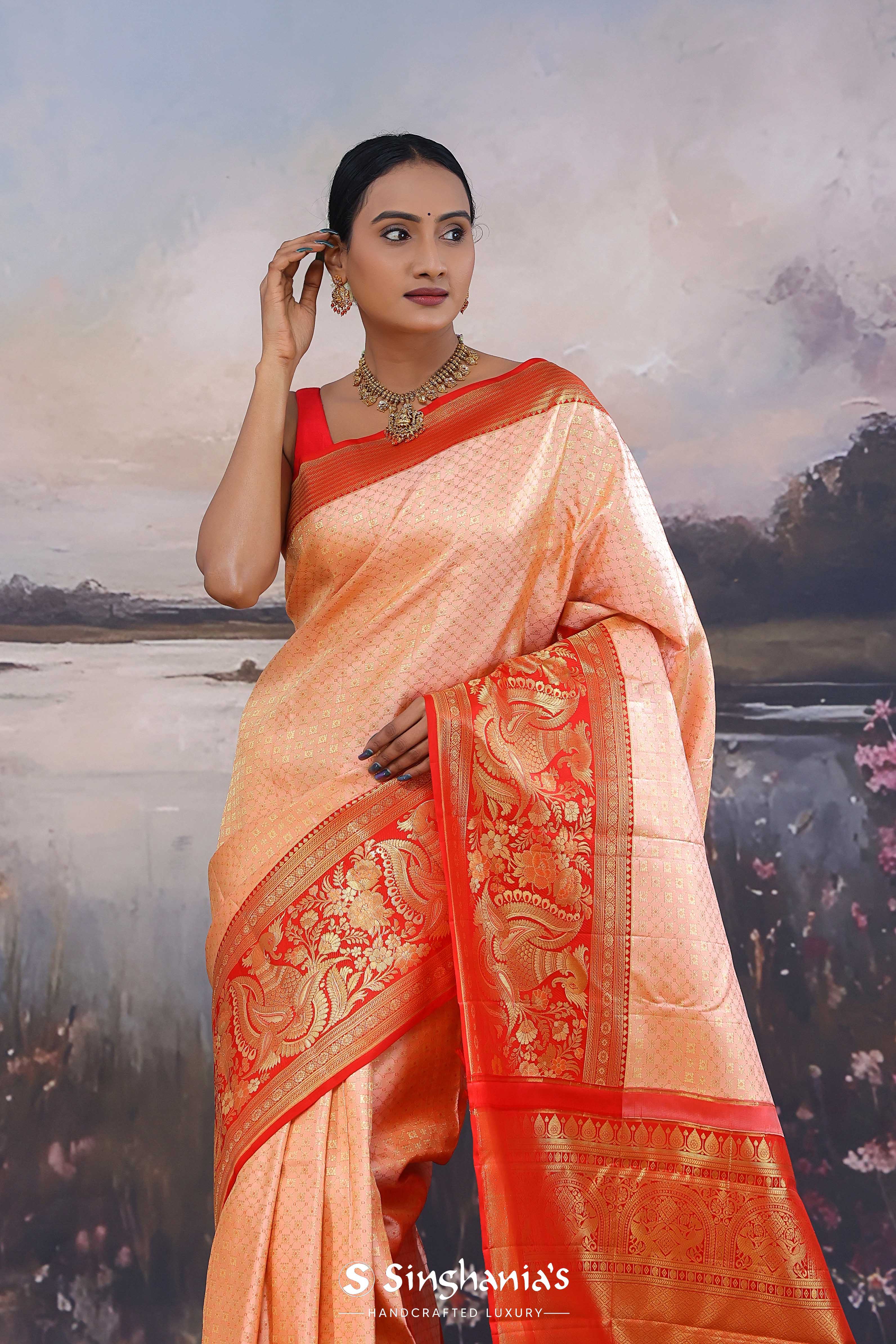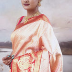 The authentic silk base of the Soft pink kanjivaram saree featuring repeated patterns of diamond shaped motif woven with contrast red border and pallu which is adorned with gold zari work making it every moment festive.