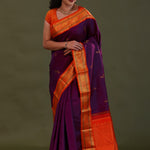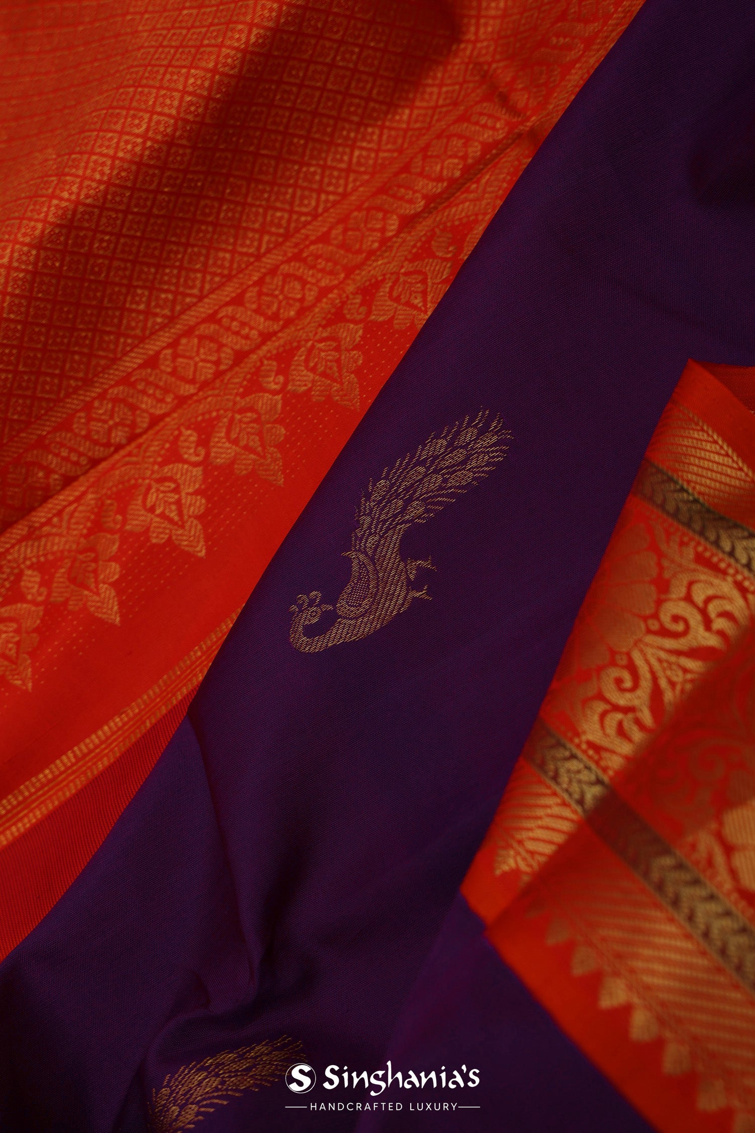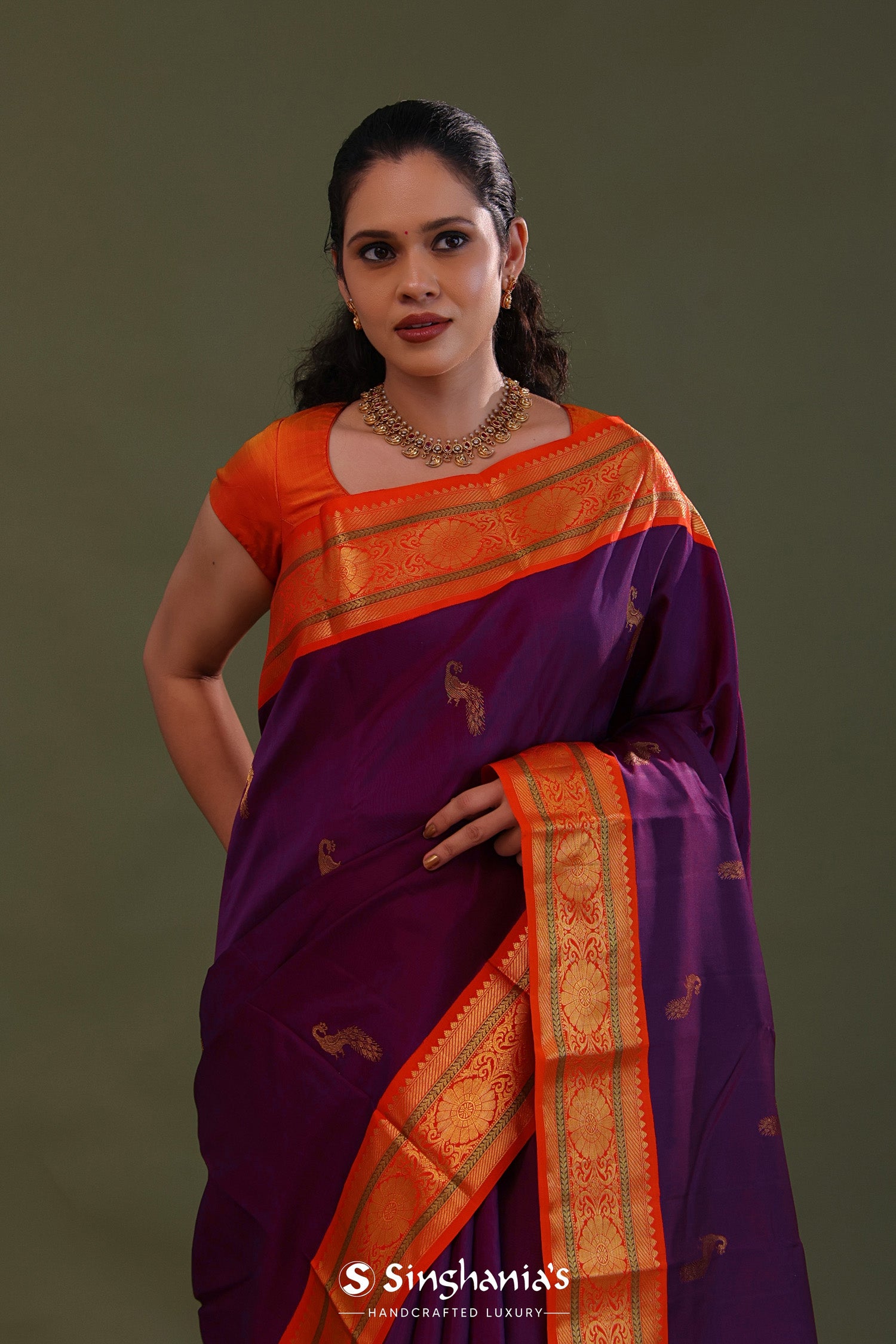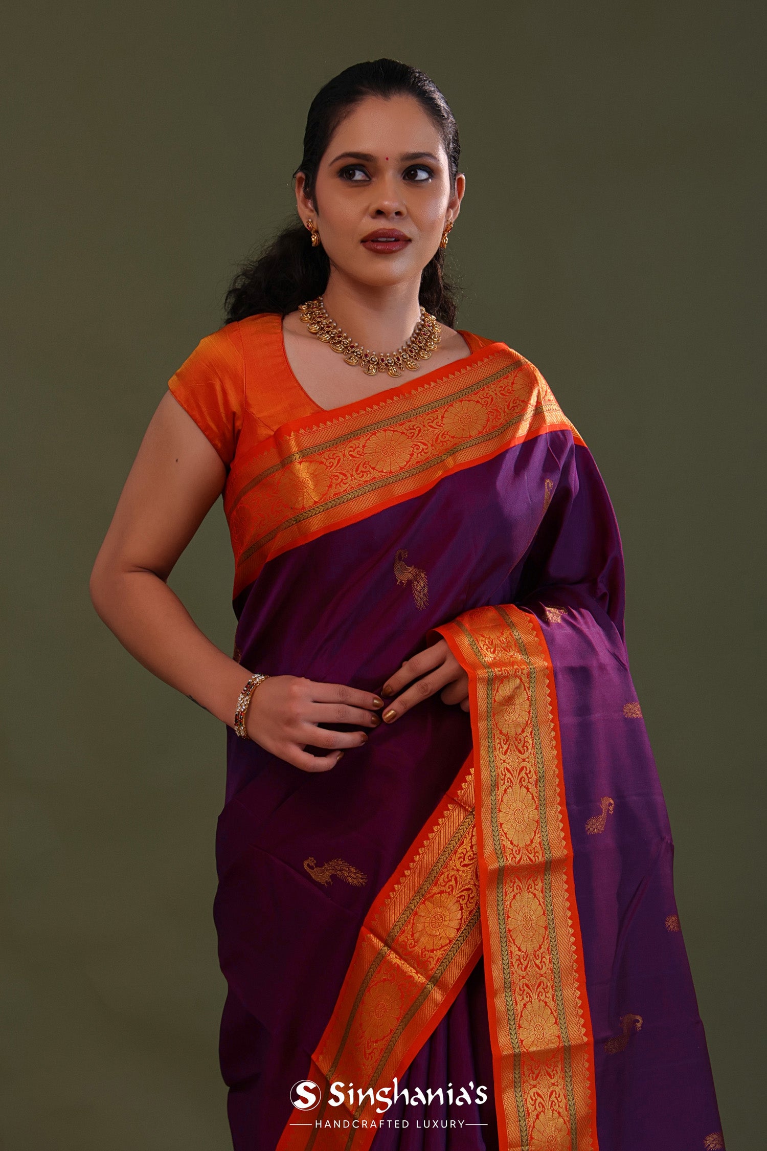 This lightweight Very dark violet kanjivaram silk saree features peacock motifs scattered all across the body complemented with orange border,pallu and unstitched blouse