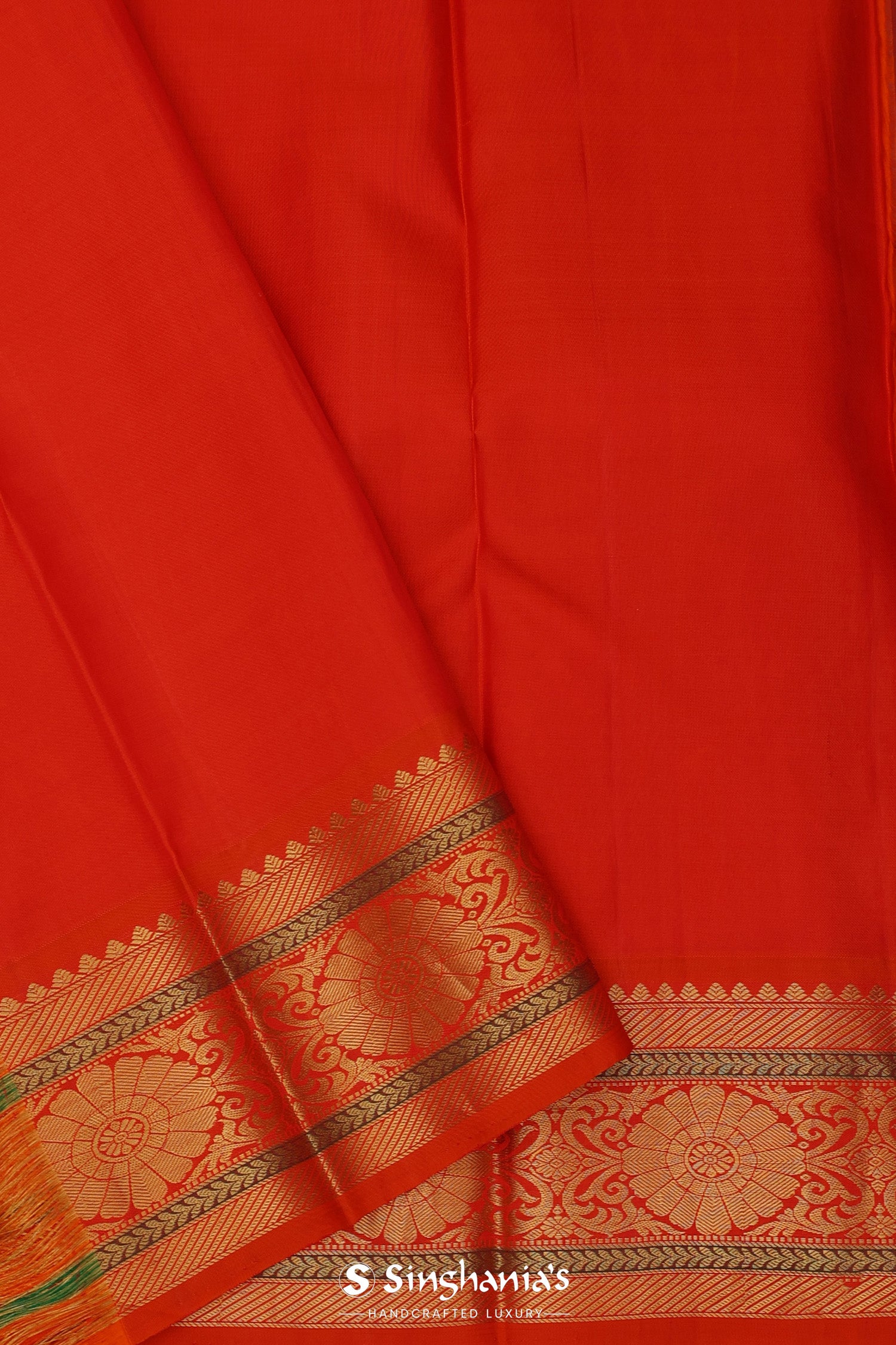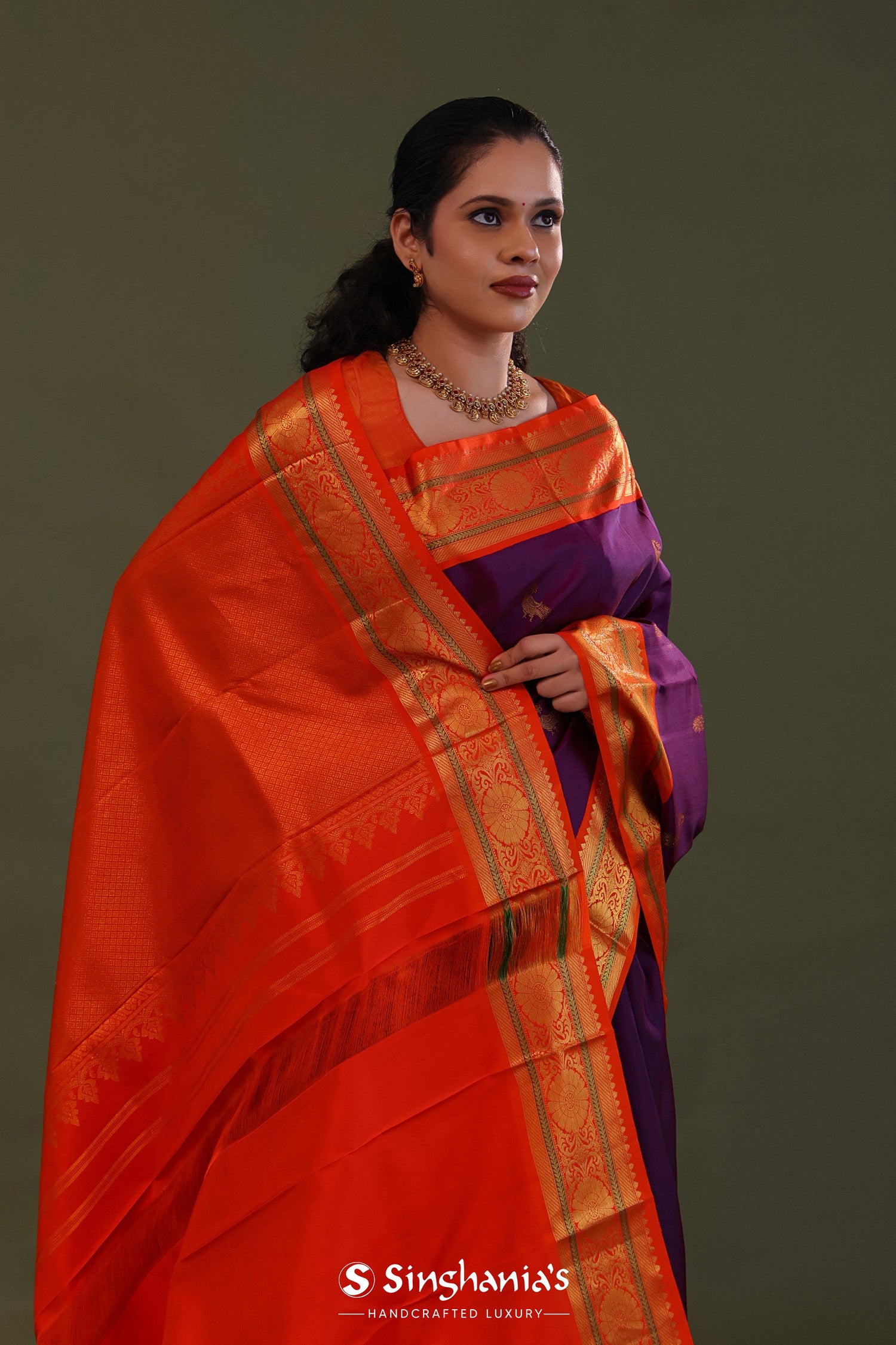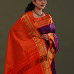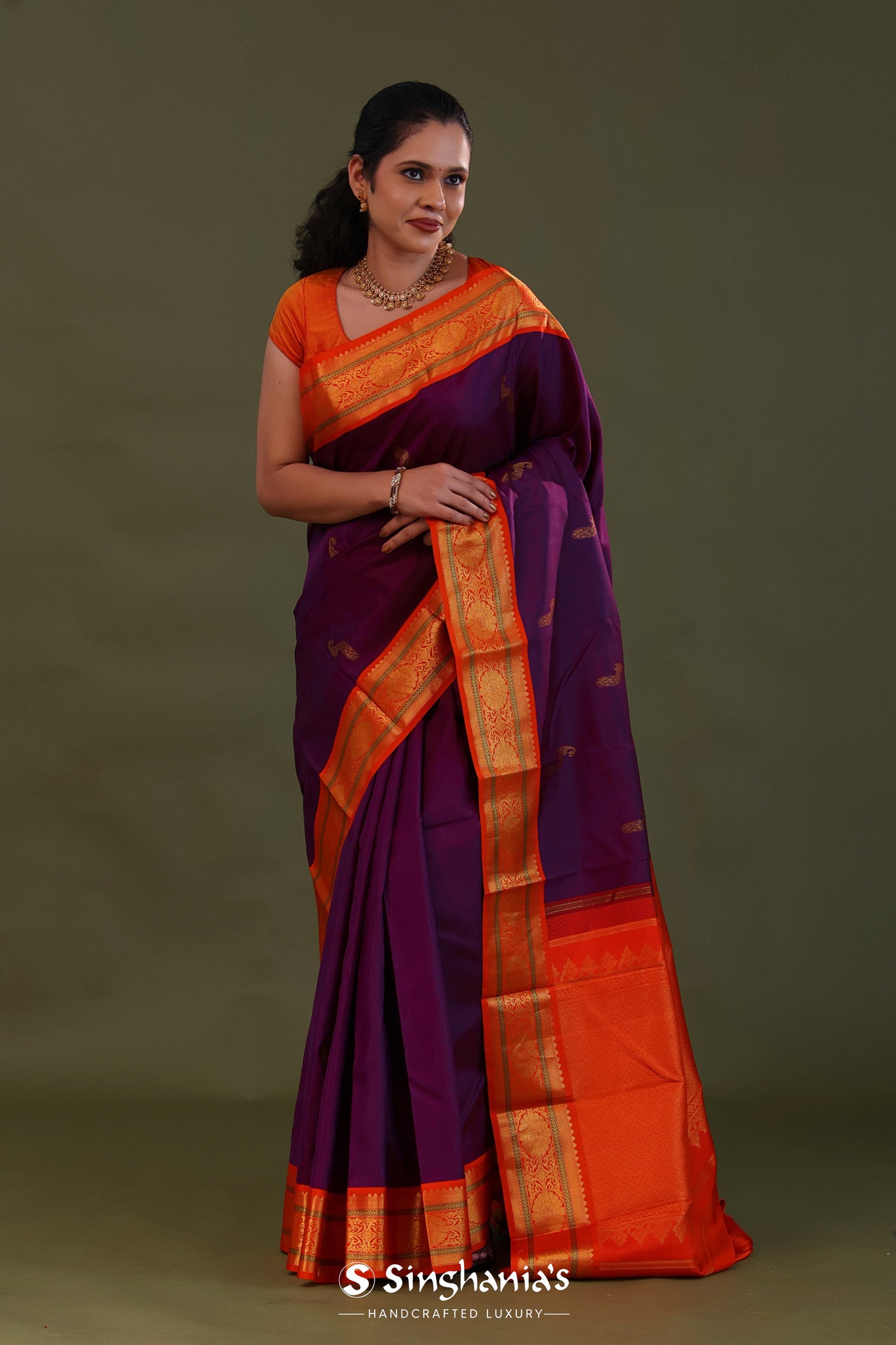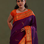 This lightweight Very dark violet kanjivaram silk saree features peacock motifs scattered all across the body complemented with orange border,pallu and unstitched blouse
