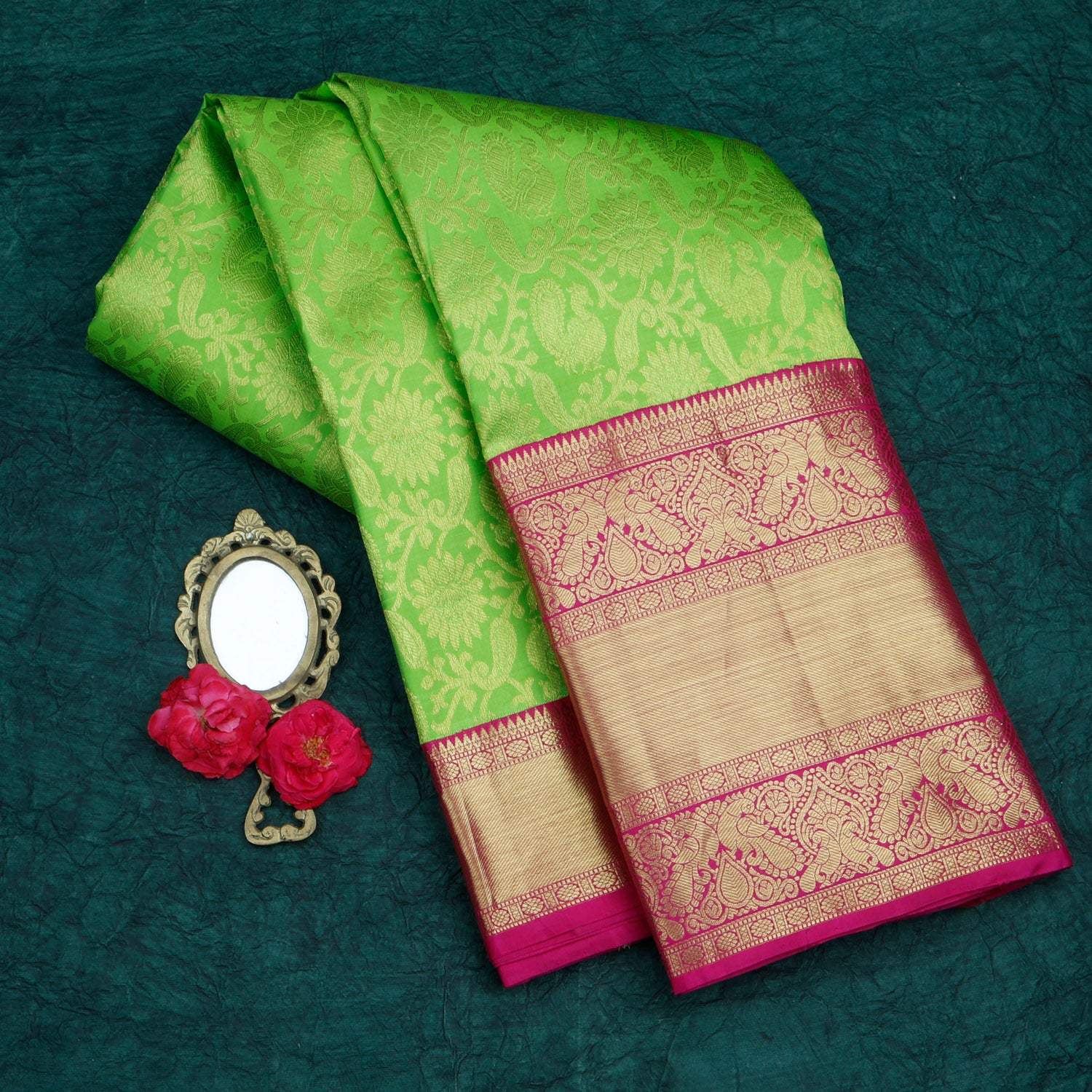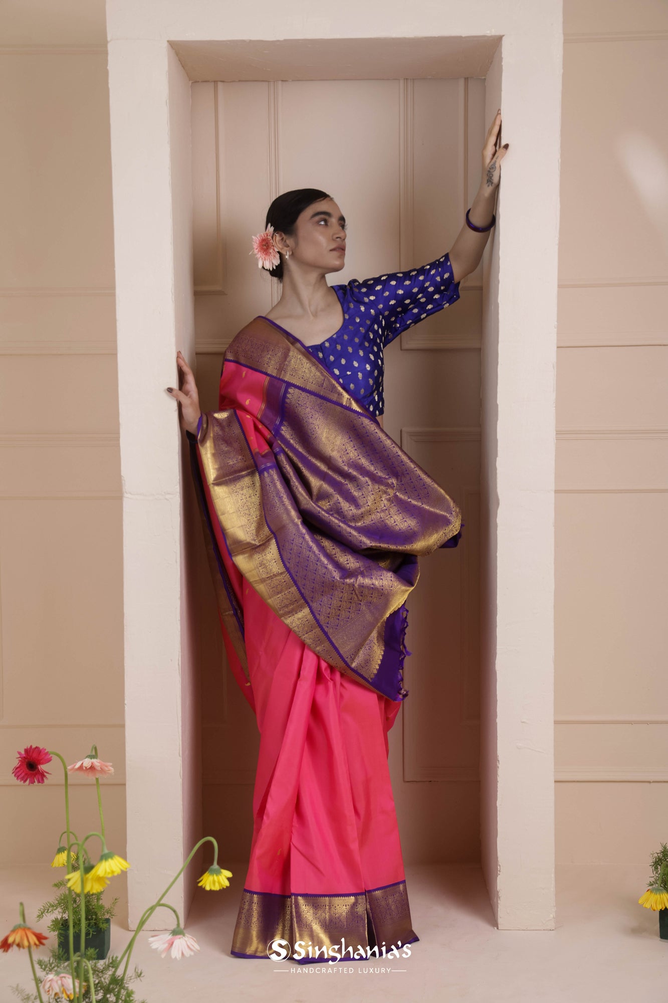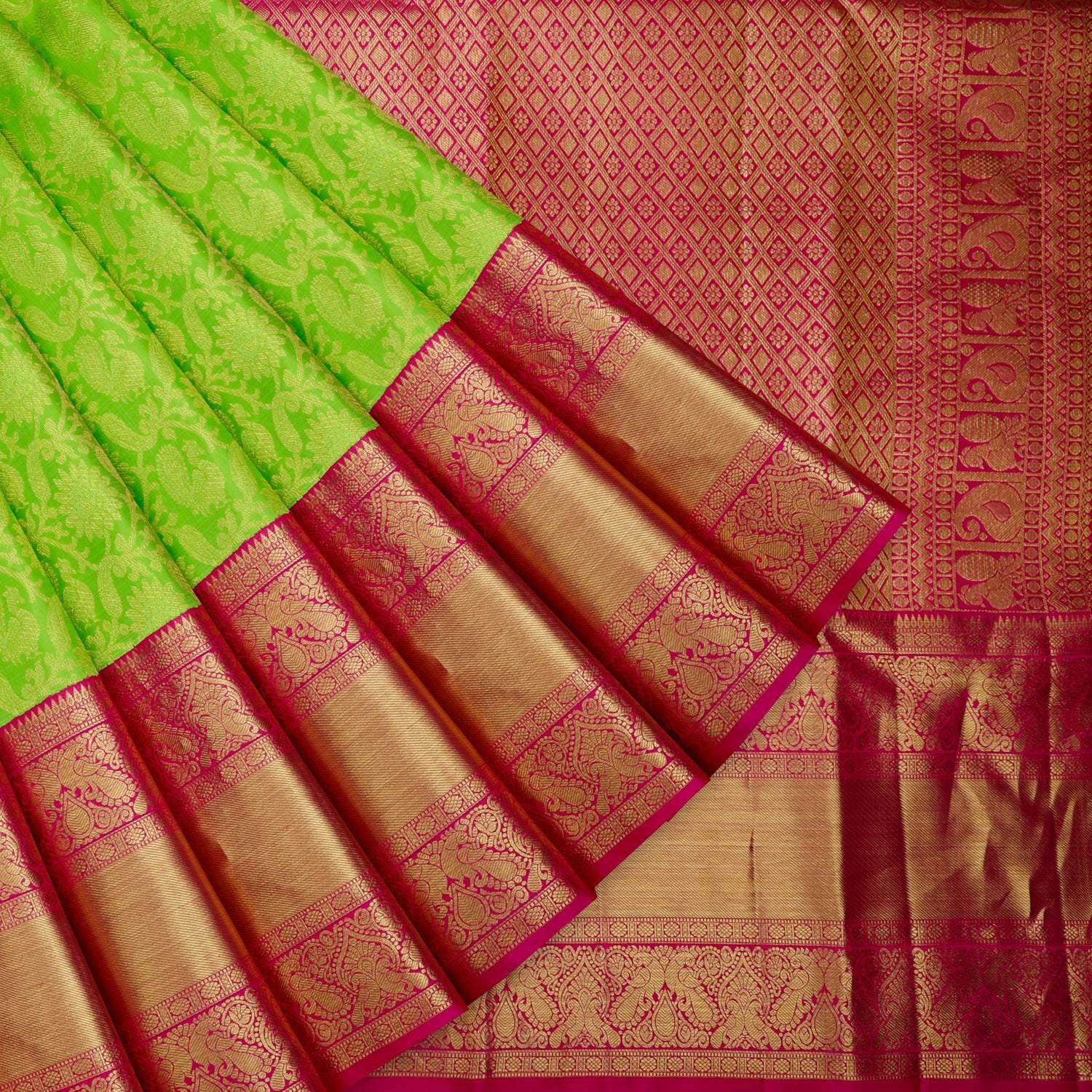 Discover the strength and unique technique of Korvai Kanjivaram Silk Sarees at Singhania's. These hand-loomed beauties are a cherished asset, favored by women for their rich cultural significance. Made with high-quality silk and intricate craftsmanship, the korvai Kanchipuram sarees showcase the best of traditional handloom work. Adorned with exquisite zari work of gold and silver, the silver zari kanjivaram sarees with korvai border silk sarees are a symbol of elegance. For authentic korvai silk sarees online shopping, choose Singhania's. Explore our comprehensive range and experience the timeless beauty of these exquisite sarees.