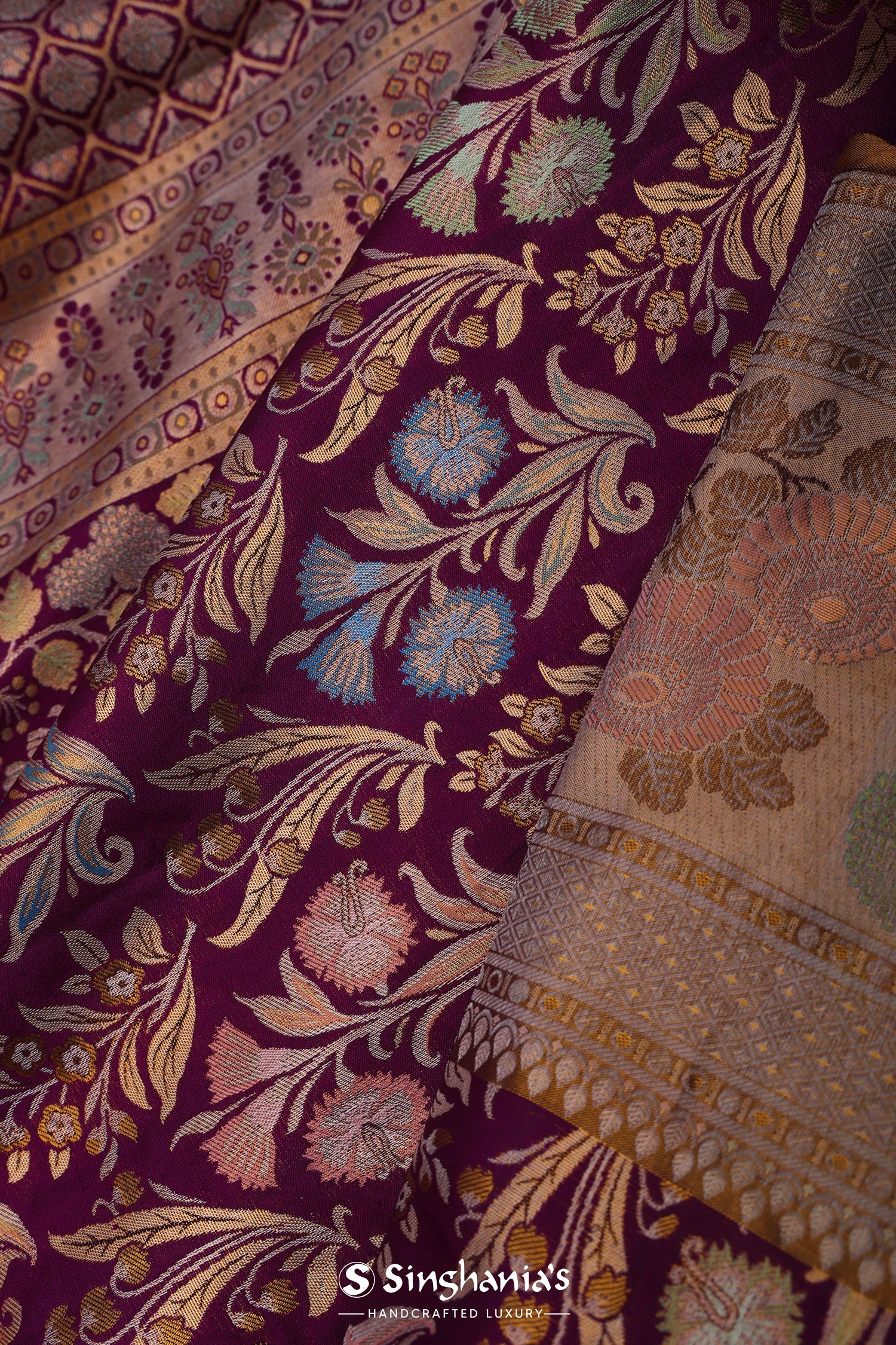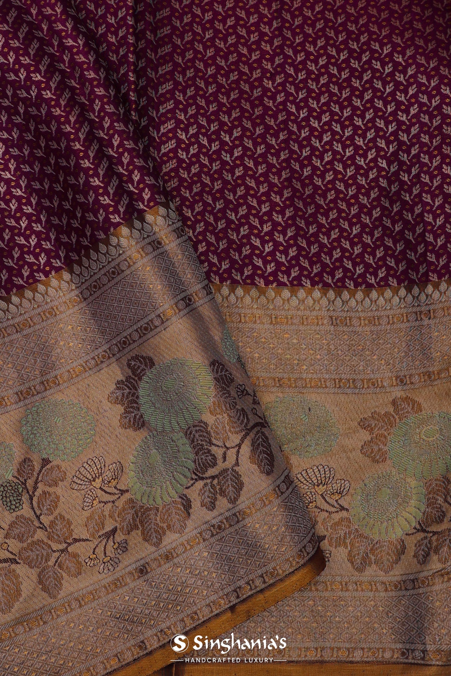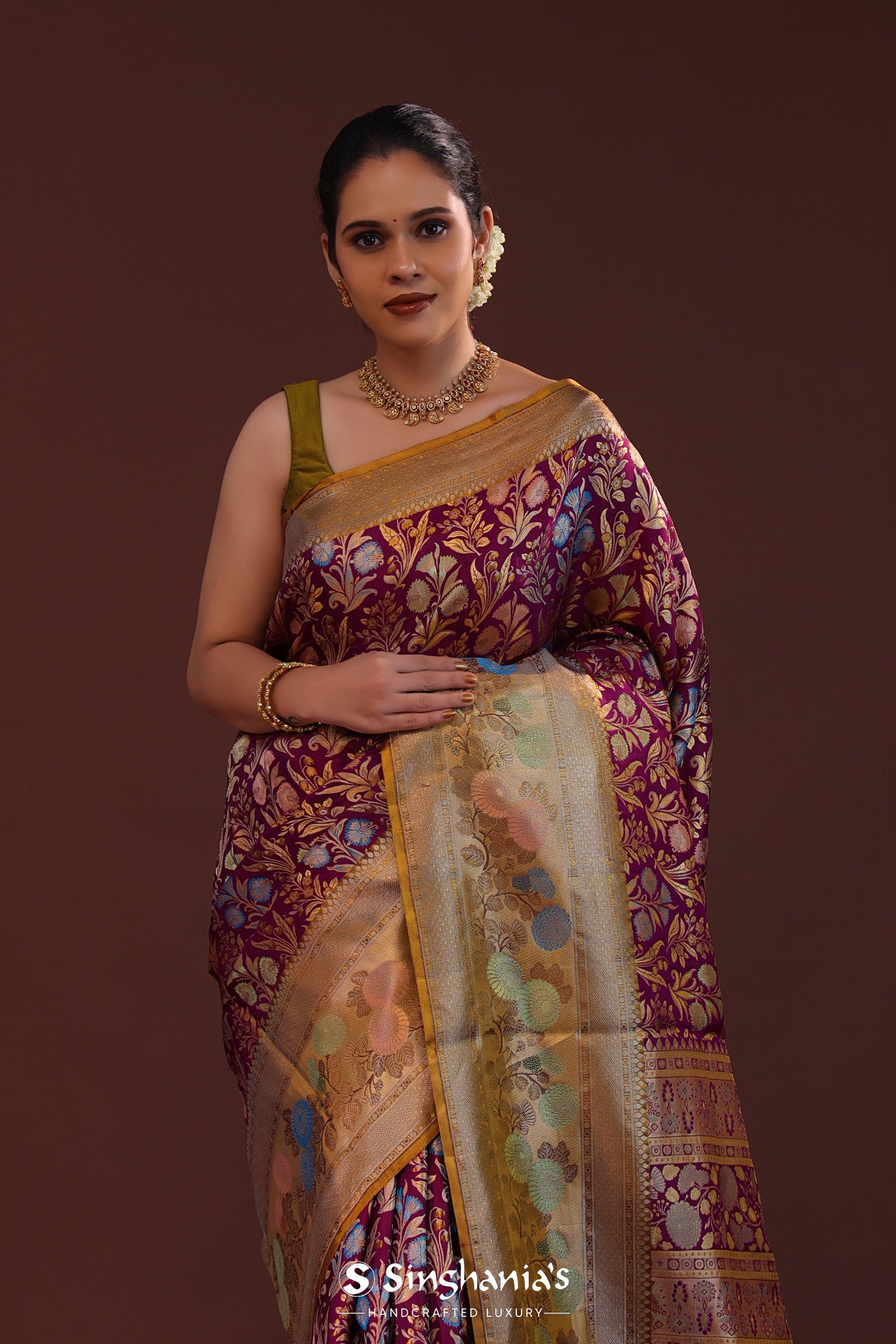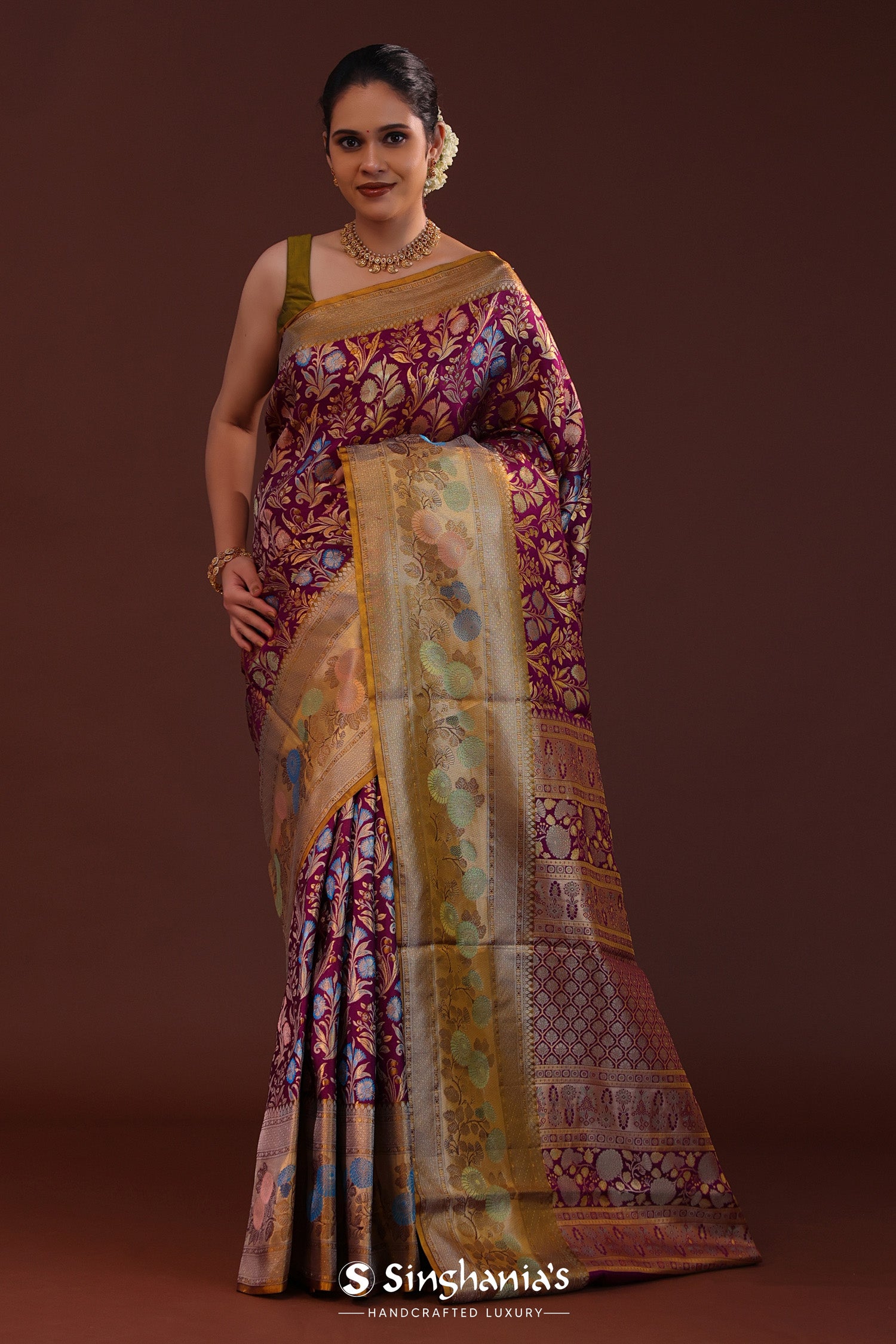 The meenakari floral design woven on body with gold zari complemented with contrast meenakari border and unstitched blouse