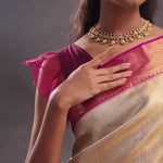 This beige Kanchi tissue silk saree offers a perfect blend of understated elegance and intricate craftsmanship. The soft beige body is beautifully complemented by a vibrant magenta border, which is embellished with exquisite gold zari work. The body features delicate silver zari motifs, adding a subtle shine and sophistication. Ideal for weddings or formal occasions, this saree exudes timeless charm with a modern twist.