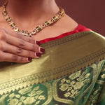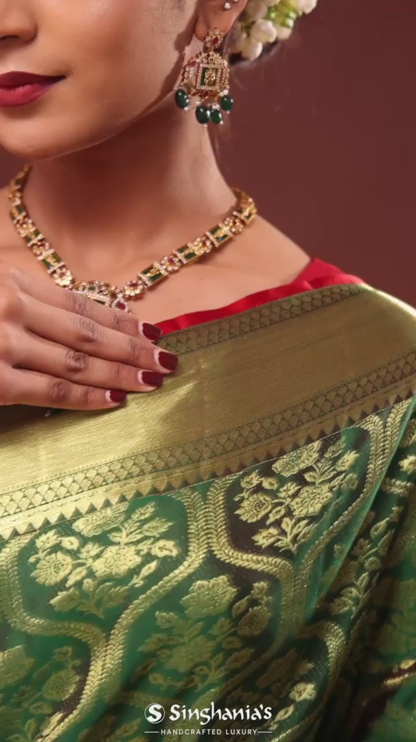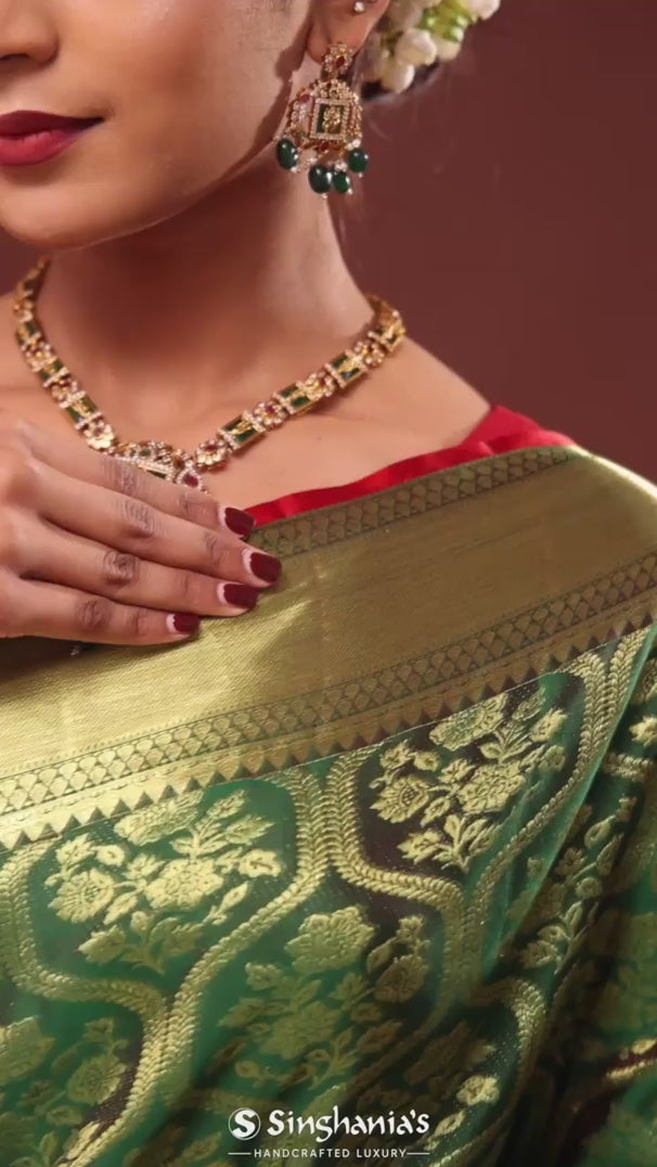 This sophisticated bottle green Kanjivaram silk saree has an eye-catching crimson edge and an opulent gold zari border. Its regal charm is further enhanced by the elegant, all-over pattern created by the delicate floral motifs adorning the body within enclosed figures.