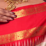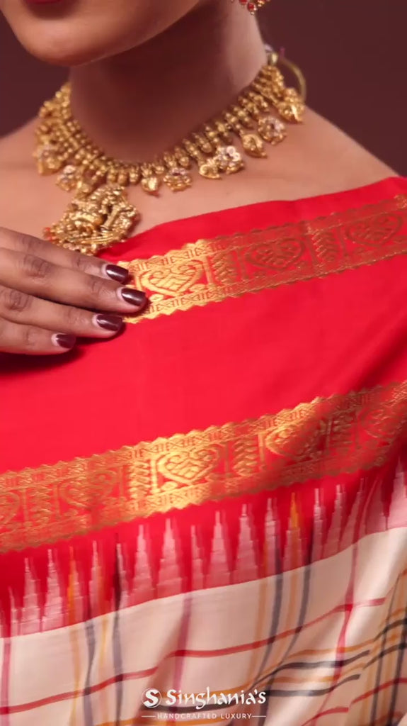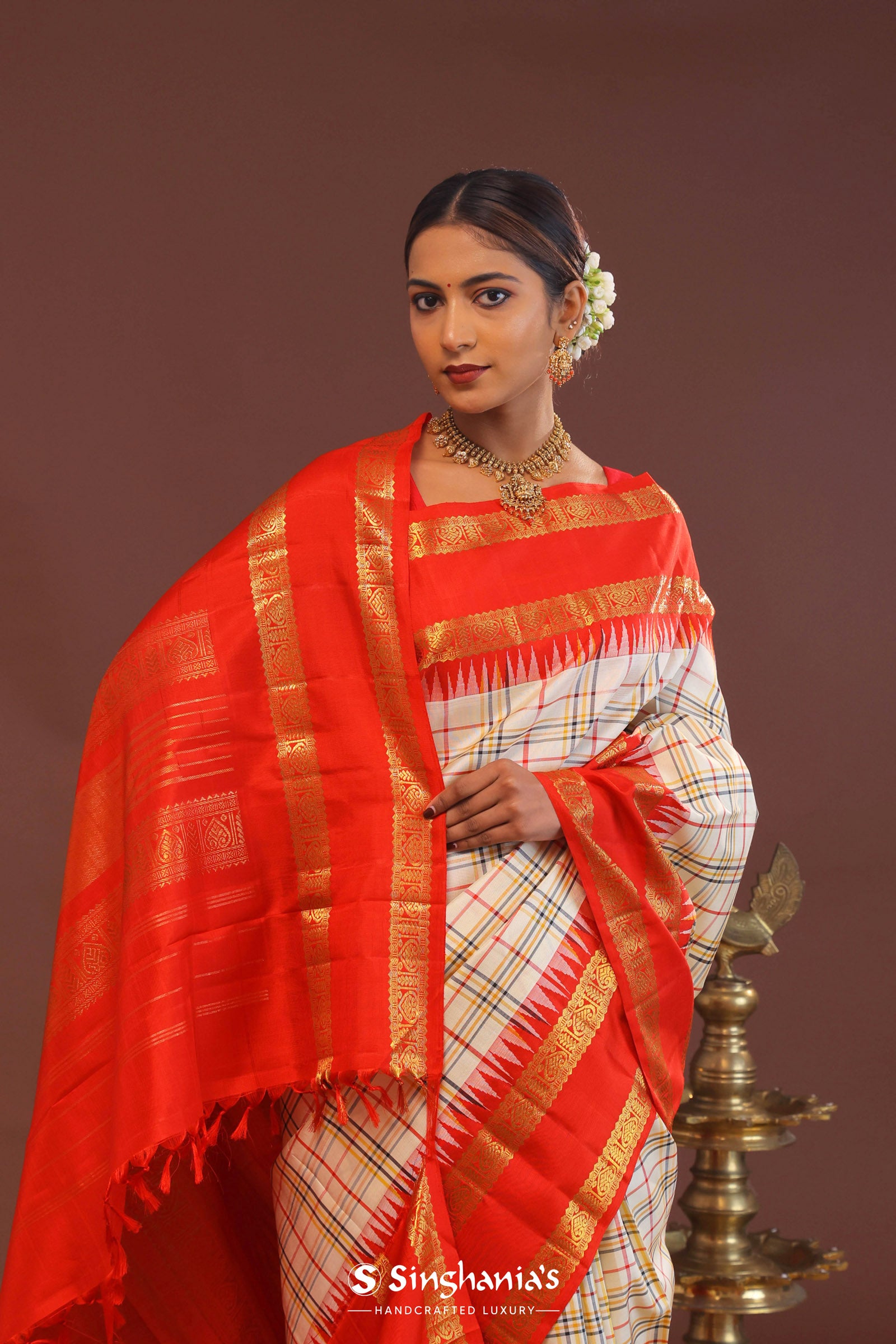 There is a striking red border on this classic cream Kanjivaram silk saree. Traditional checks on the exquisitely constructed body create the ideal balance of striking color and timeless design.