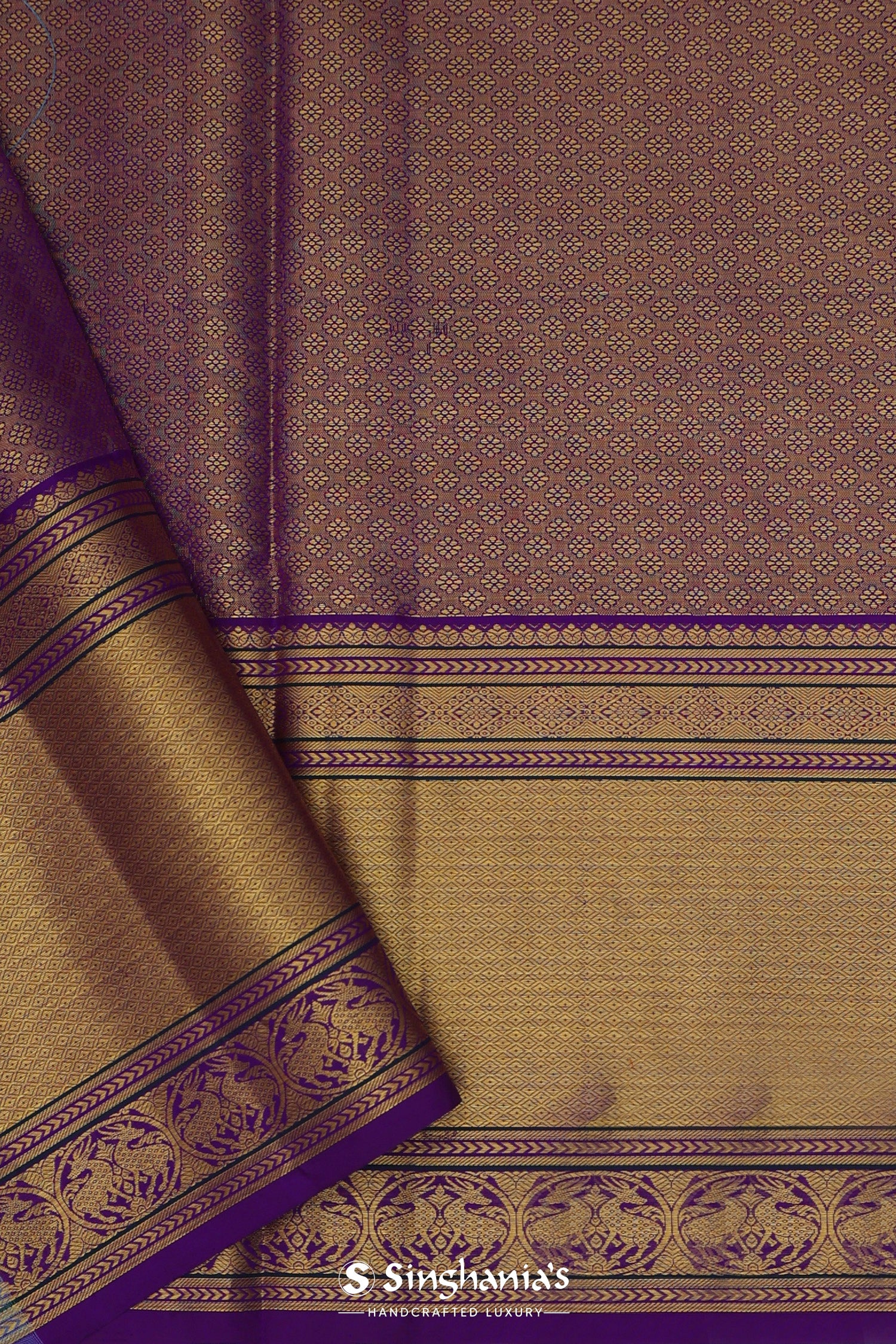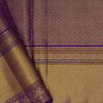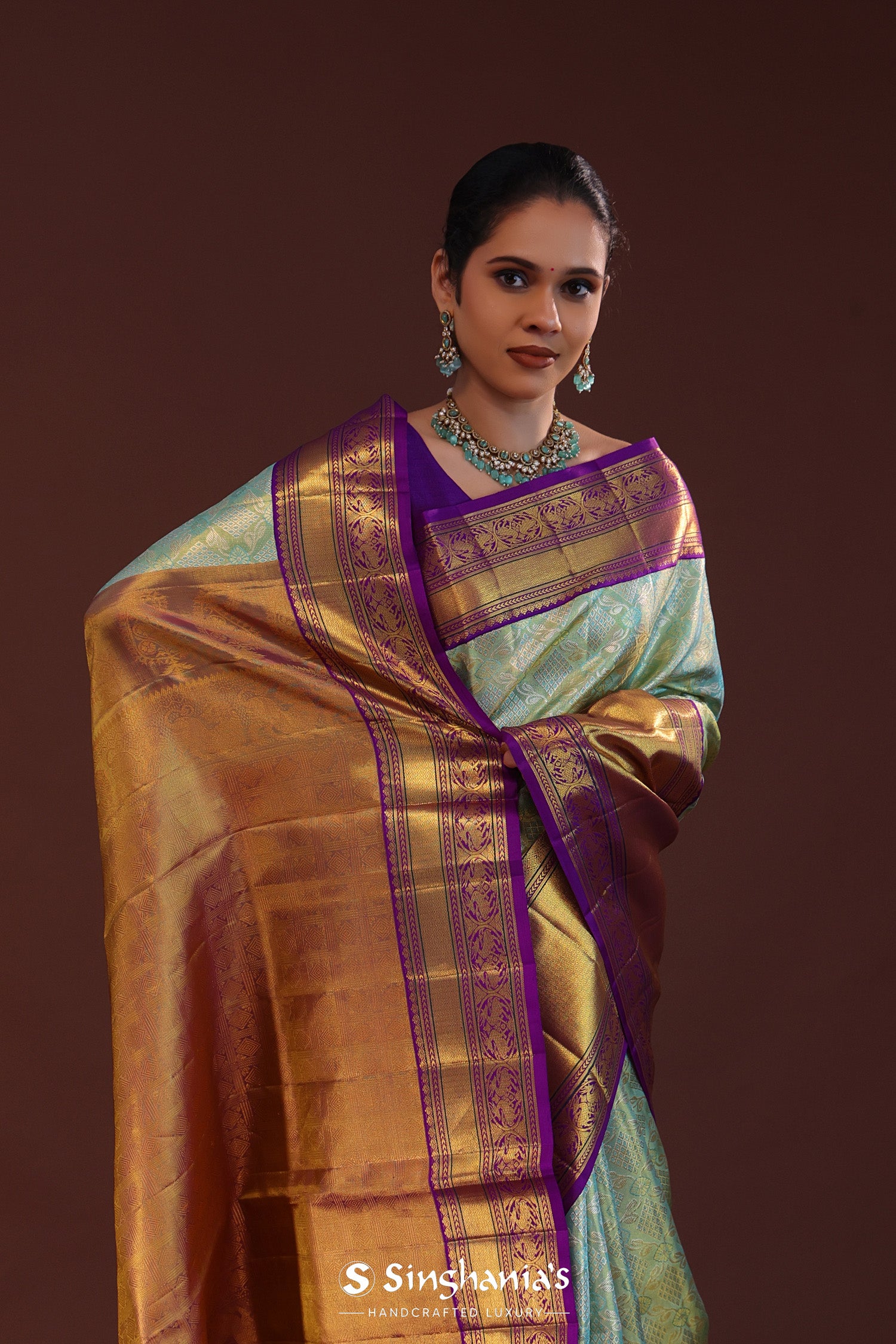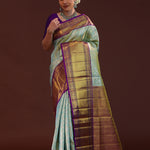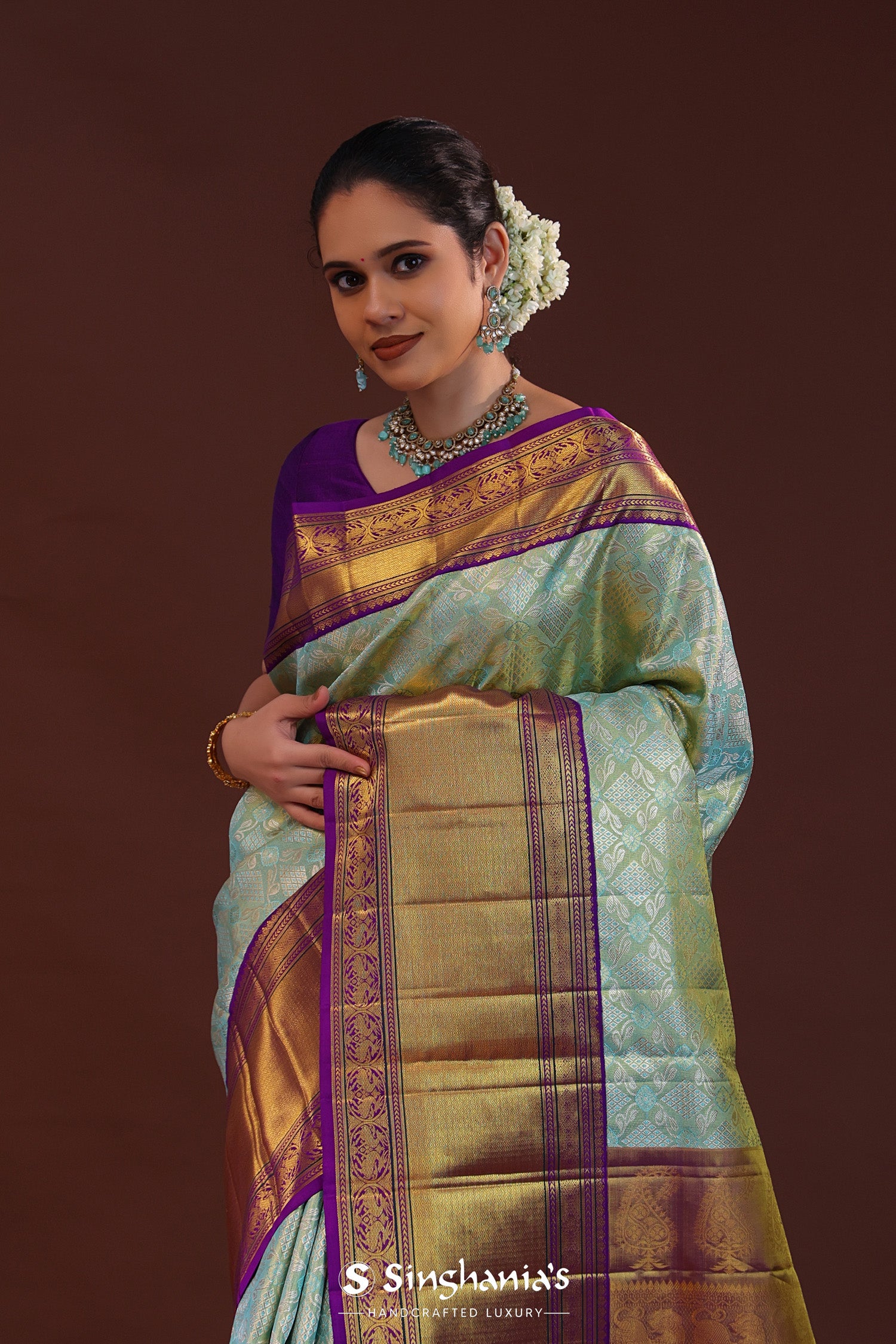 Light mint blue kanjivaram tissue saree is a masterpiece of the weavers ,woven with pure silk and real zari.This saree features floral jaal and geometrical figures complemented with contrast violet border and unstitched blouse which is adding the charm to overall look.