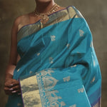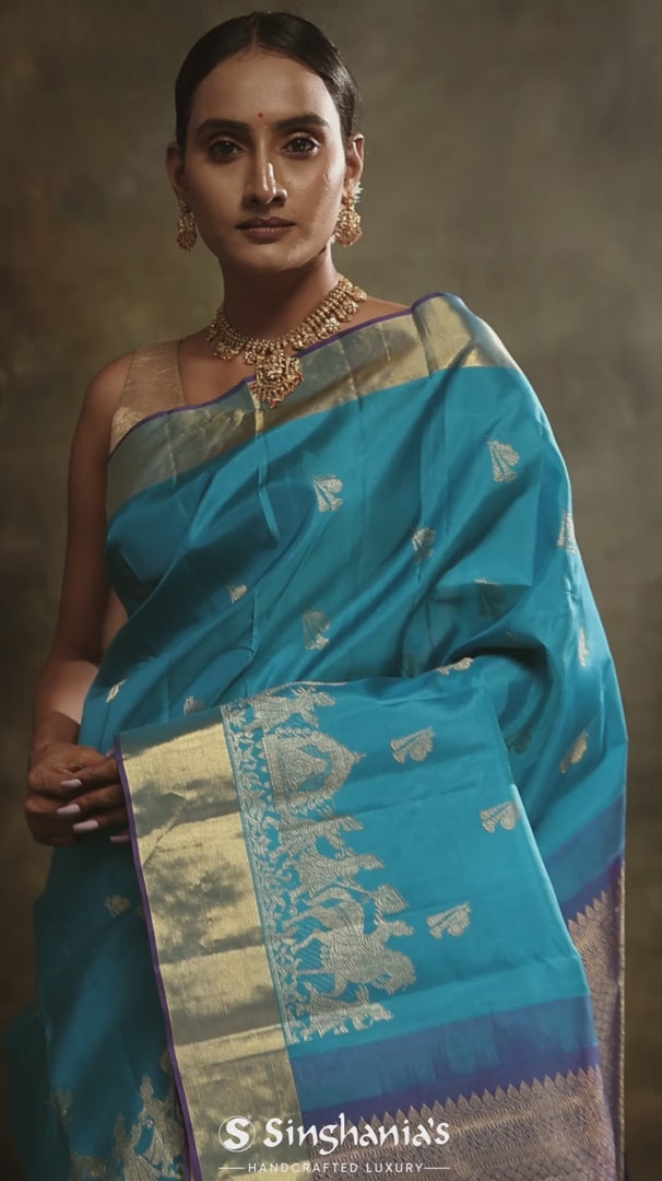 A timeless mosaic blue kanjivaram silk saree in a rich gold zari, floral butti, adorned with a majestic big border and pallu showcasing intricate human procession and kaddi pattern, woven in lustrous gold zari. This elegant saree is perfect for festive occasions and wedding.