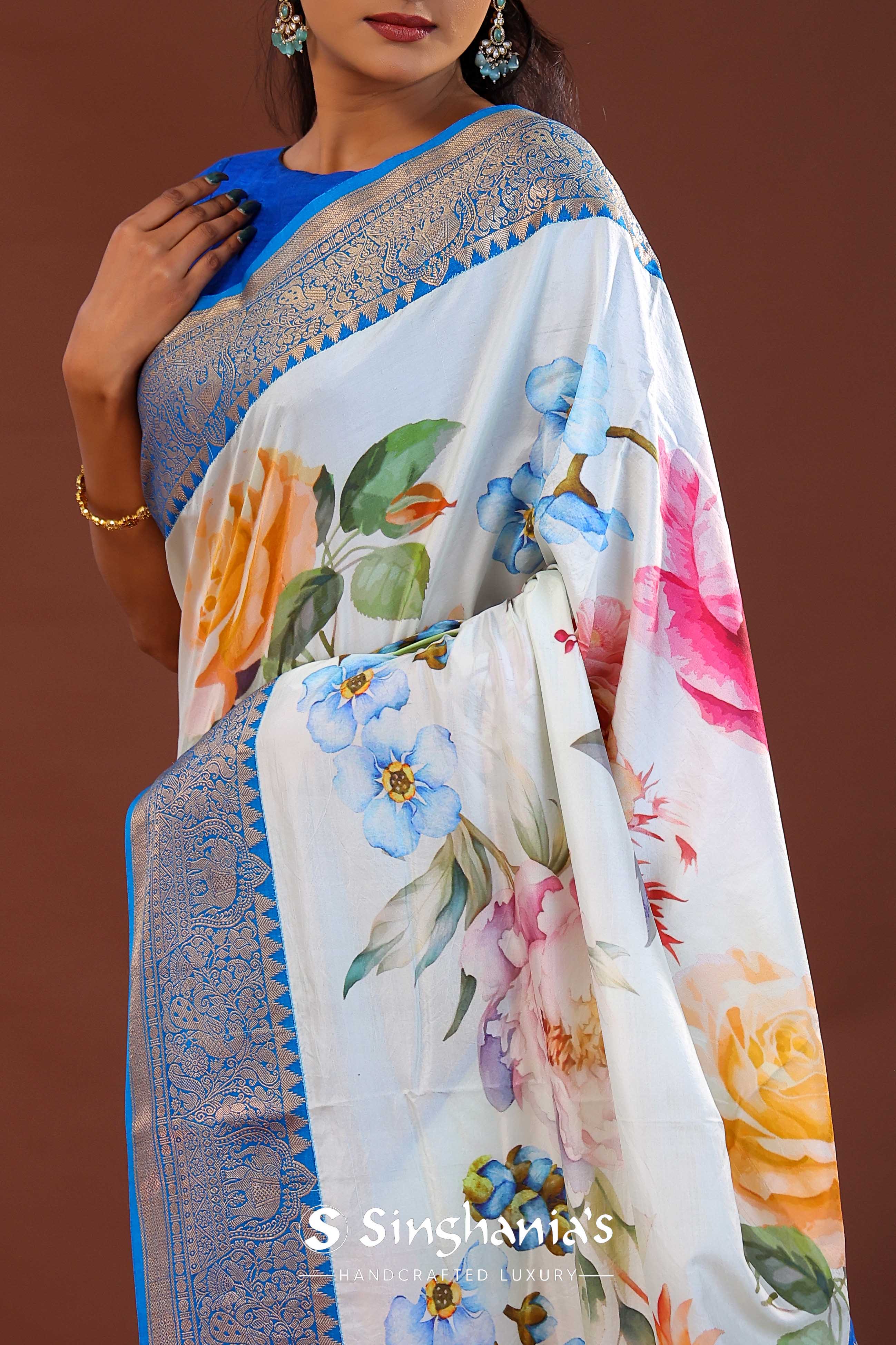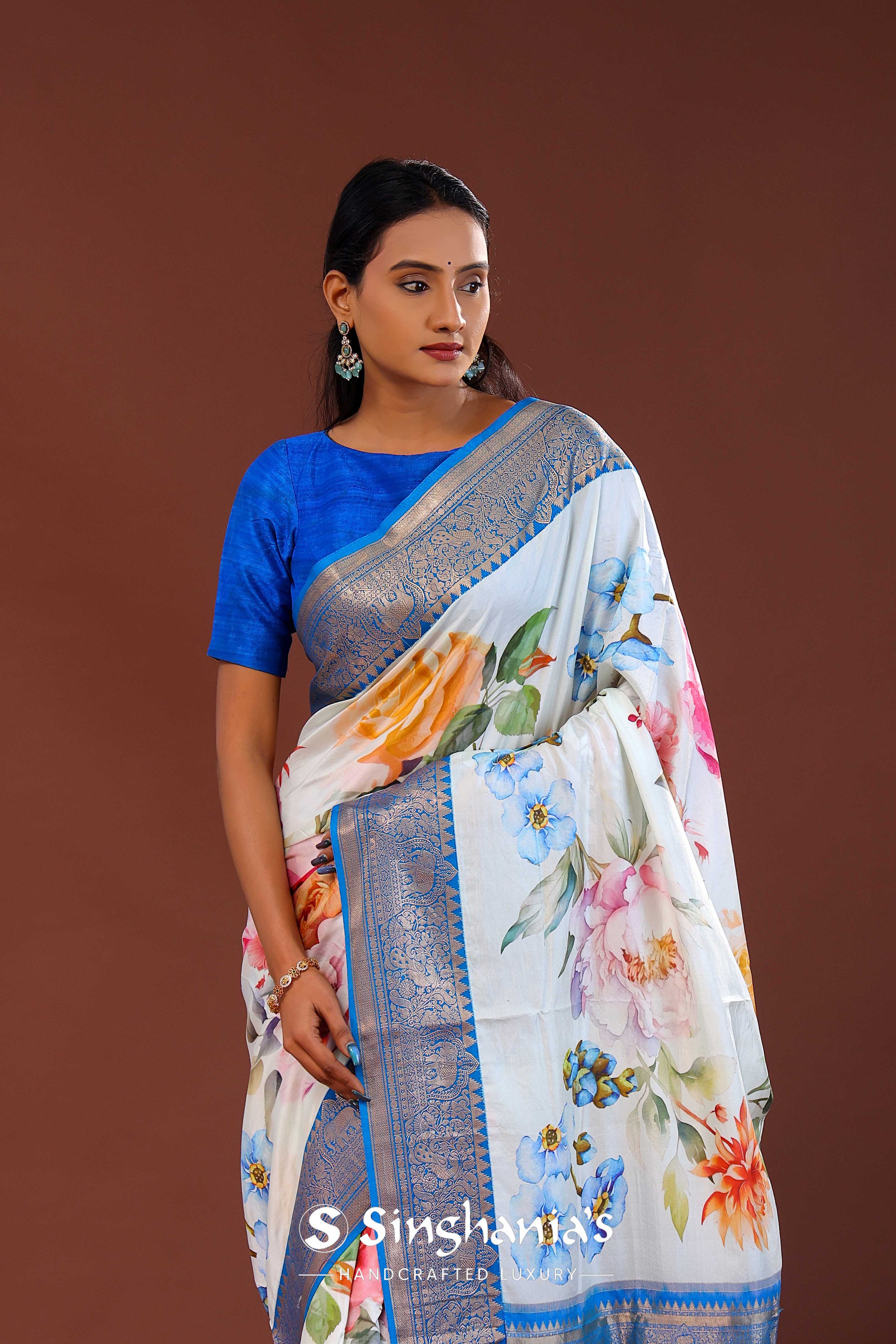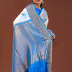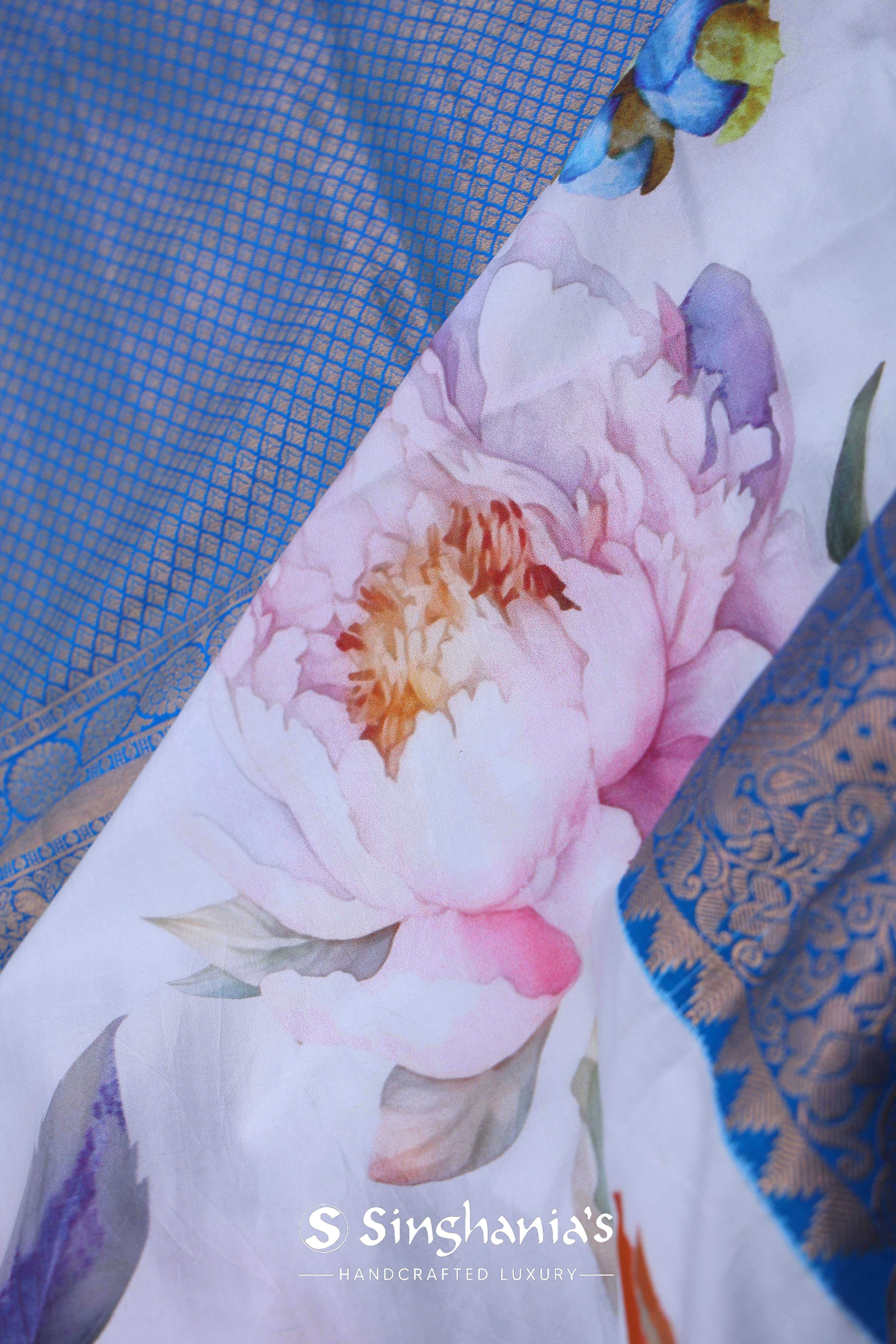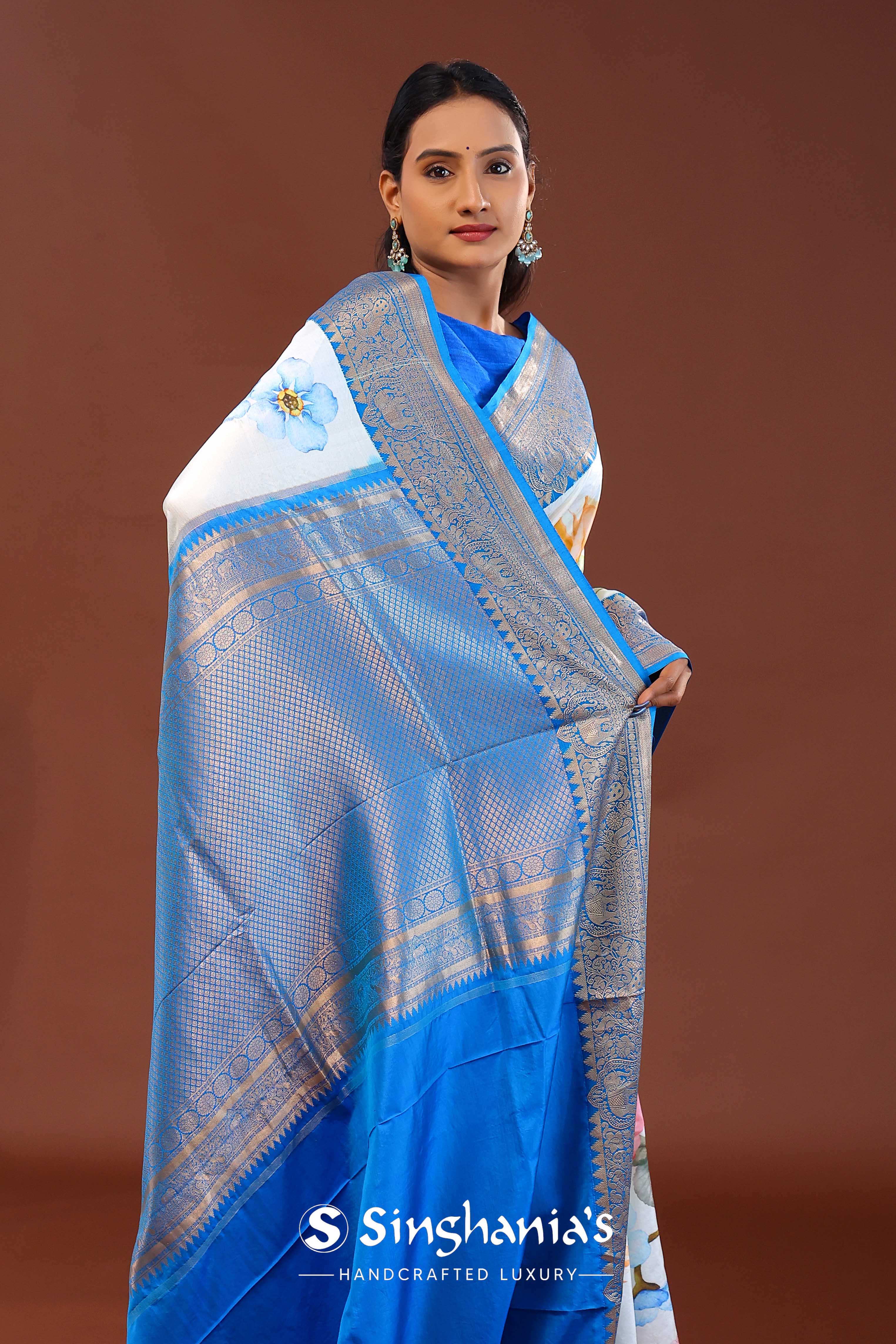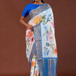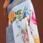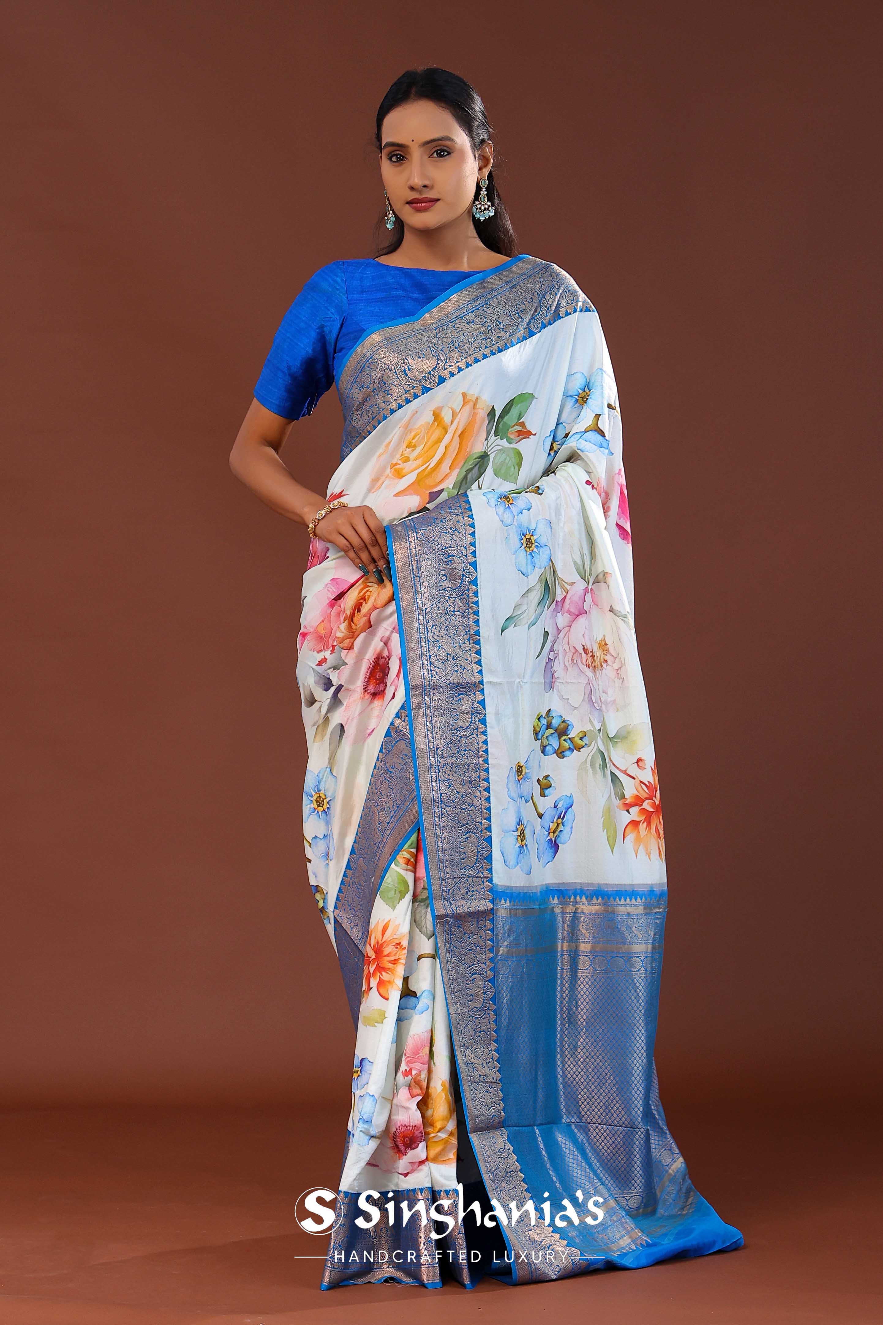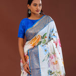 The radiant look emitted from Off-white digital printed kanjivaram saree.This saree features digital floral prints on the body of the saree makes it stand out from other saree complemented by traditionals indian motifs like peacock and elephants which is making every moment picture perfect