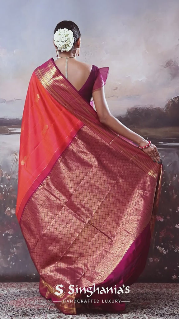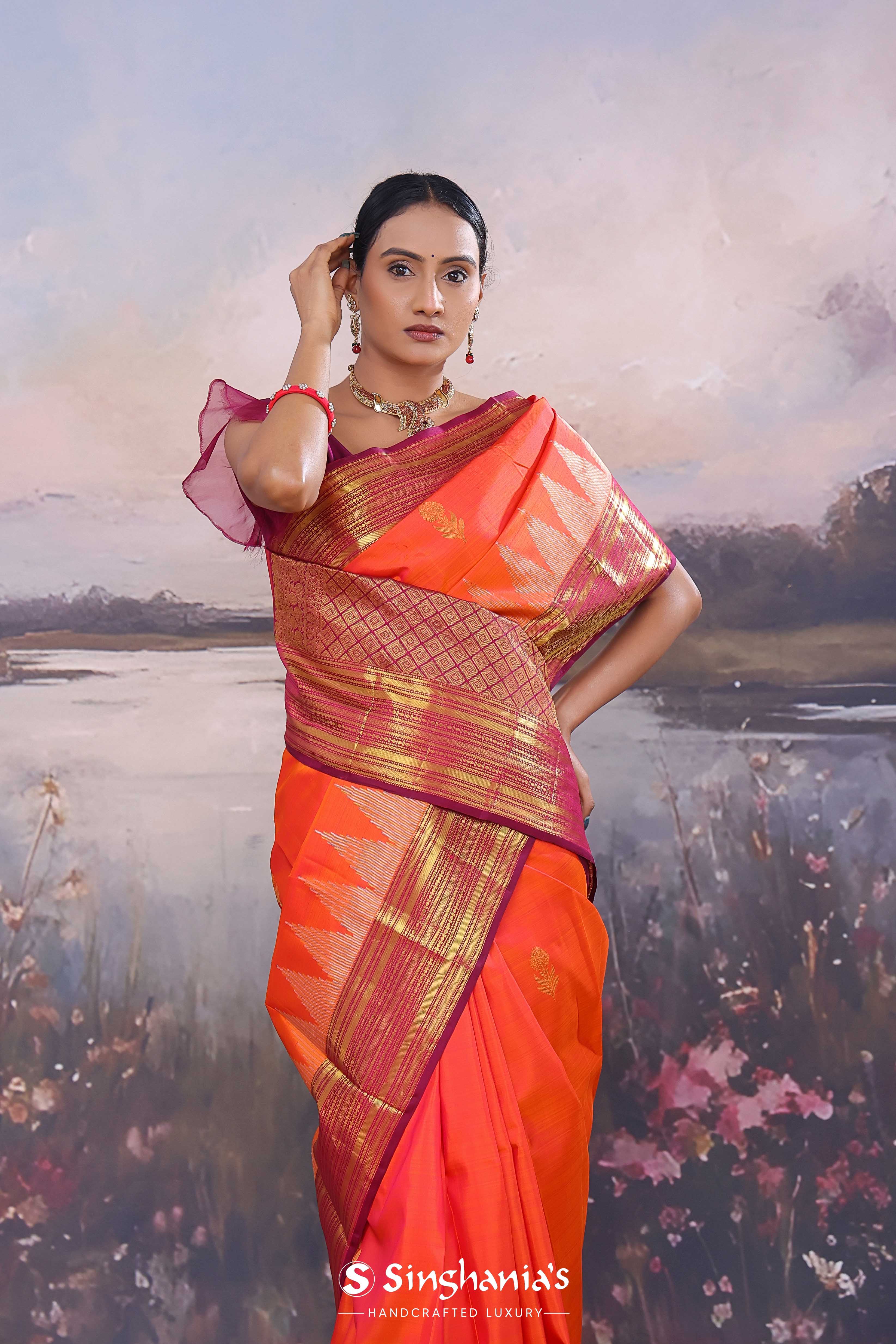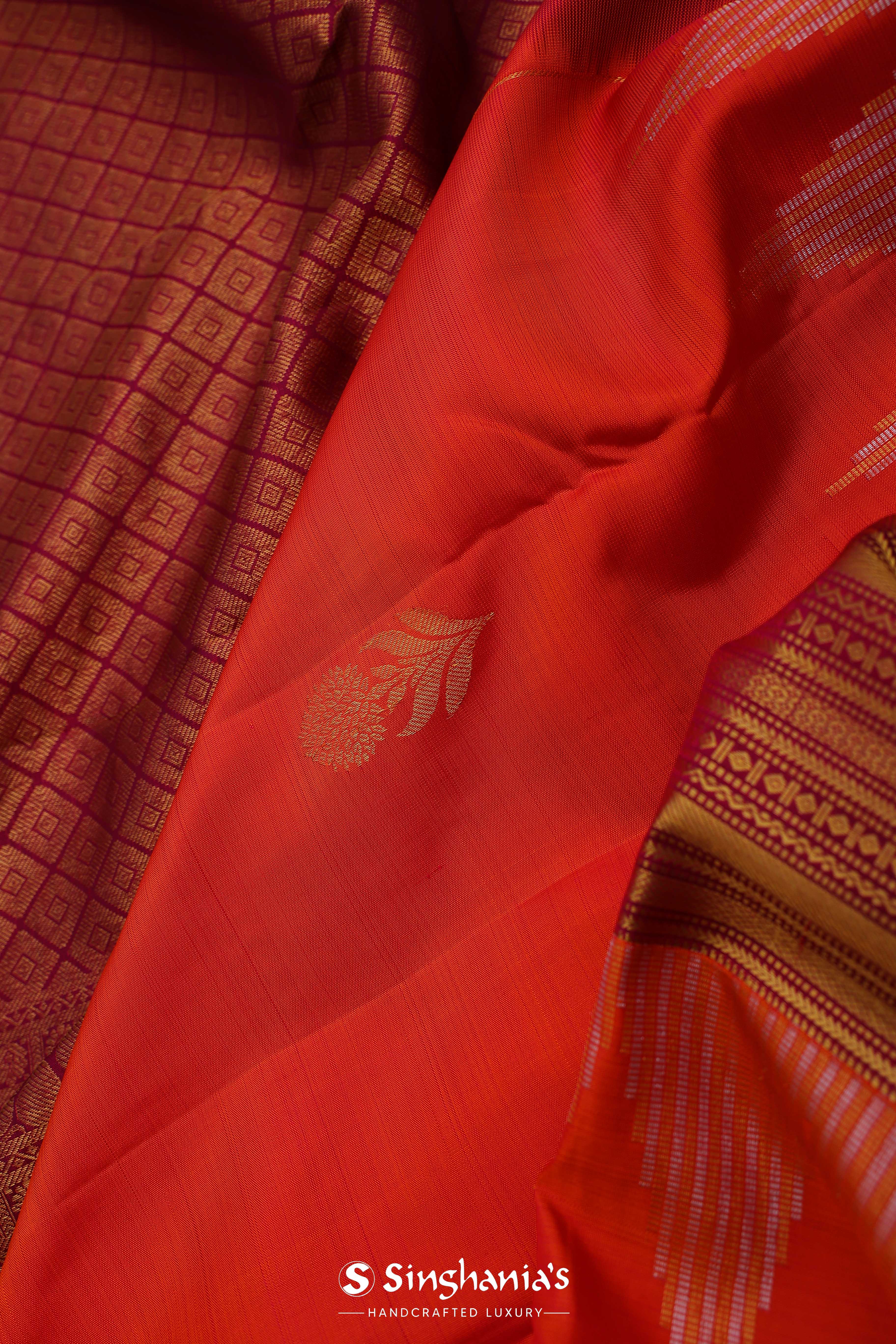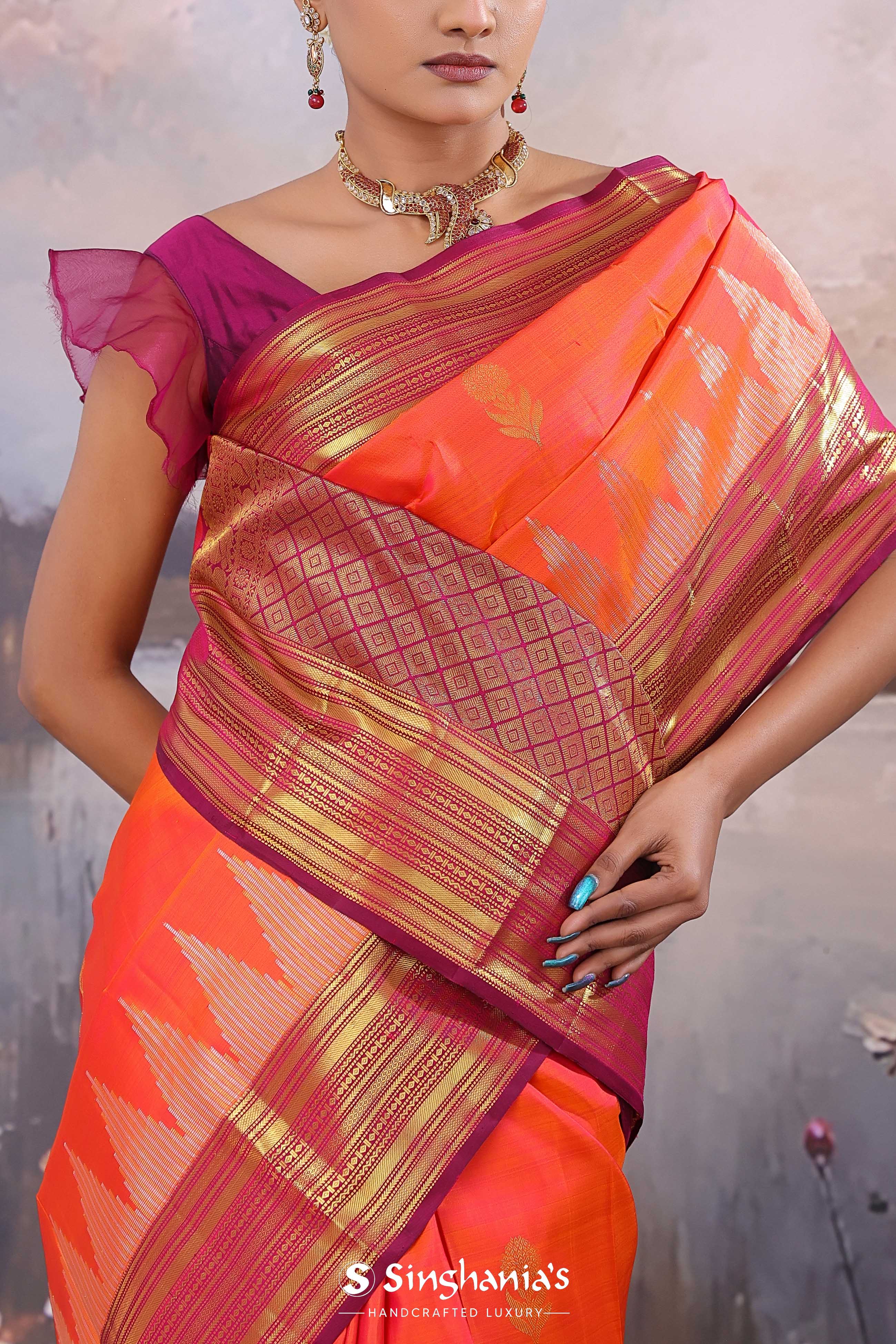 This Orange kanjivaram saree features butta's all over the body and leaf like pattern is woven above the contrast burgundy border which has horizontal stripes with some sections having a diamond like grid pattern , which is a blend of traditional and contemporary style.