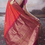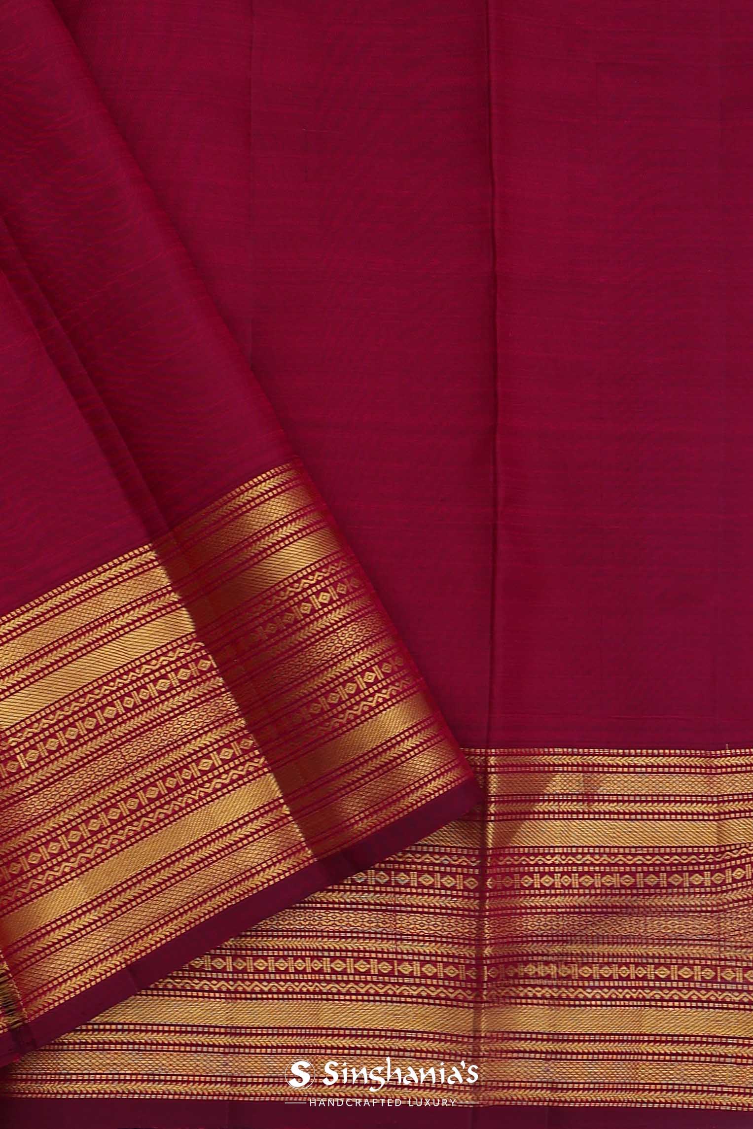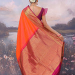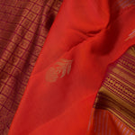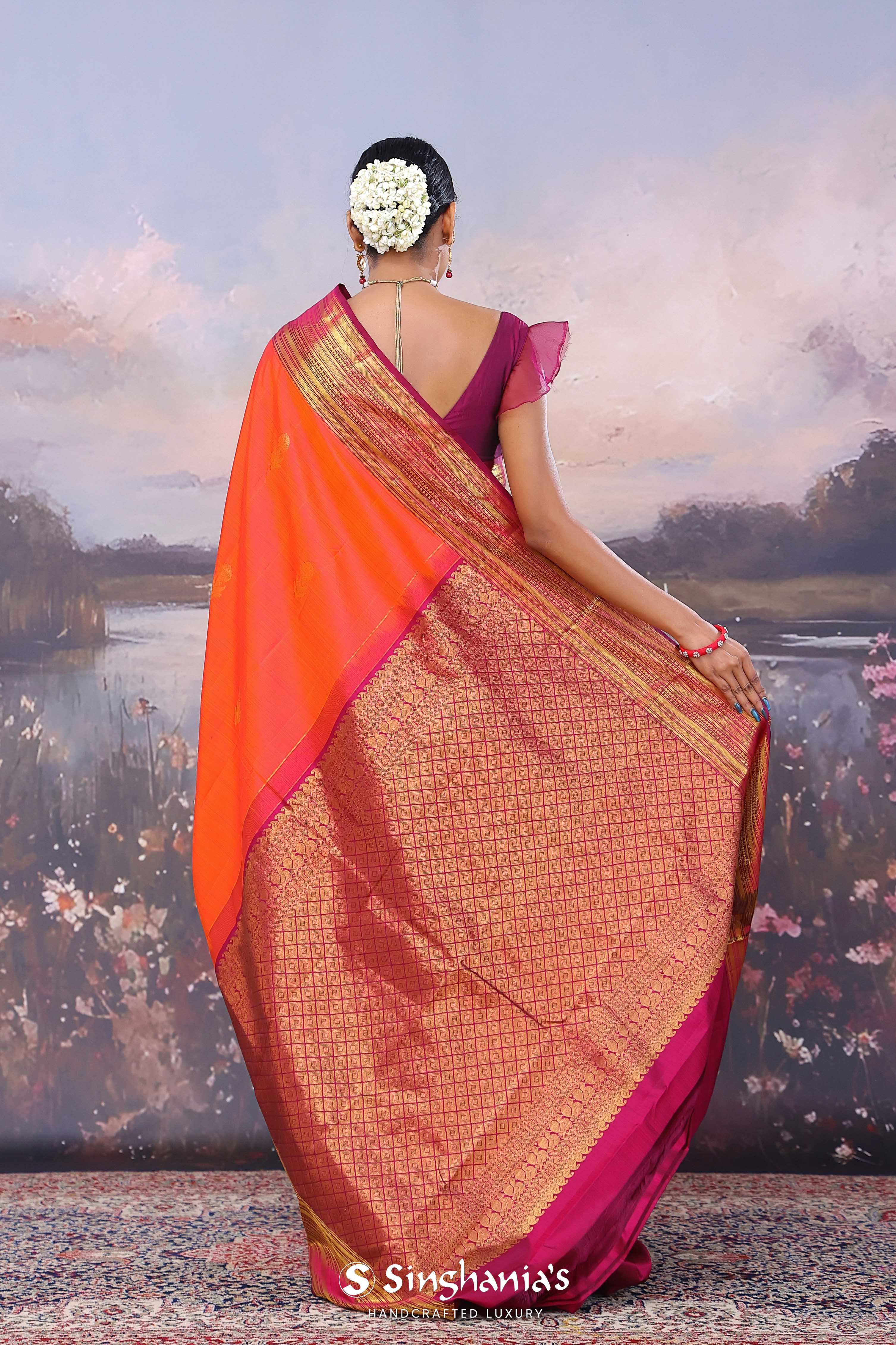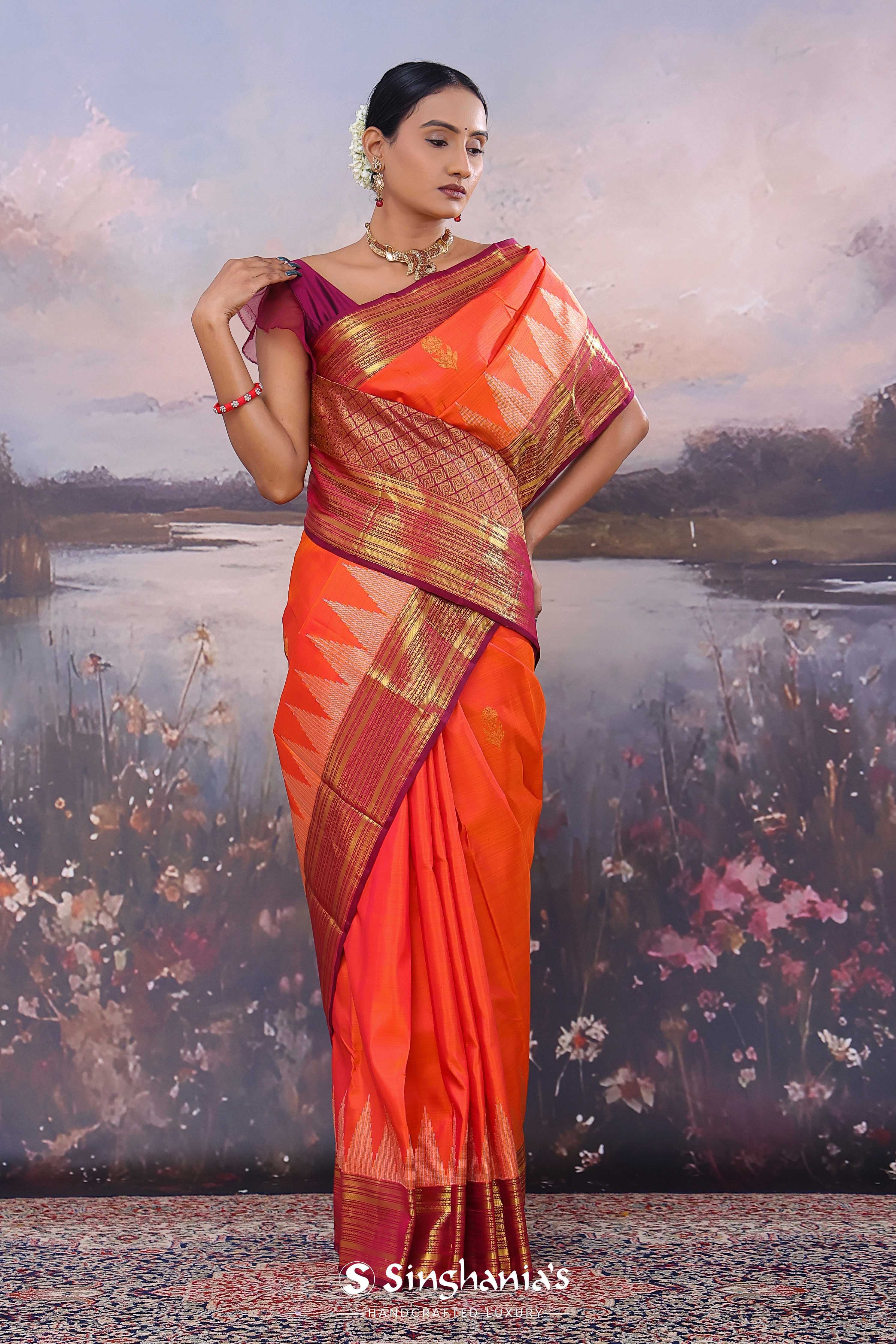 This Orange kanjivaram saree features butta's all over the body and leaf like pattern is woven above the contrast burgundy border which has horizontal stripes with some sections having a diamond like grid pattern , which is a blend of traditional and contemporary style.