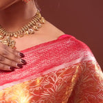This gorgeous orange Kanjivaram tissue saree has elaborate silver zari embroidery on a striking crimson border. A beautiful floral jaal decorats the body, giving this rich and joyous piece an astonishing touch.
