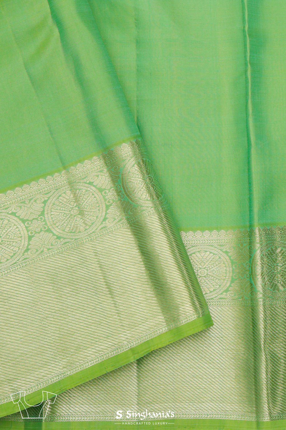 A timeless paris green kanjivaram silk saree in a rich gold zari, floral buttis, adorned with an elegant big border and pallu showcasing intricate floral - kaddi pattern, woven in lustrous gold zari. This elegant saree is perfect for festive occasions and wedding.