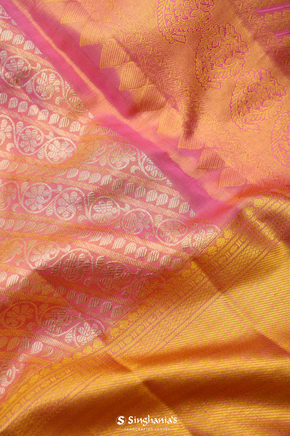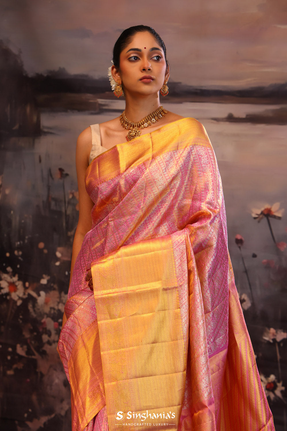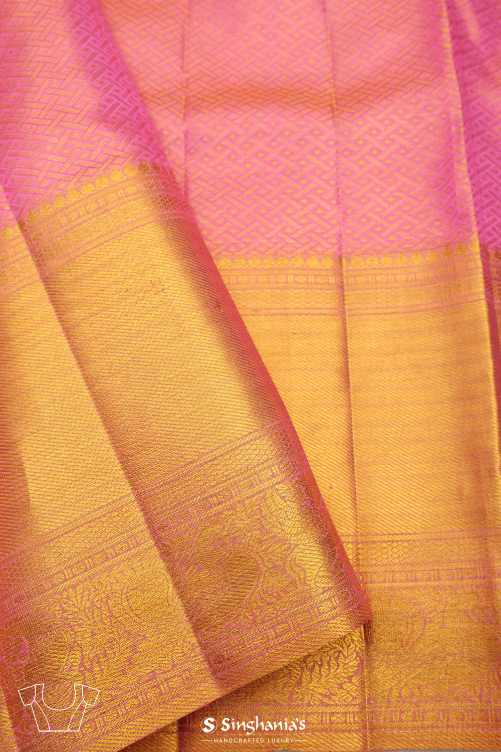 Refreshing persian pink kanjivaram silk with intricate kaddi and peacock border designs in gold zari weave. The body features diagonal floralweave and stripes pattern, complemented by a richly decorated pallu with traditional diagonal striped weavinng.