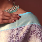 A magnificent purple Kanjivaram silk saree with a striking contrast sky blue border. The body is elaborately woven with silver embellishments, while the border contains antique gold zari, producing a perfect blend of traditional elegance and modern charm.