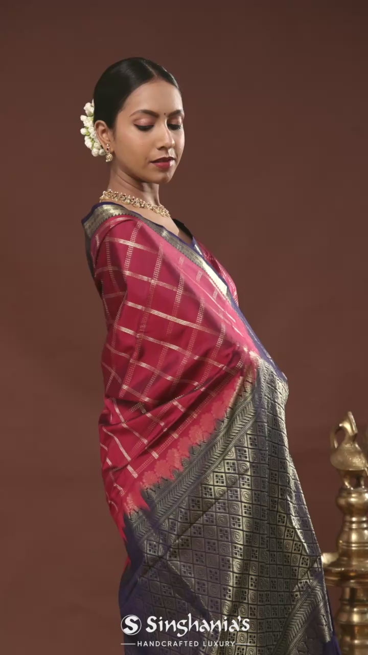 The dramatic dark indigo contrast border on this vivid red Kanjivaram saree adds depth and refinement. The body is embellished with carefully placed boxes, giving it a contemporary yet classic appearance.