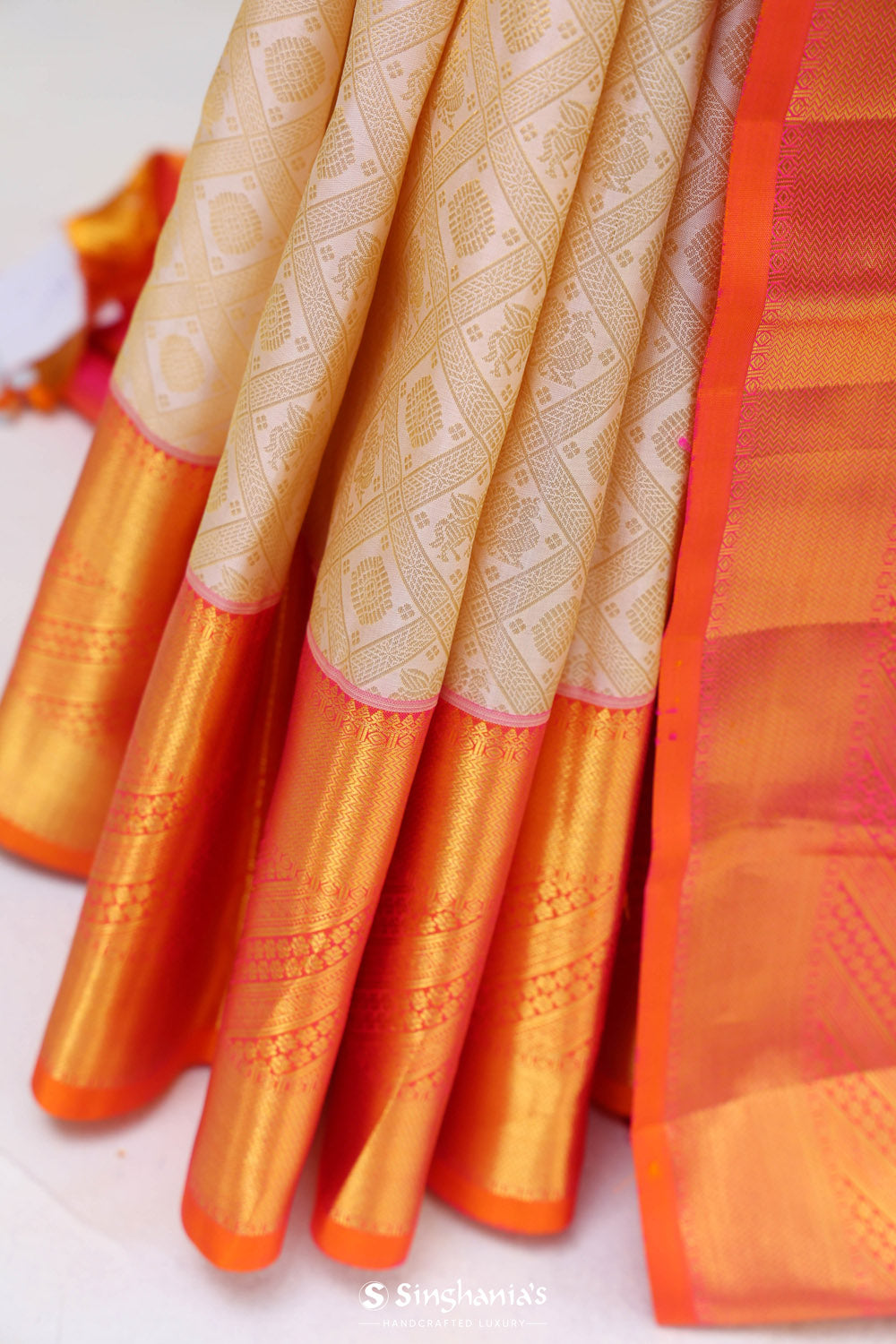 Look stunning at festivals and events in this beautiful seashell white Kanjivaram silk saree. It has a pattern of diamond shapes all over, which creates a base for pretty flowers, horses (kuthirai), and peacocks. It includes a striking border and pallu to impress.