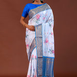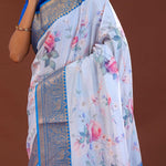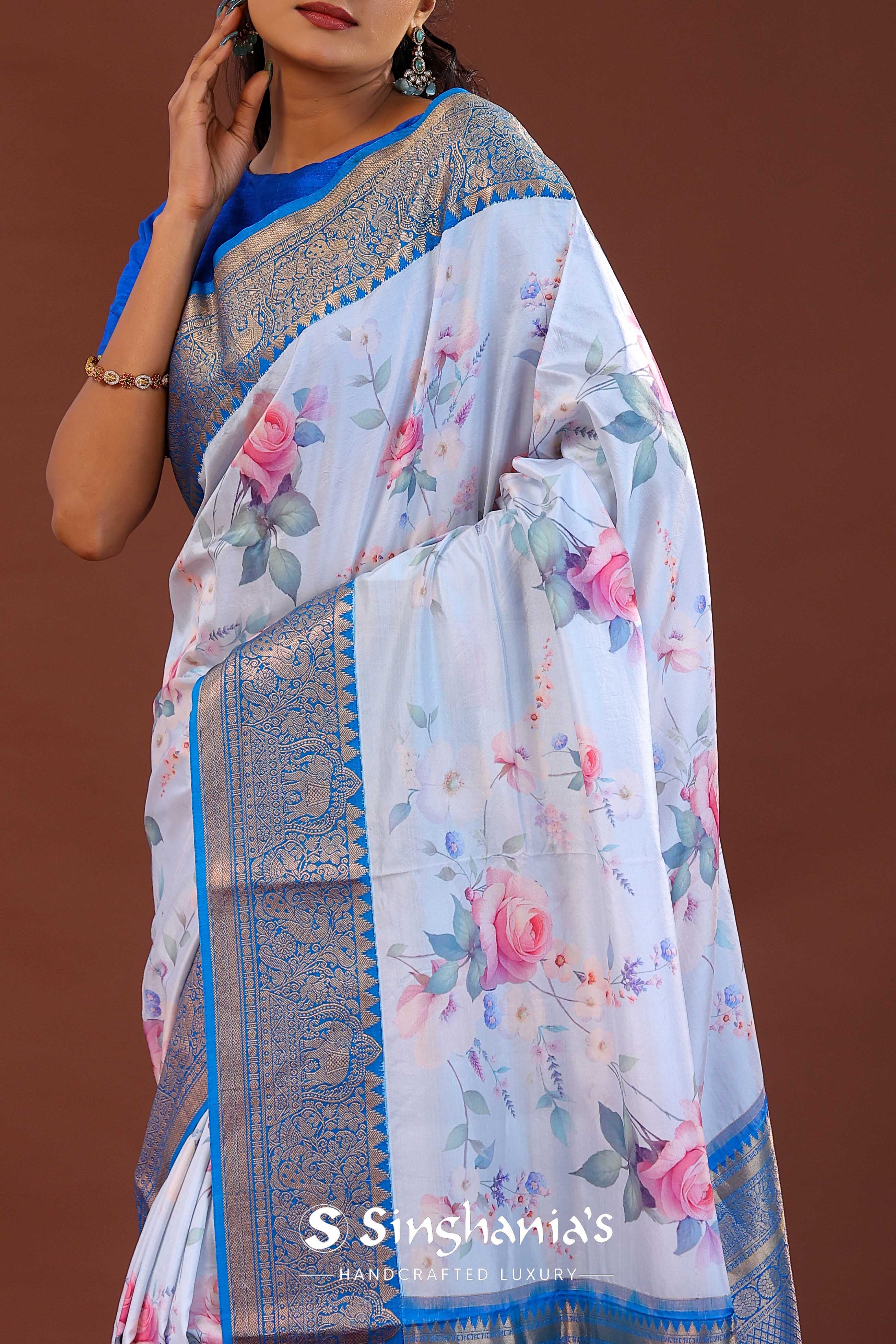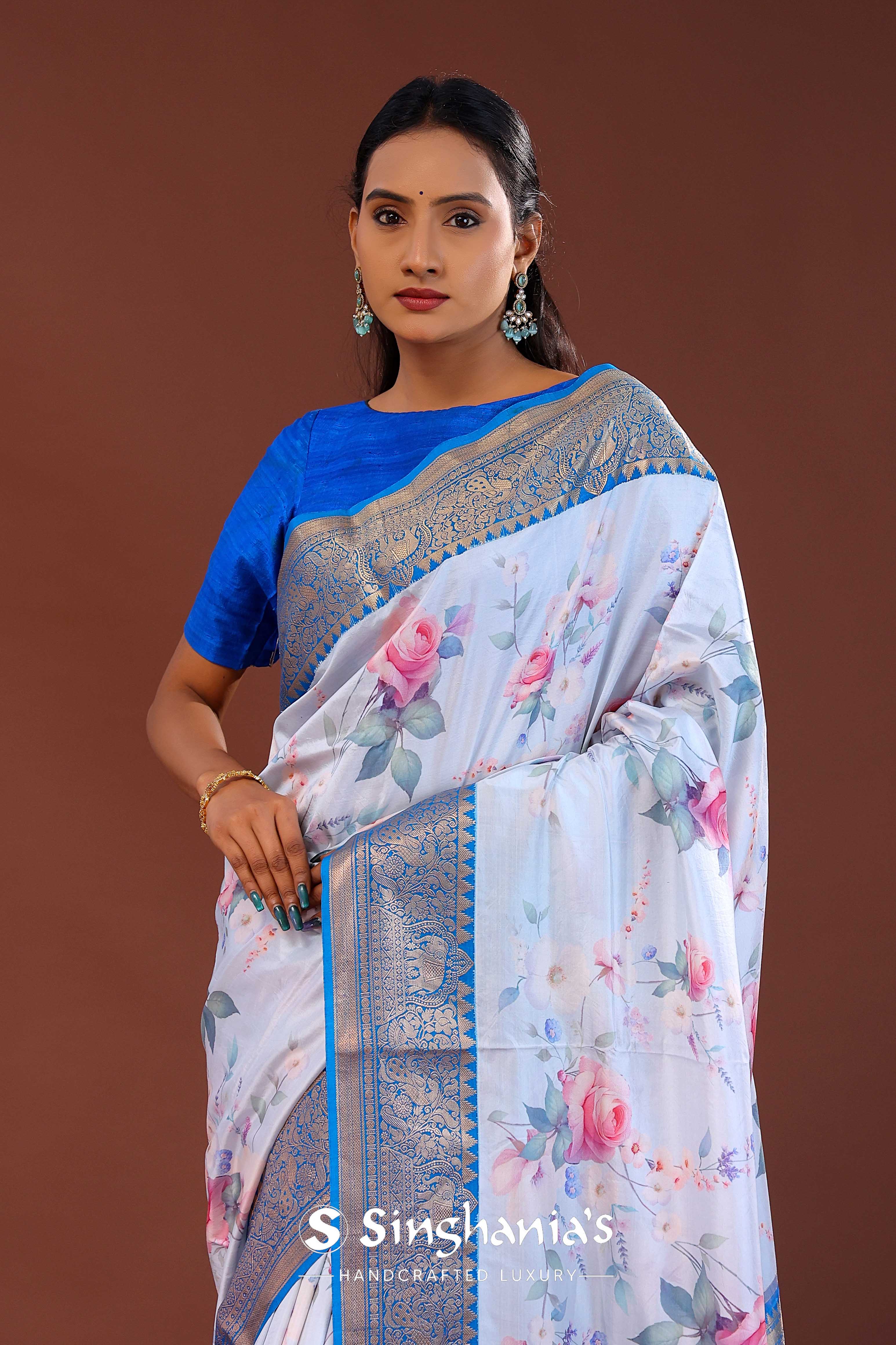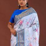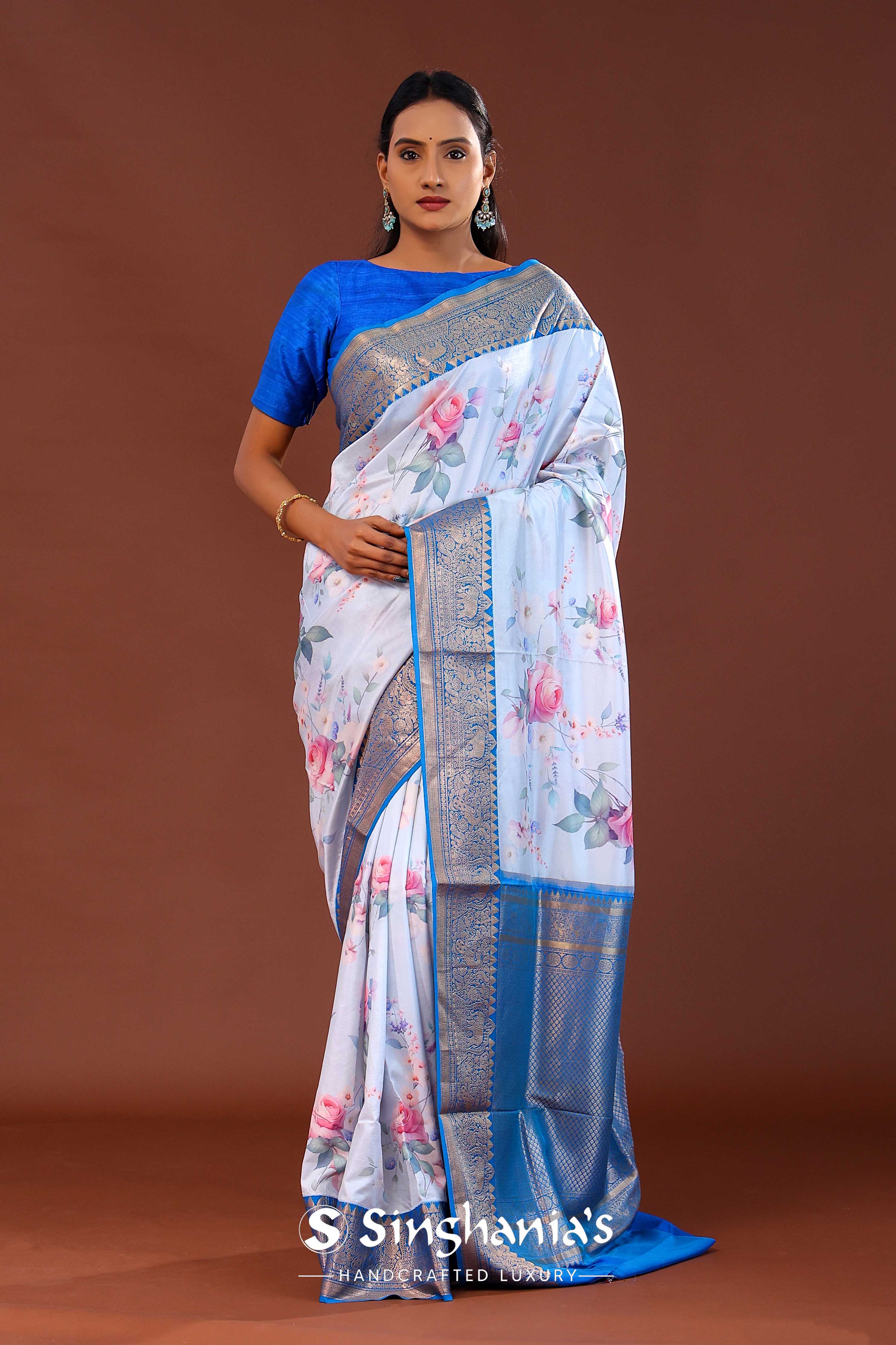 The silk base of the Soft jordy blue digital printed kanjivaram saree features digital prints of rose flower spread across the saree complemented by bright blue border with gold zari work.Ideal for all occasions.