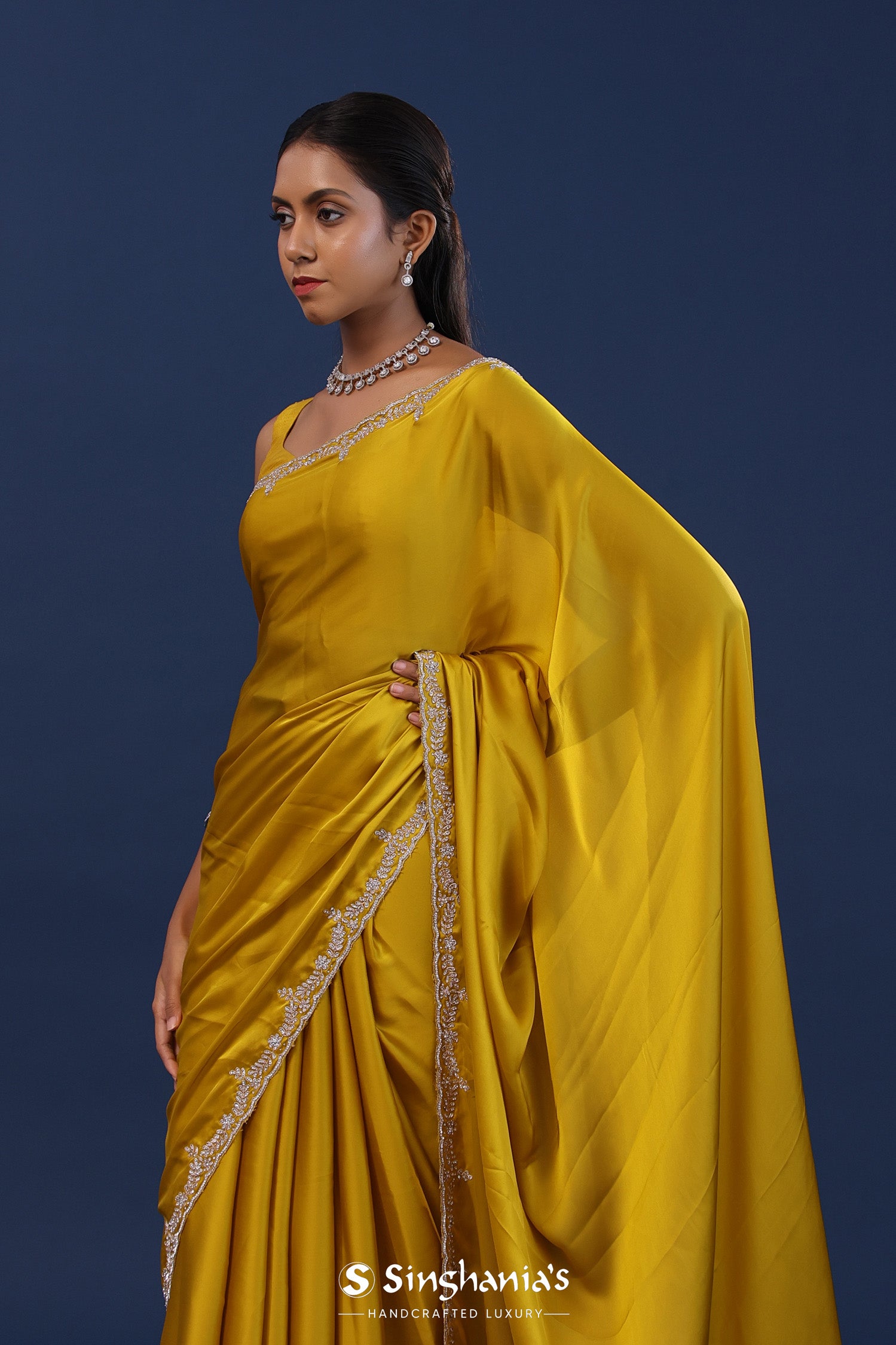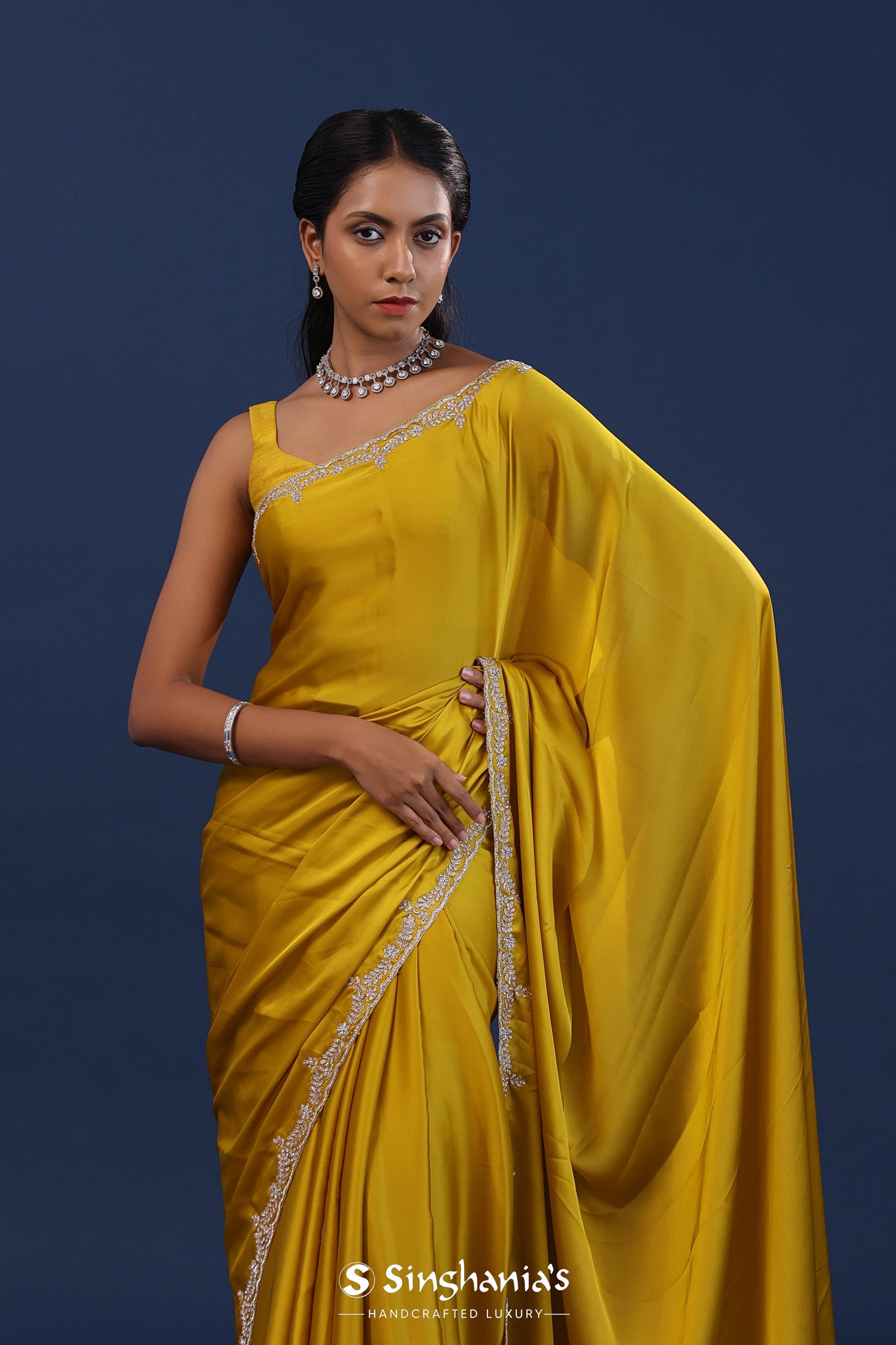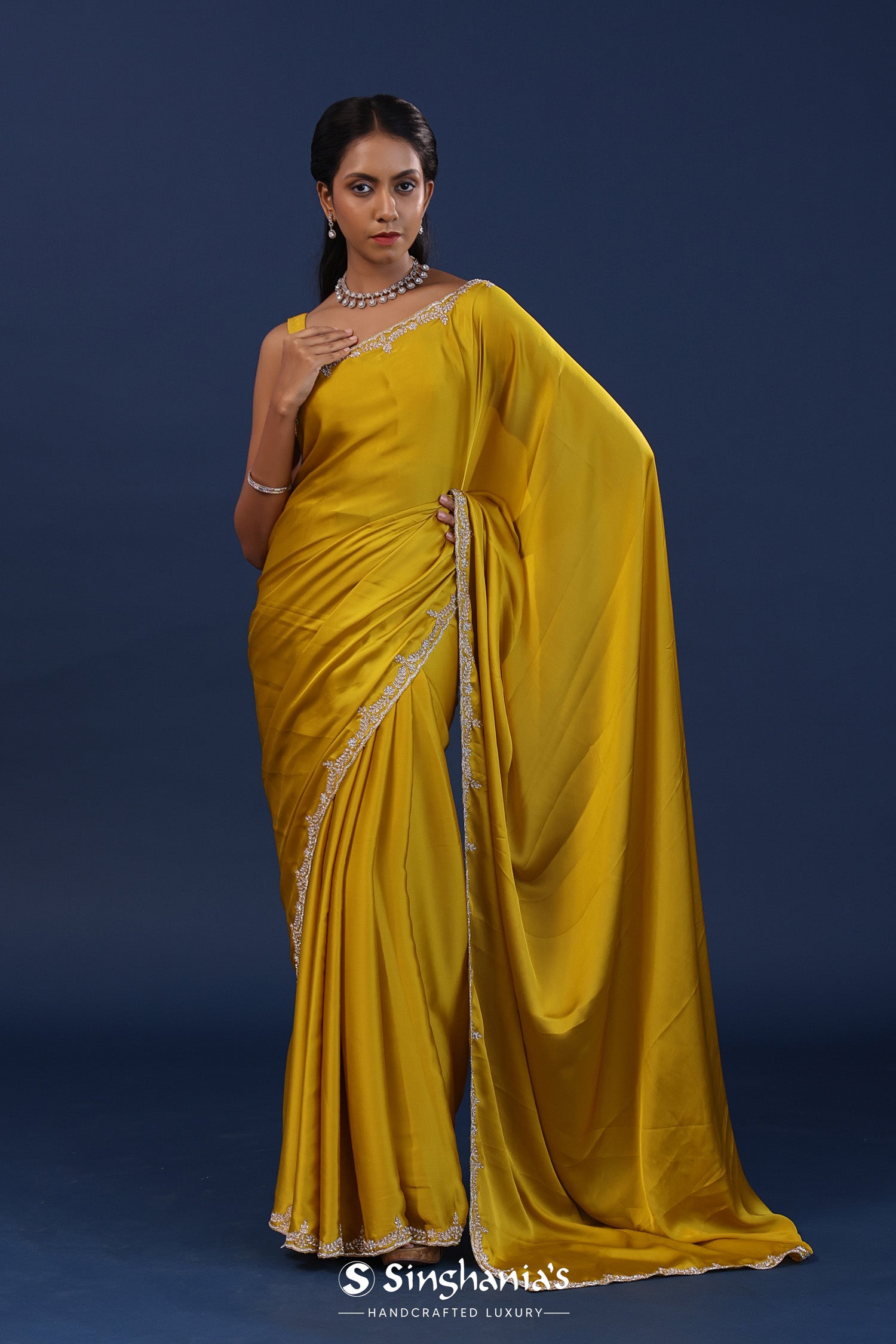 The golden yellow solid satin saree with a thin border with stone embroidery along with an unstitched self blouse for a decent and dignified look.