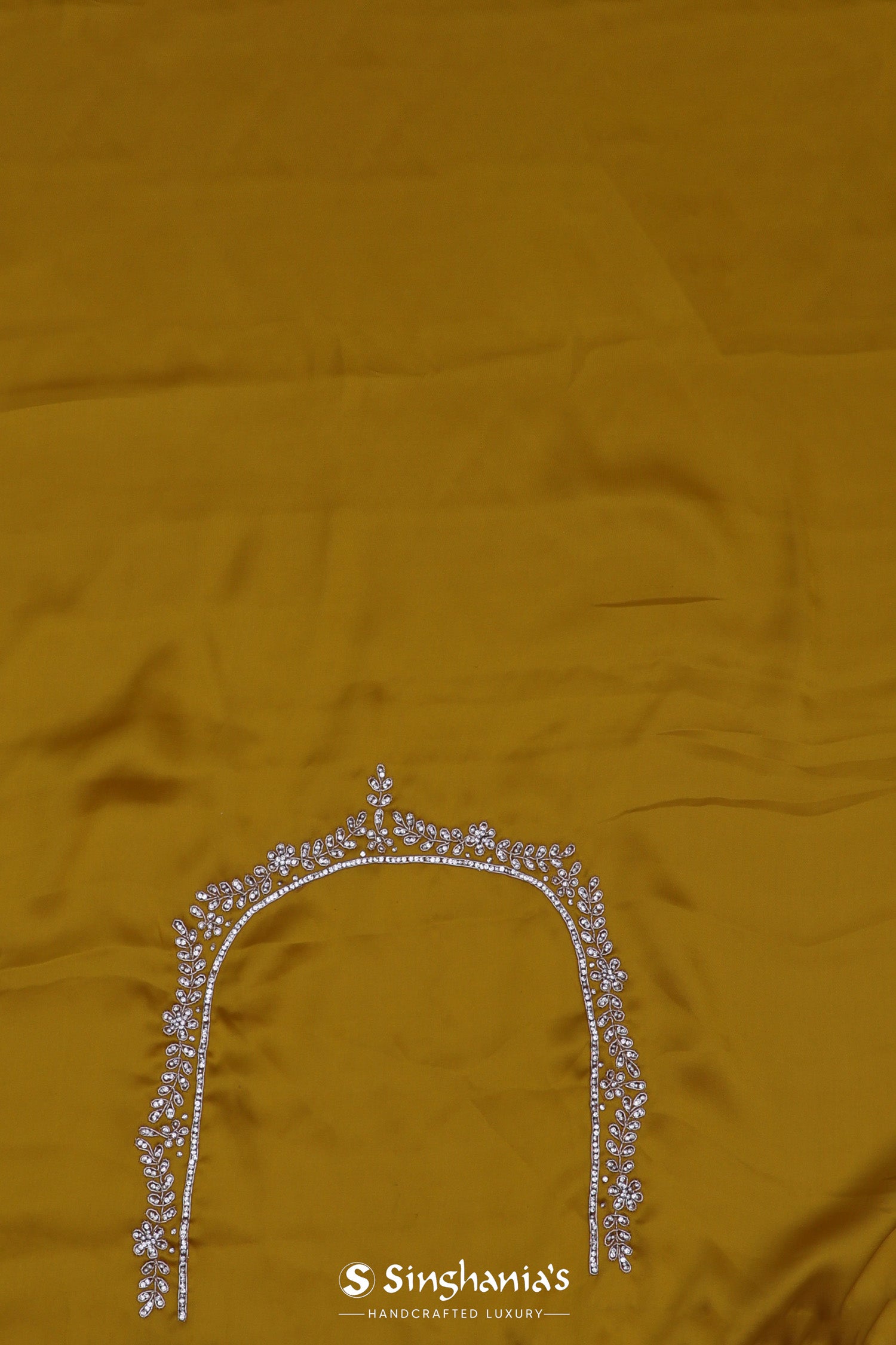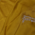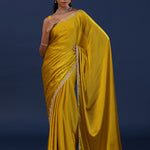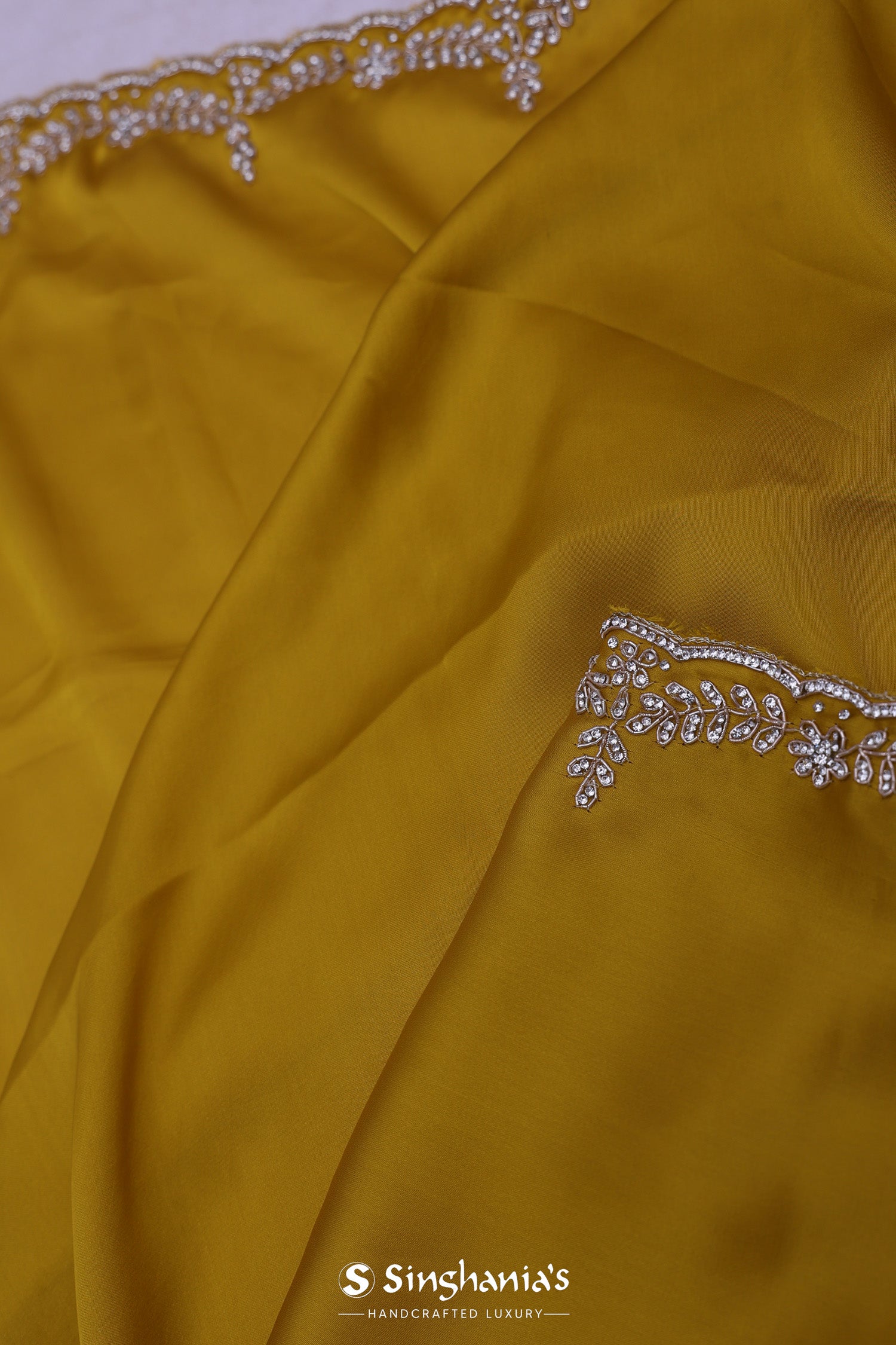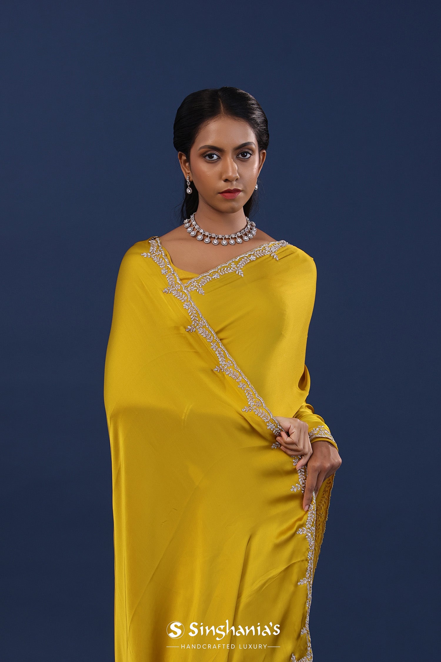 The golden yellow solid satin saree with a thin border with stone embroidery along with an unstitched self blouse for a decent and dignified look.