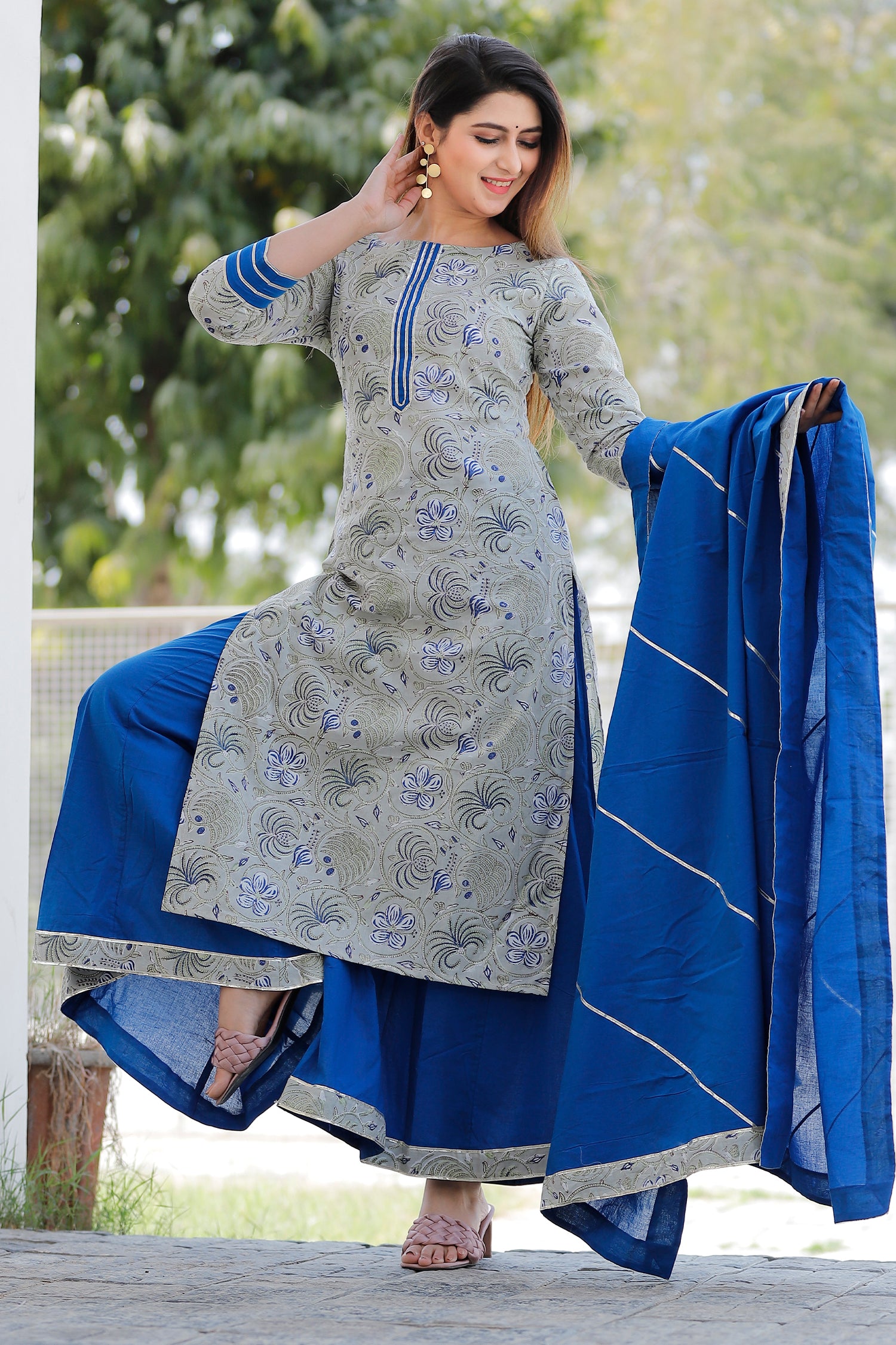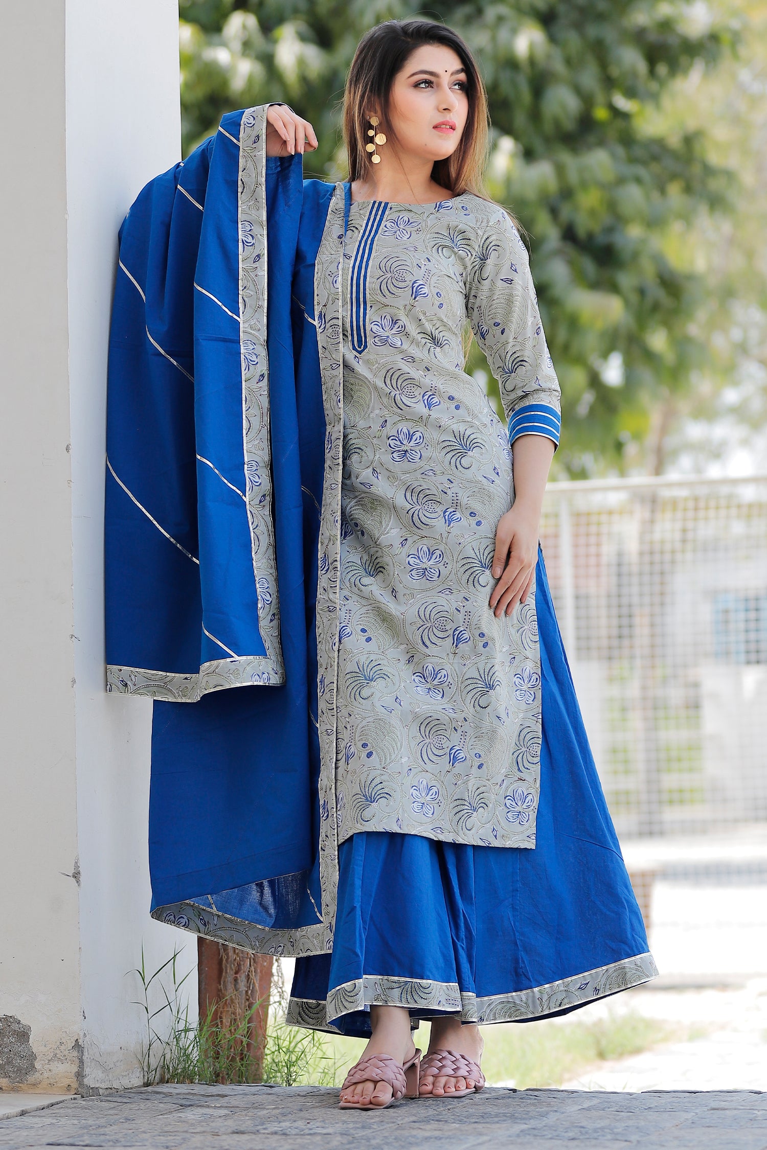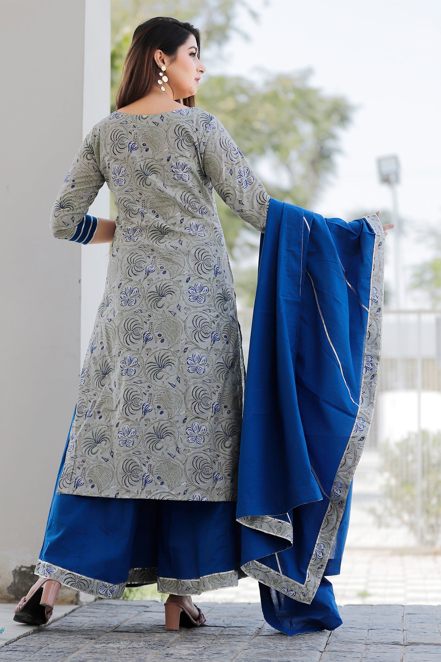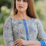 The grey and blue floral printed cotton palazzo and kurta set for a traditional and elegant look with comfortable feel of the cotton fabric.