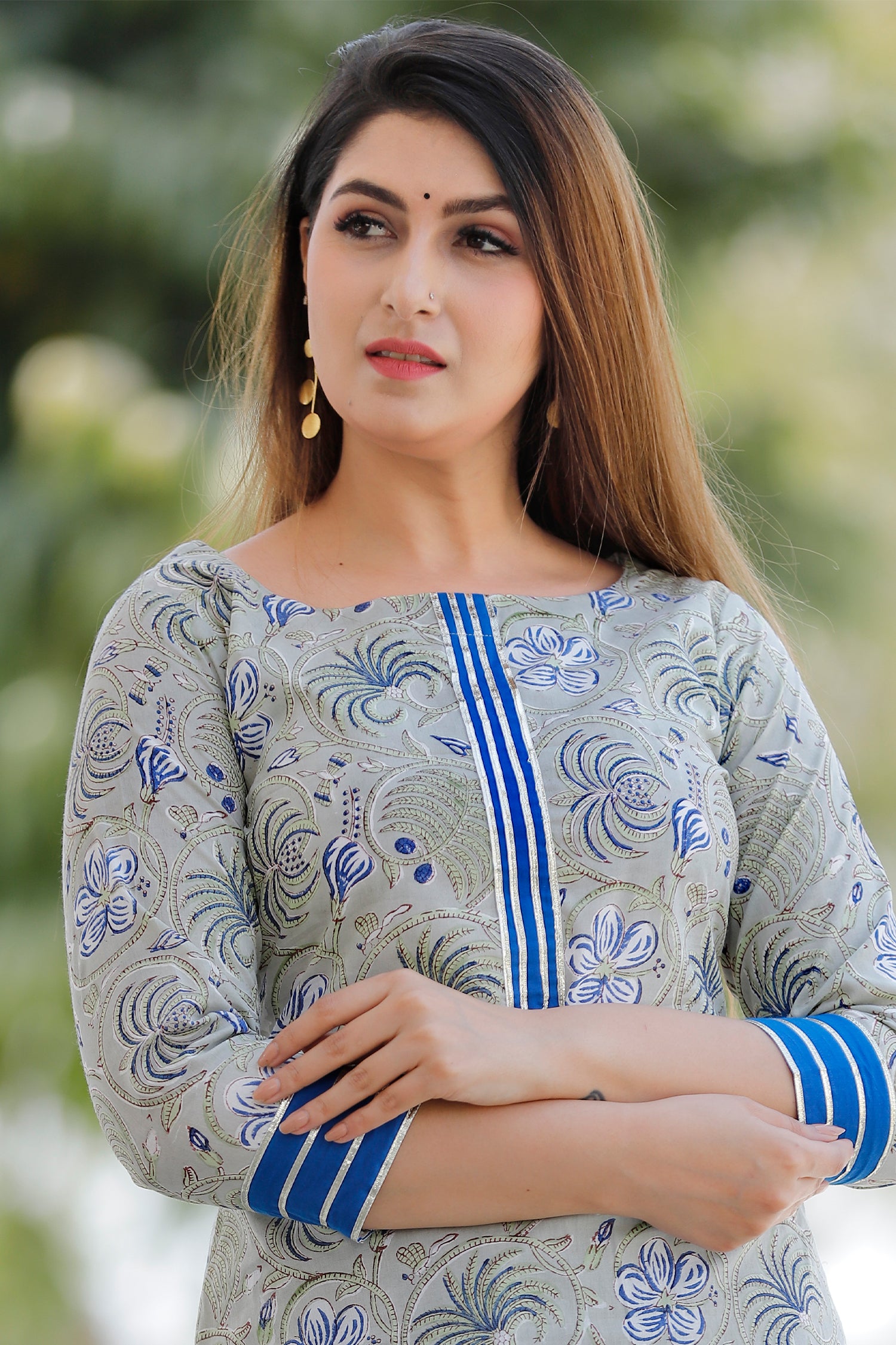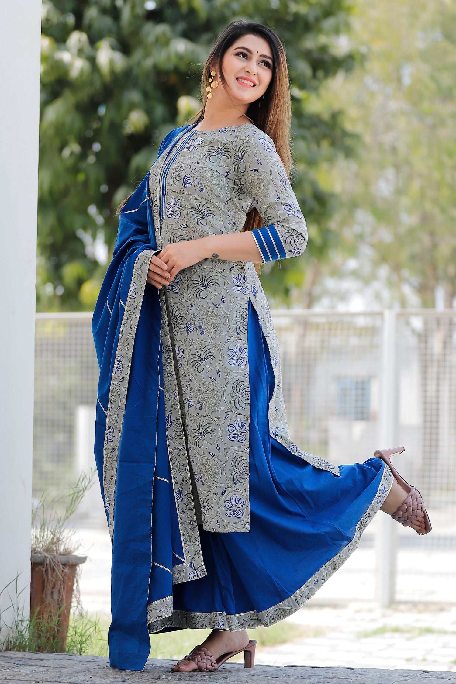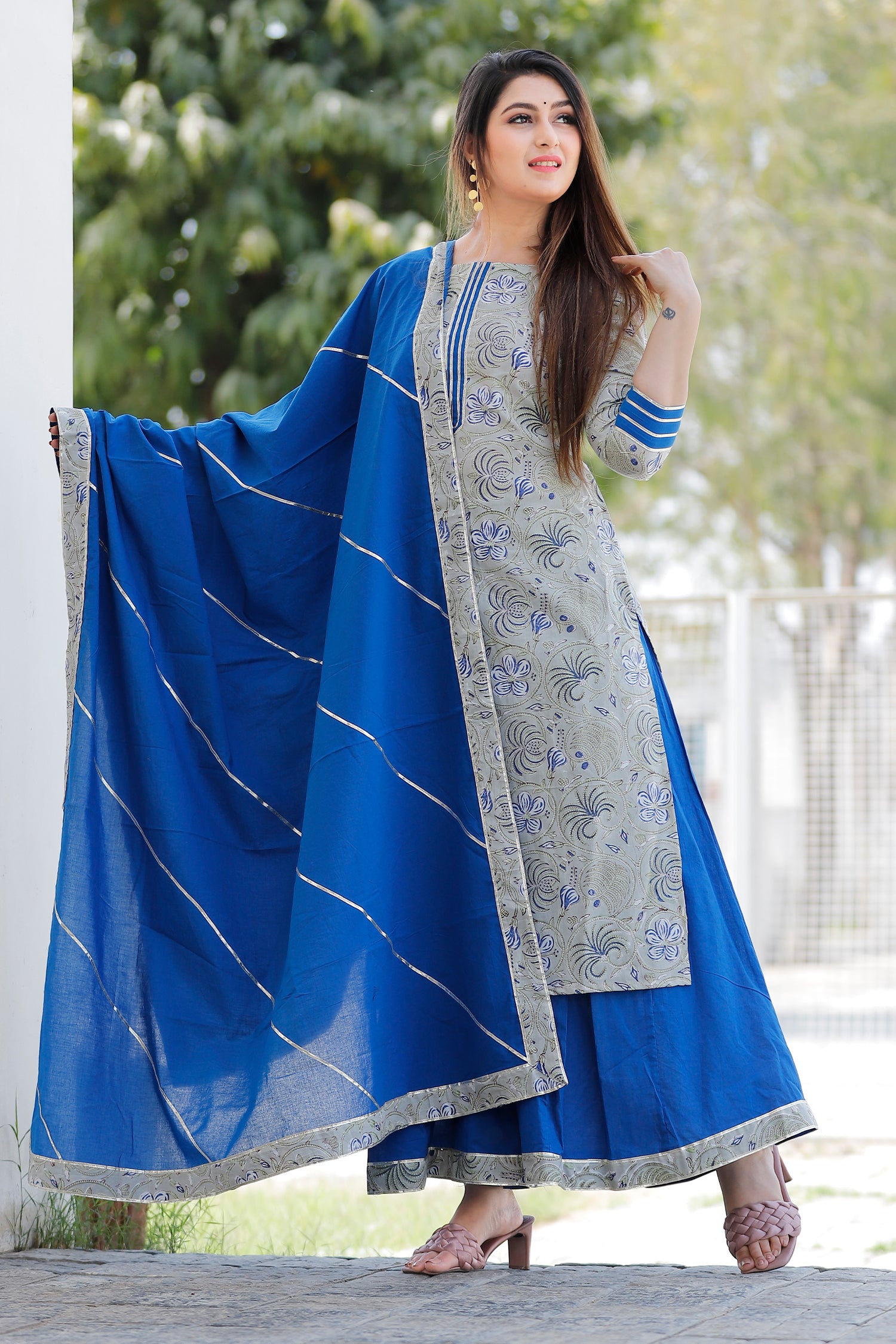 The grey and blue floral printed cotton palazzo and kurta set for a traditional and elegant look with comfortable feel of the cotton fabric.