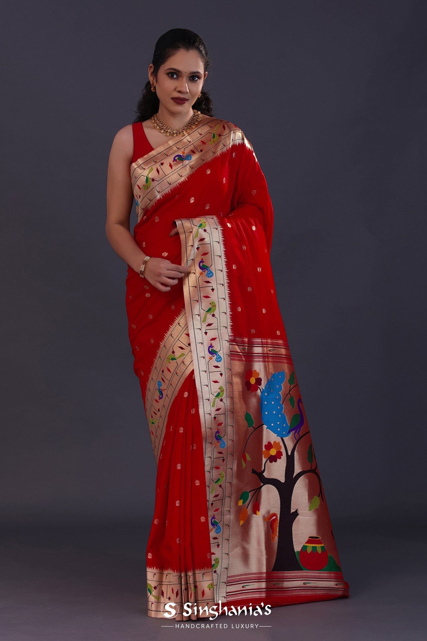 The Japanese maple paithani saree features butti's woven with gold zari complemented with paithani border and unstitched blouse